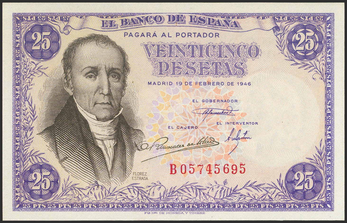 25 Pesetas. 19 de Febrero de 1946. Serie B. (Edifil 2023: 450a). Apresto original. SC.