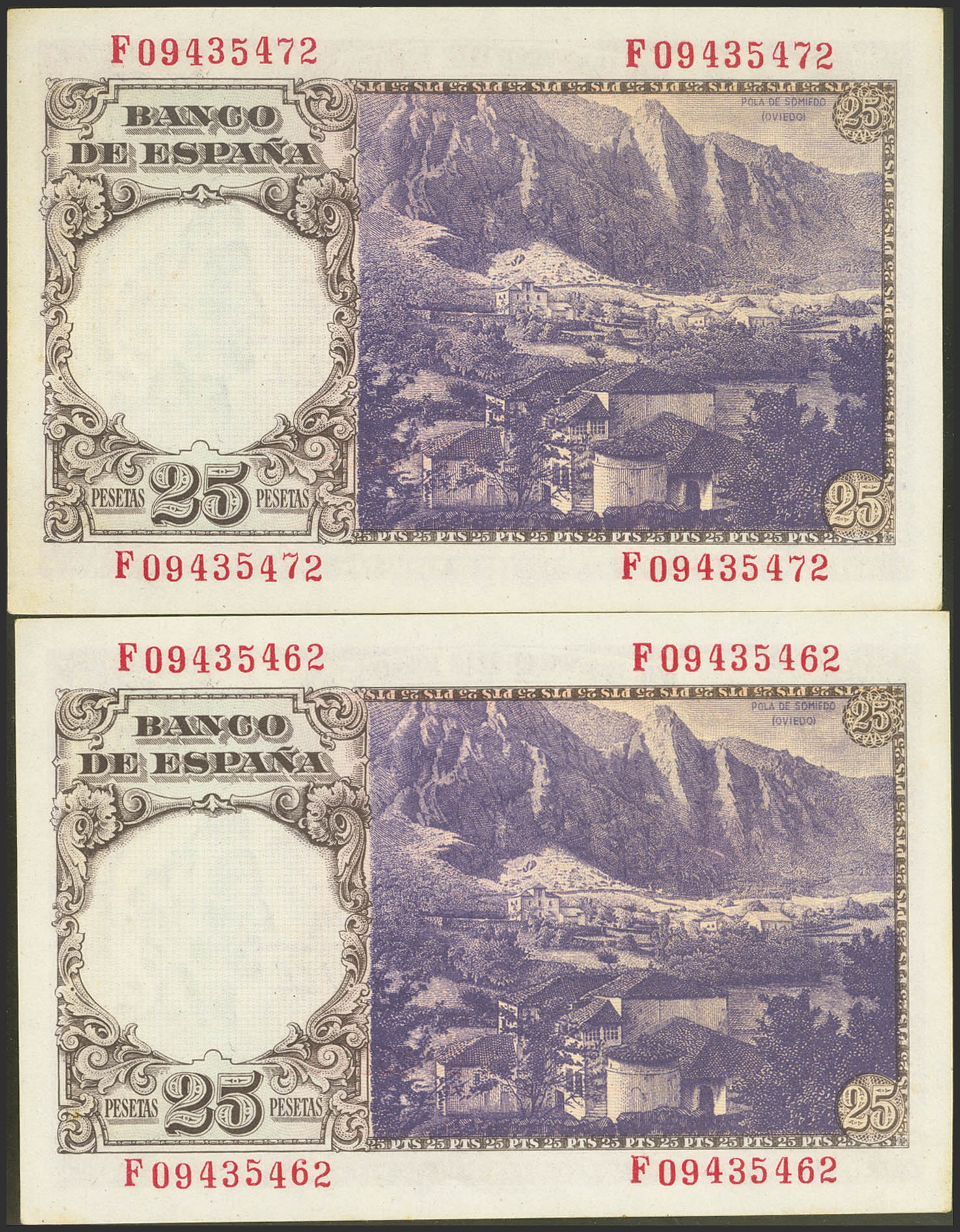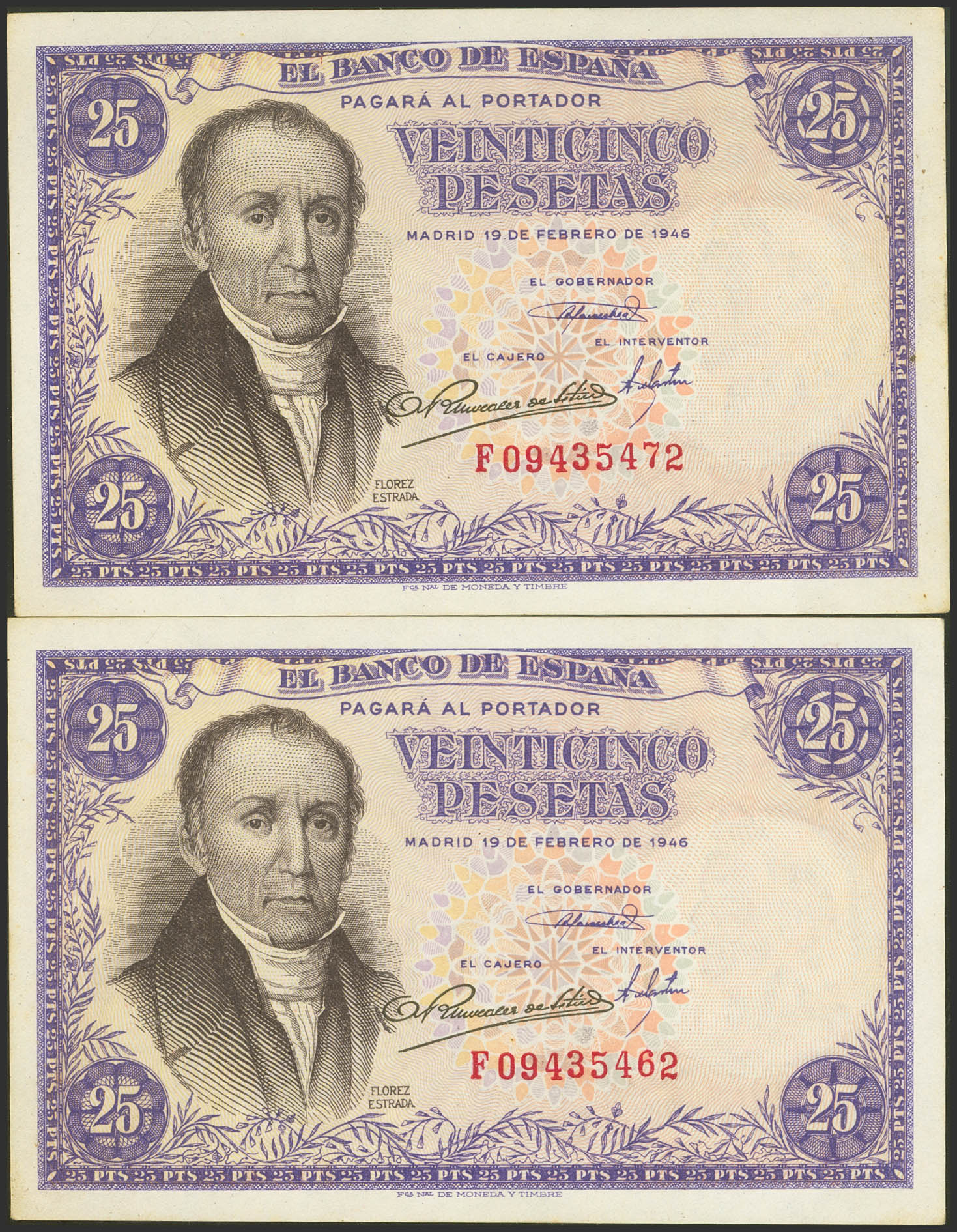 25 Pesetas. 19 de Febrero de 1946. Pareja correlativa. Serie F. (Edifil 2023: 450a). Apresto original. SC-.