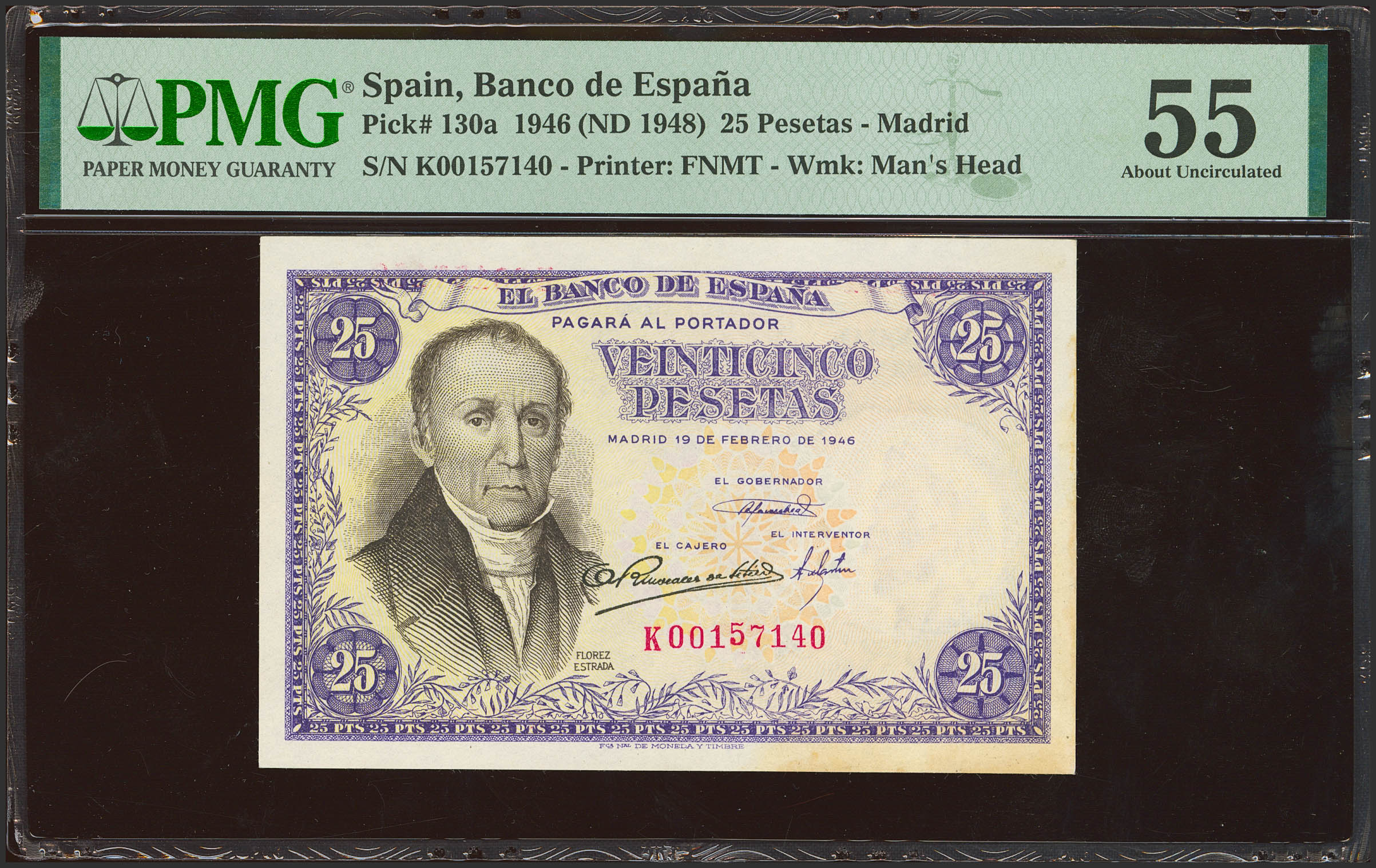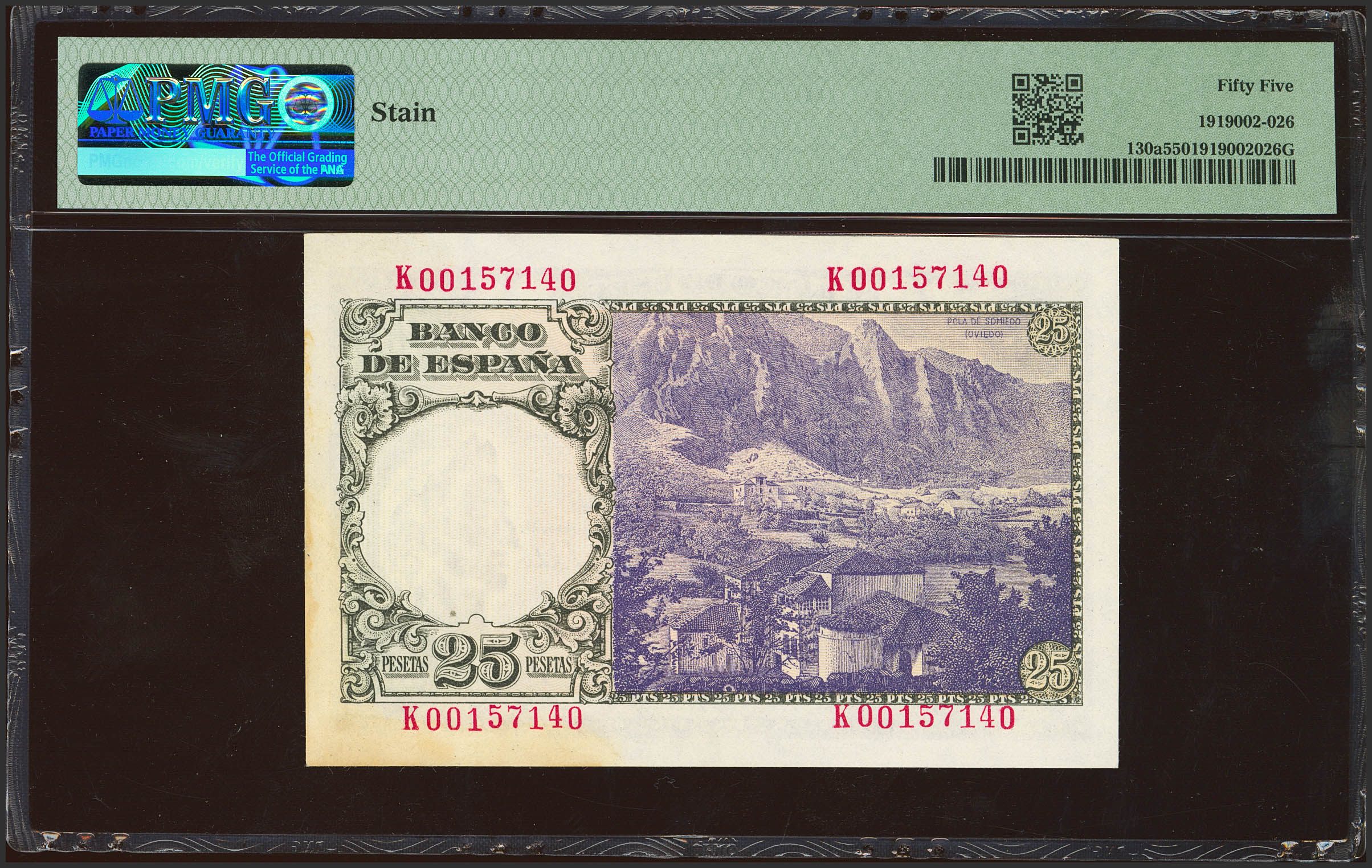 25 Pesetas. 19 de Febrero de 1946. Serie K, última serie emitida. (Edifil 2023: 450a, Pick: 130a). Muy rara serie, para hacernos idea de la rareza de este billete sólo ha sido subastado una vez más por Ibercoin. EBC+. Encapsulado PMG55 (stain).