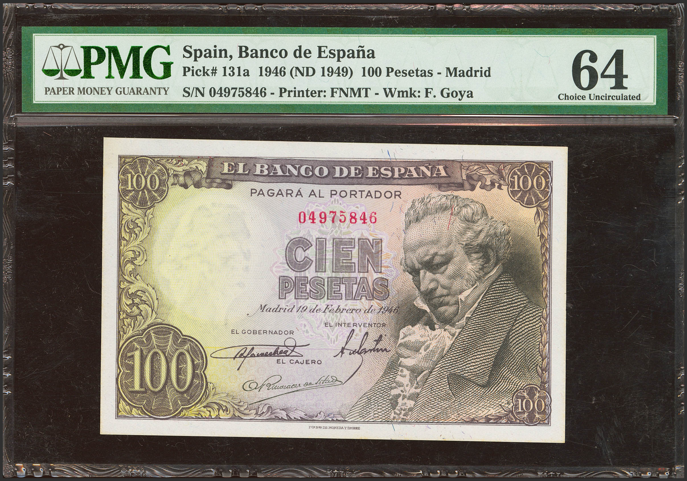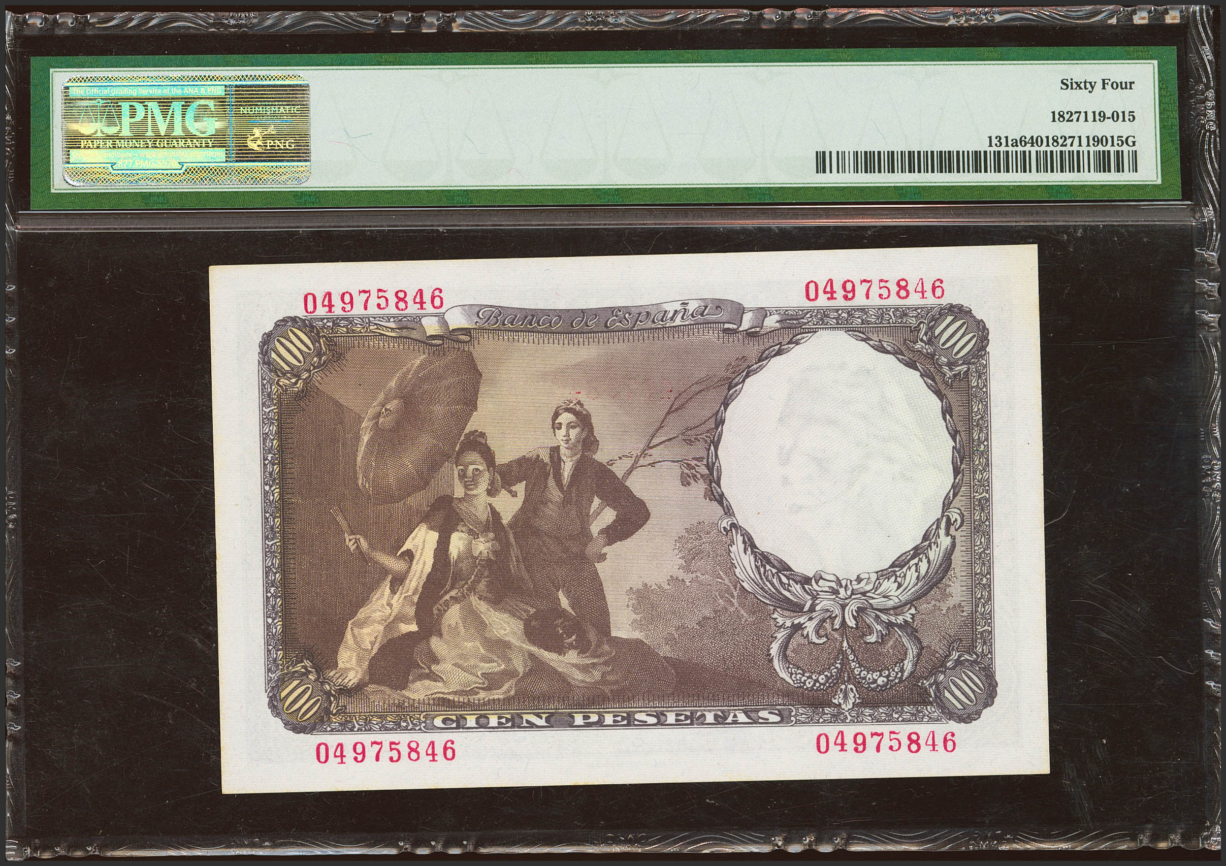 100 Pesetas. 19 de Febrero de 1946. Sin serie. (Edifil 2023: 451, Pick: 131a). Inusual. SC. Encapsulado PMG64.