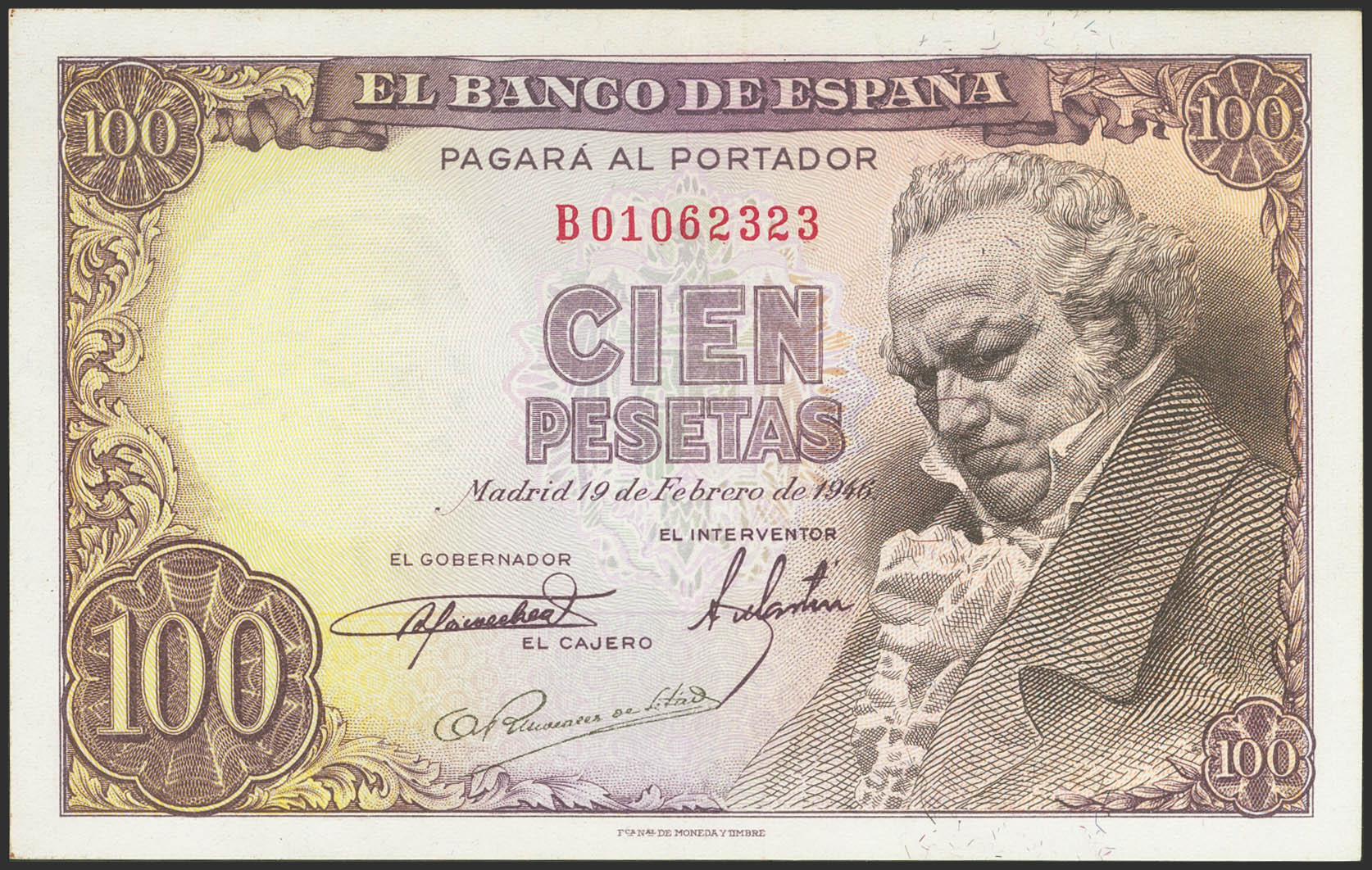 100 Pesetas. 19 de Febrero de 1946. Serie B, última serie emitida. (Edifil 2023: 451b). Conserva parte de su apresto original. EBC-.