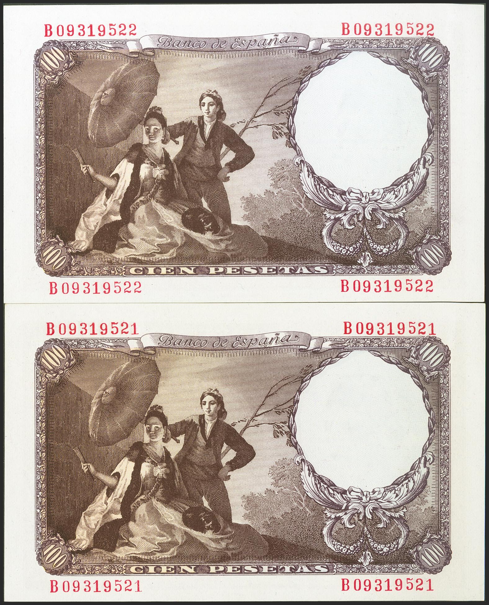100 Pesetas. 19 de Febrero de 1946. Pareja correlativa. Serie B. (Edifil 2021: 451b). Raro, conserva todo su apresto original. SC/SC-.