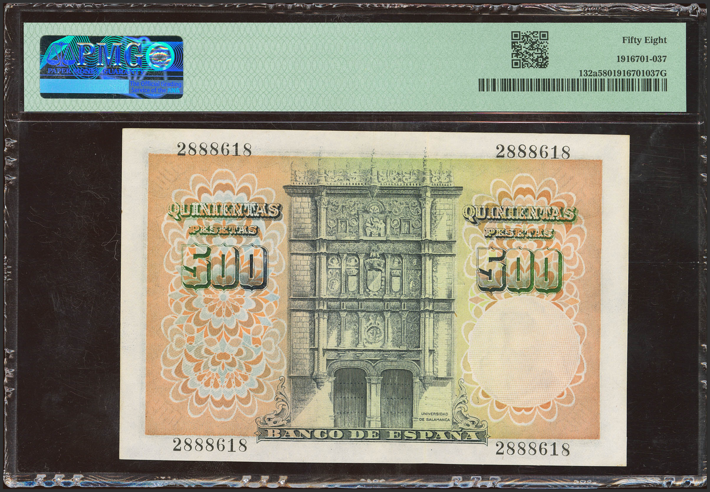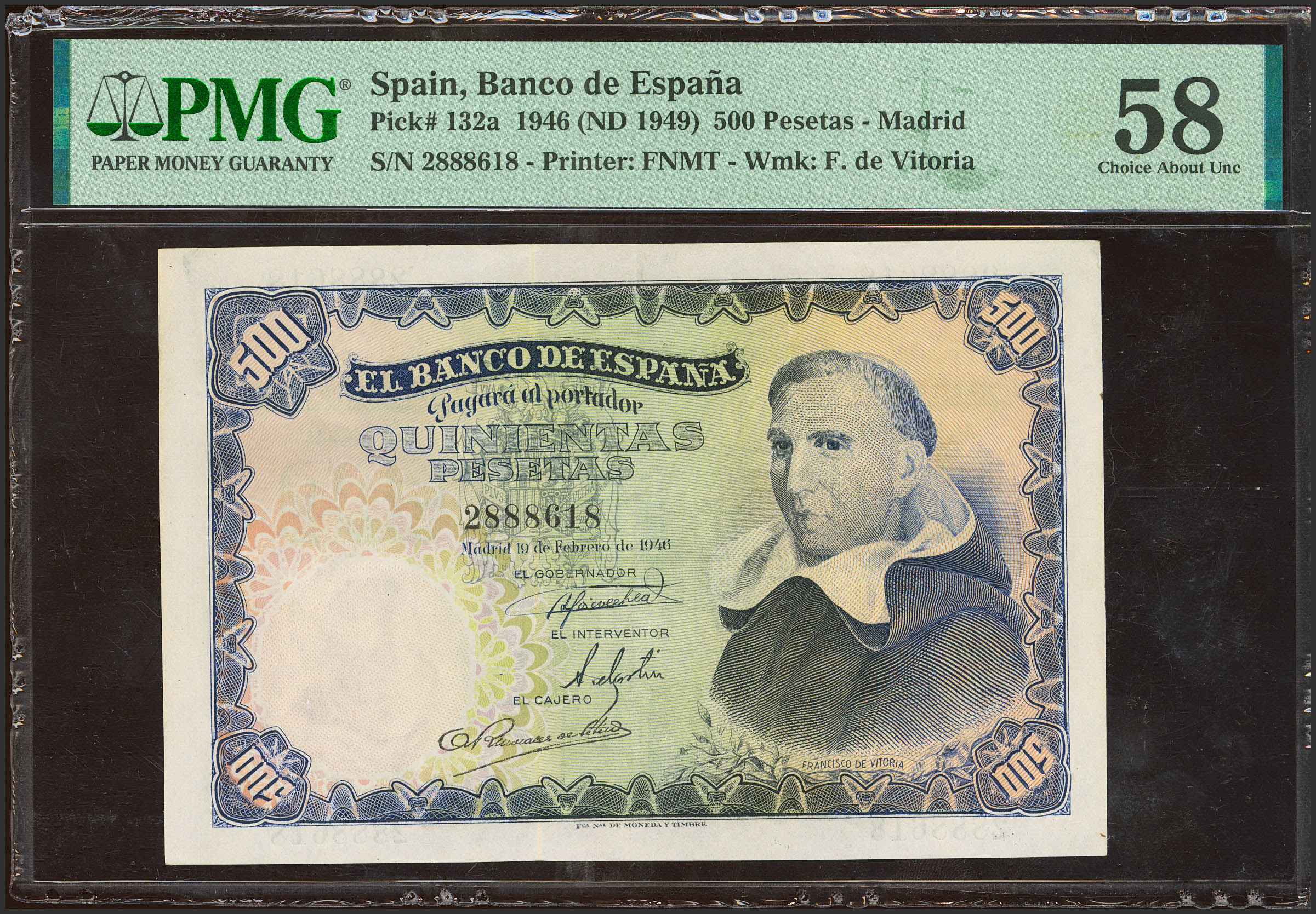 500 Pesetas. 19 de Febrero de 1946. Sin serie. (Edifil 2023: 452, Pick: 132a). Raro en esta calidad. EBC++. Encapsulado PMG58.