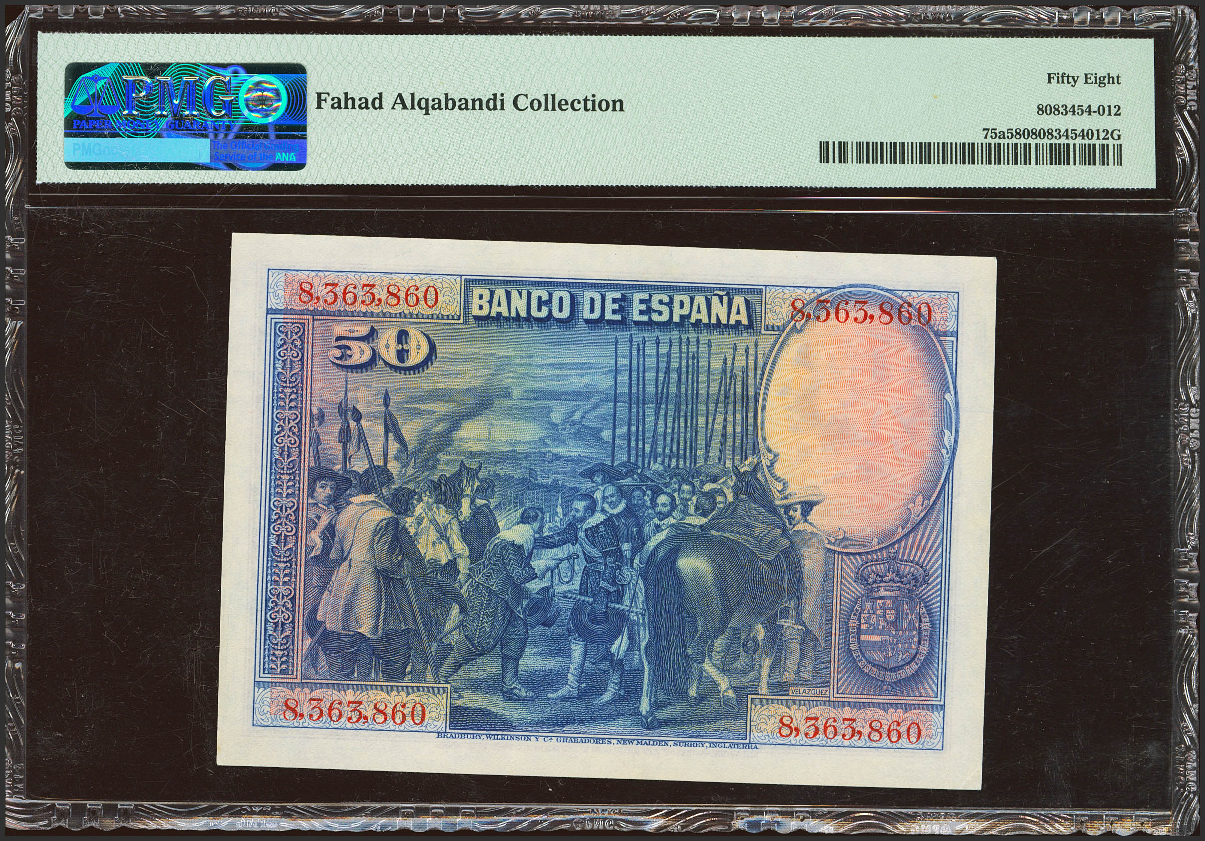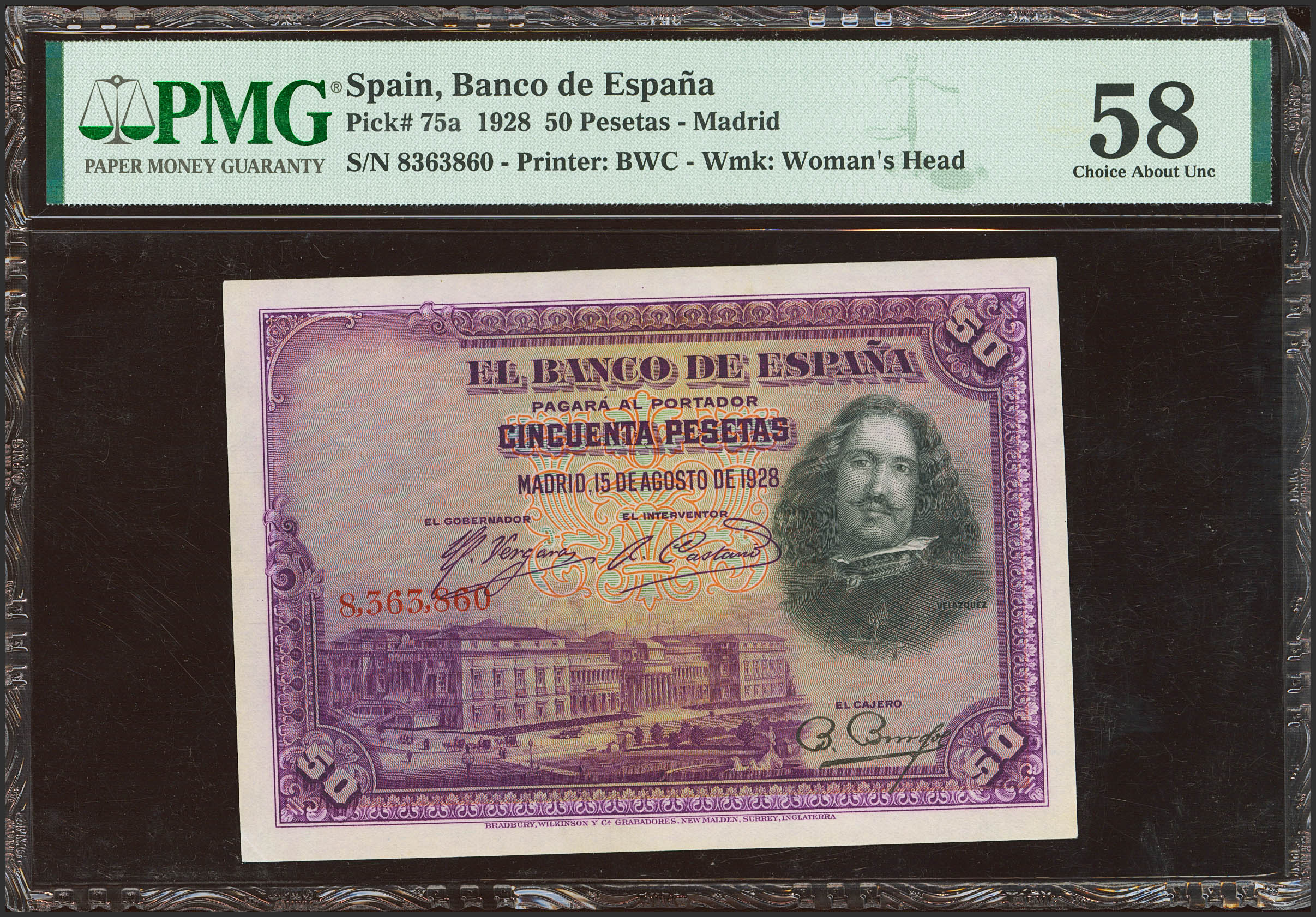 50 Pesetas. 15 de Agosto de 1928. Sin serie. (Edifil 2021: 329, Pick: 75a). Inusual, especialmente en esta calidad. EBC++. Encapsulado PMG58.