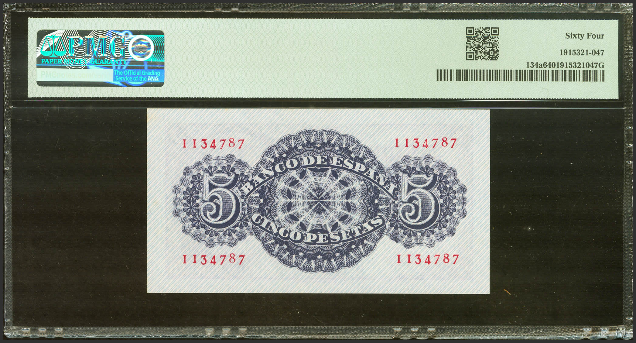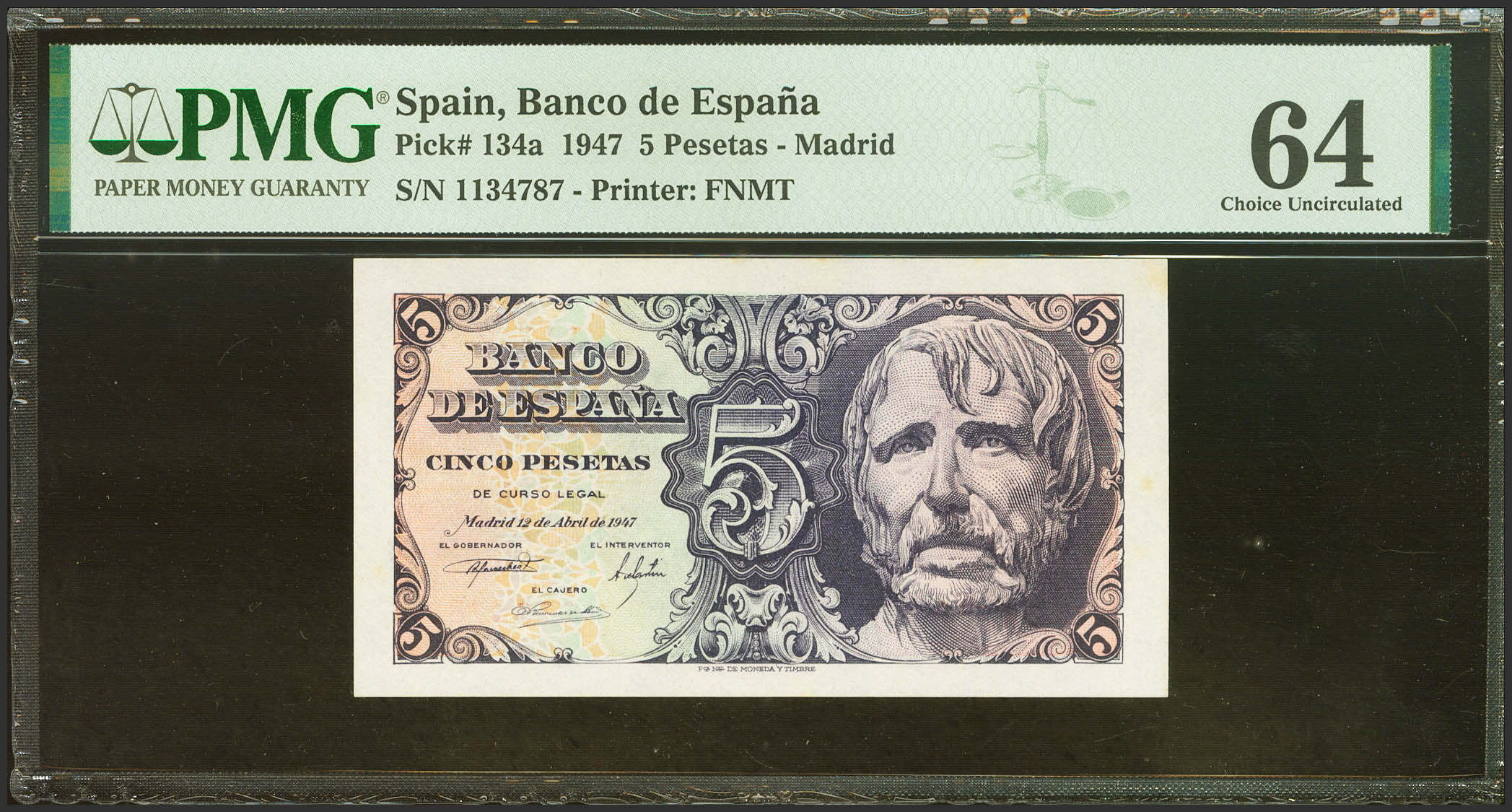 5 Pesetas. 12 de Abril de 1947. Sin serie. (Edifil 2023: 454, Pick: 134a). SC. Encapsulado PMG64.