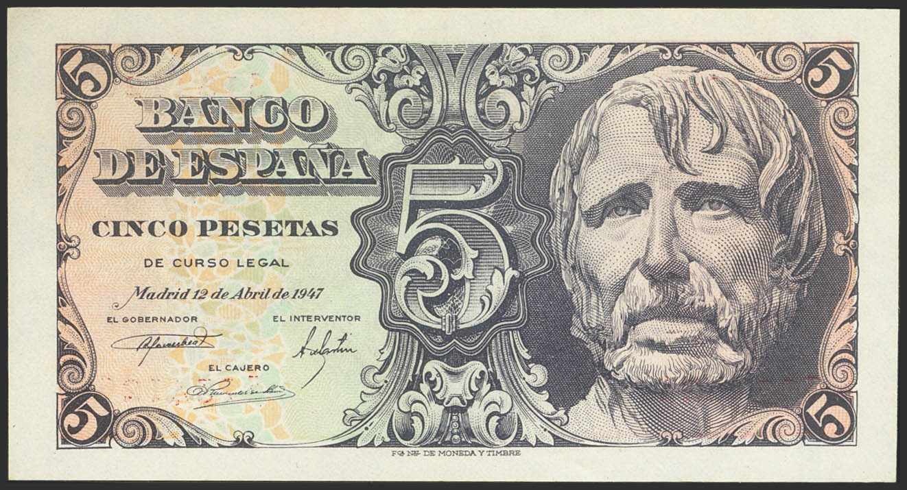 5 Pesetas. 12 de Abril de 1947. Sin serie. (Edifil 2023: 454). Apresto original. SC-.