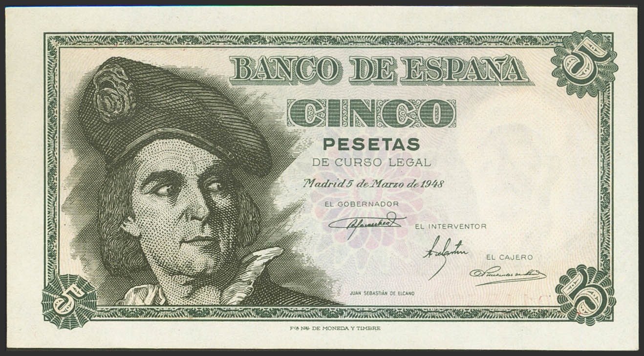 5 Pesetas. 5 de Marzo de 1948. Serie L. (Edifil 2023: 455a). Apresto original. SC.