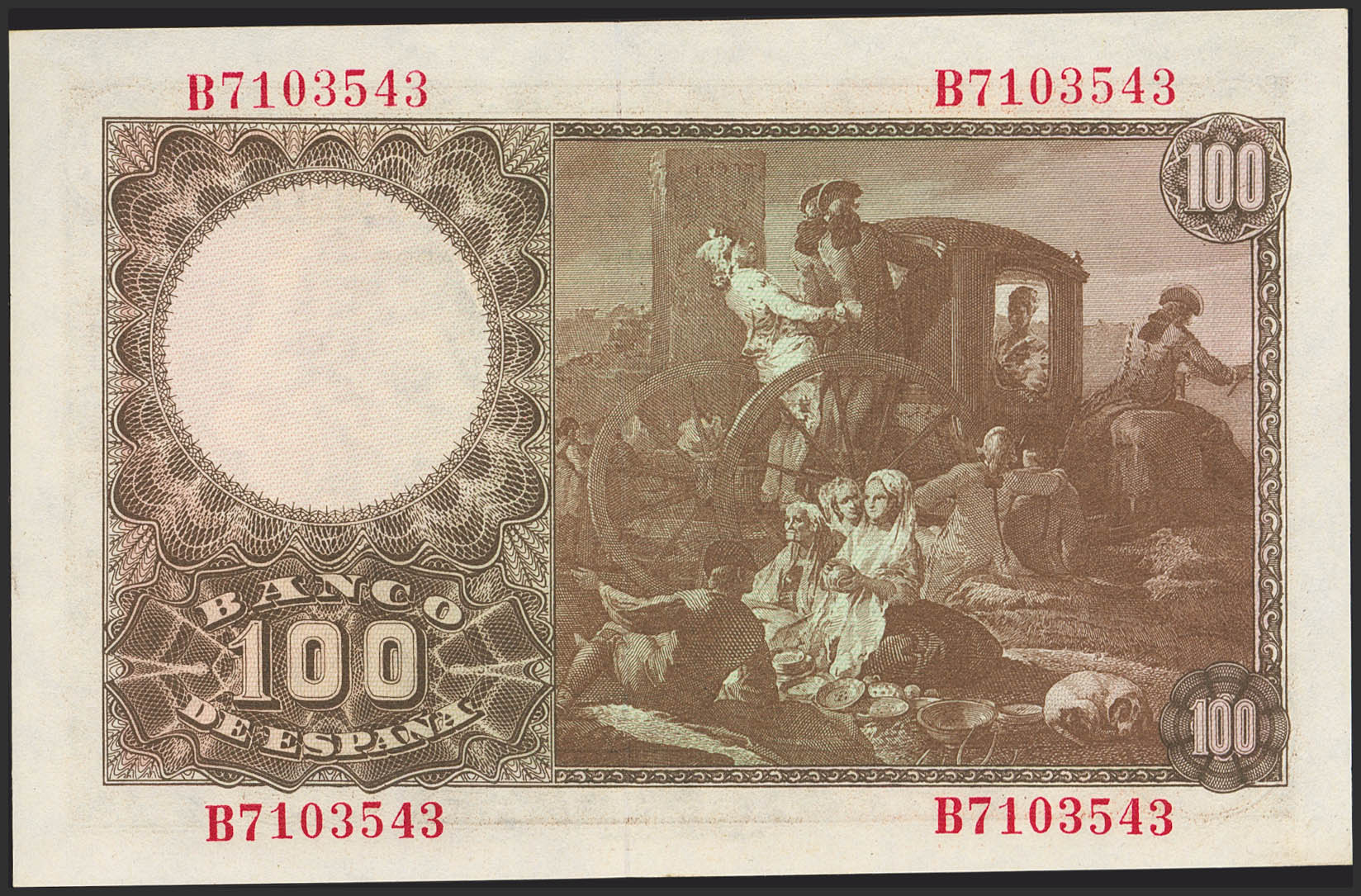 100 Pesetas. 2 de Mayo de 1948. Serie B. (Edifil 2023: 456a). Conserva gran parte de su apresto original. SC--.