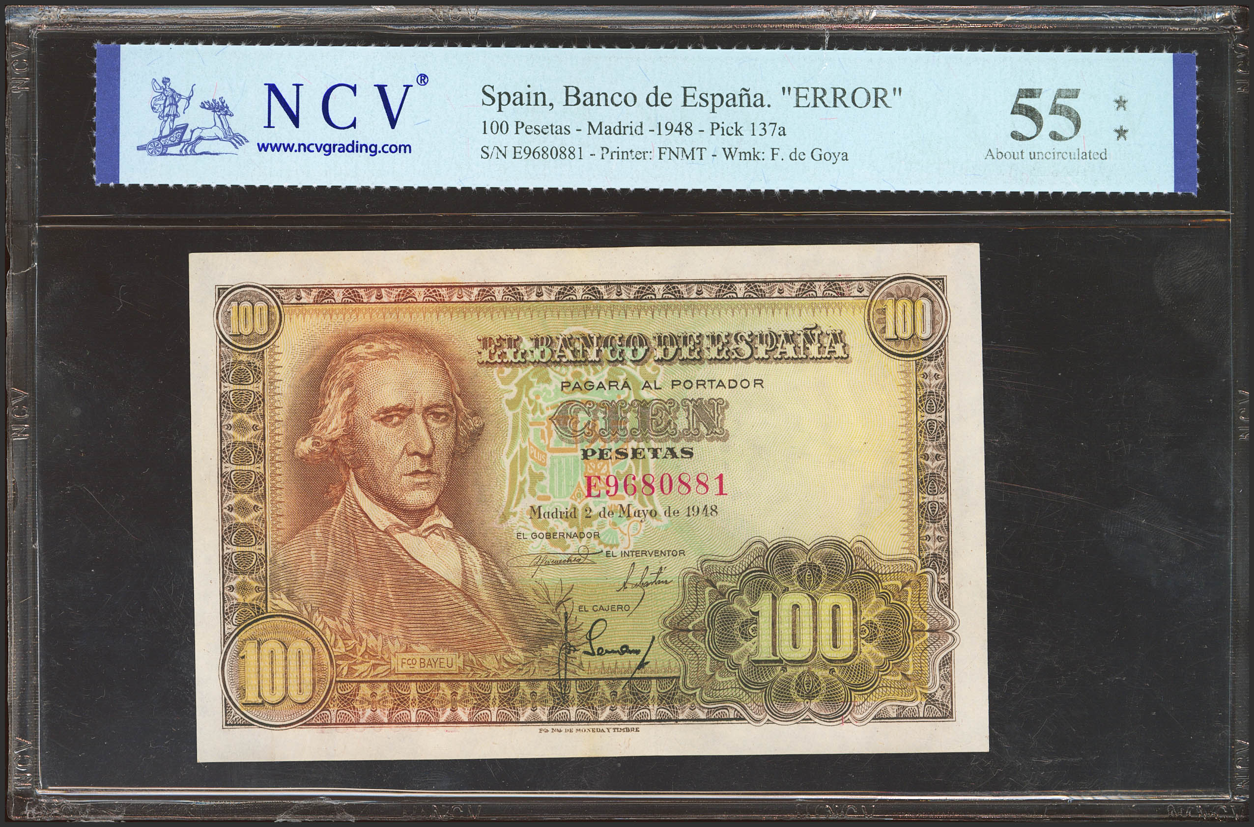 100 Pesetas. 2 de Mayo de 1948. Serie F. (Edifil 2023: 456a, Pick: 137a). EBC+. Encapsulado NCV55.