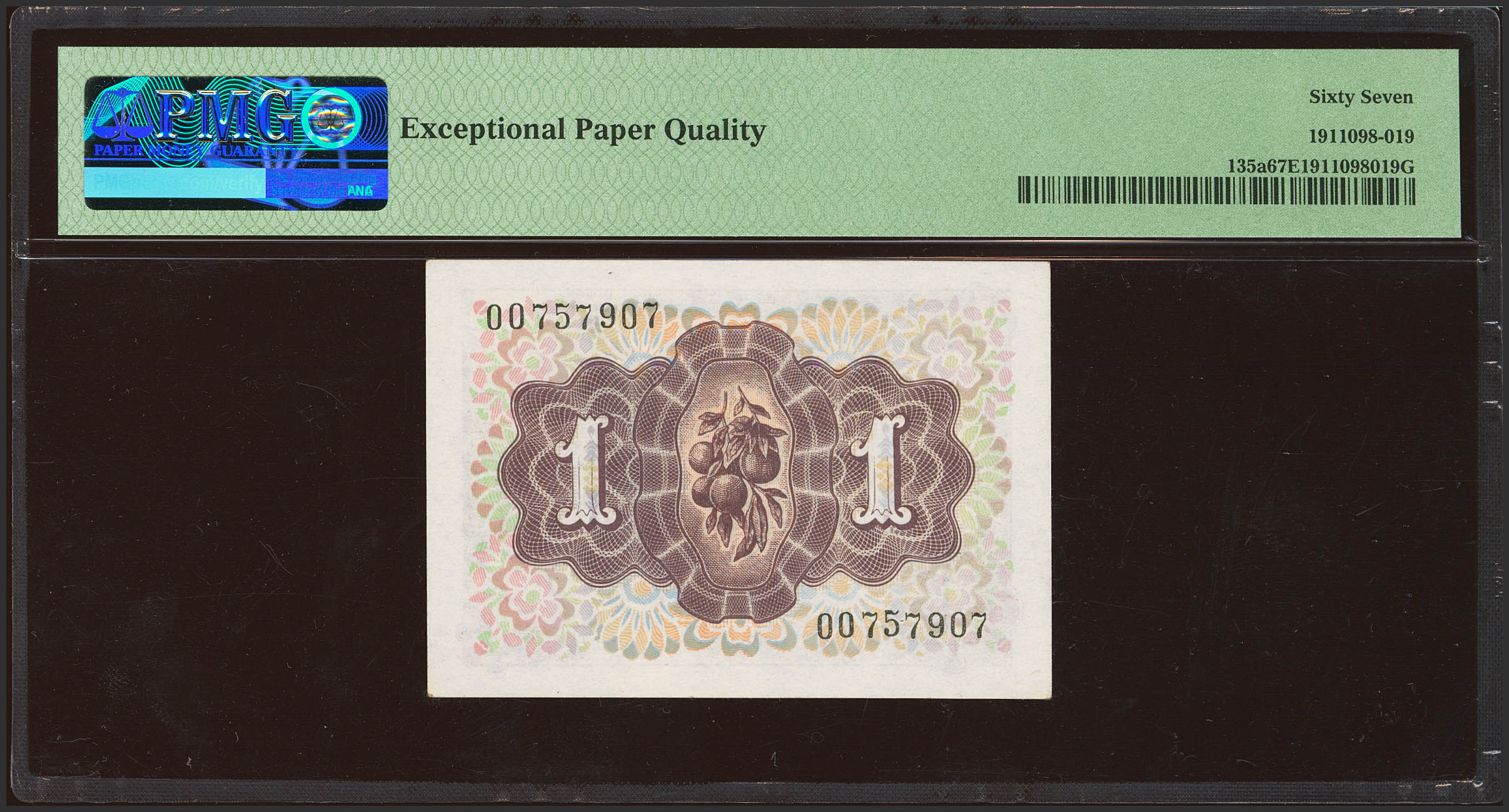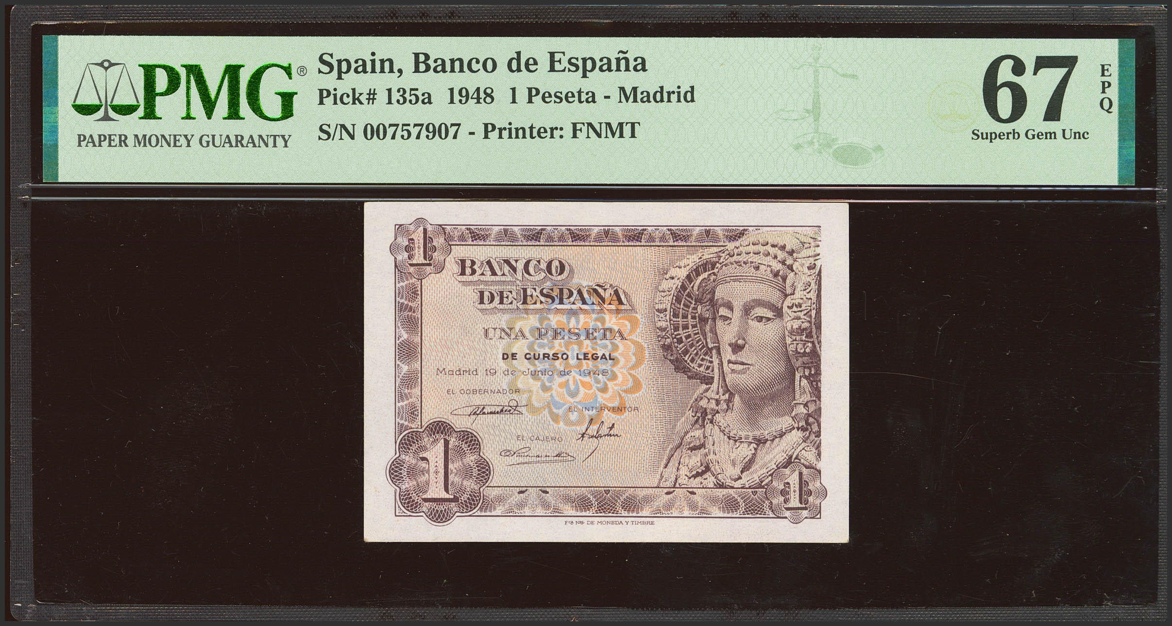 1 Peseta. 19 de Junio de 1948. Sin serie. (Edifil 2023: 457, Pick: 135a). Apresto original. SC. Encapsulado PMG67EPQ.