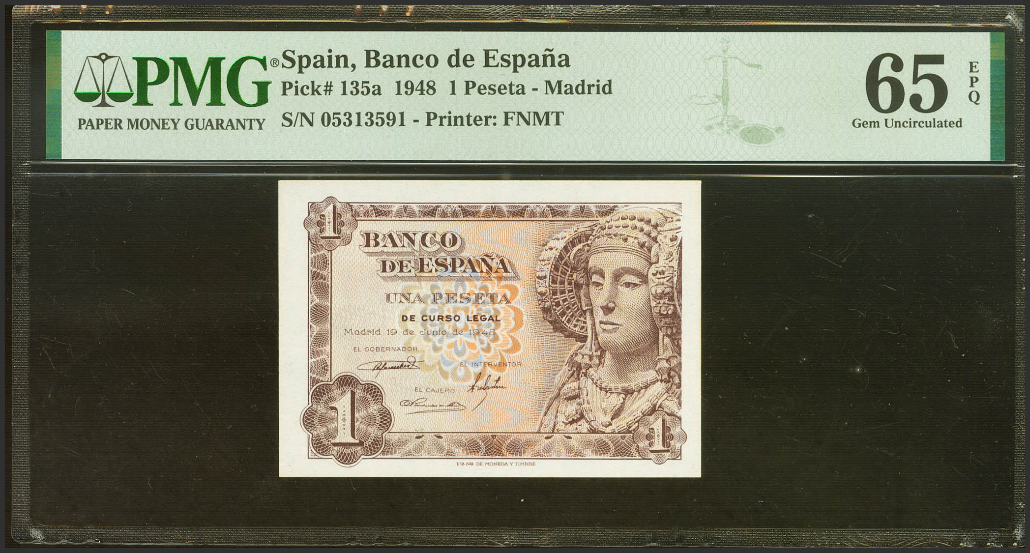 1 Peseta. 19 de Junio de 1948. Sin serie. (Edifil 2021: 457, Pick: 135a). Apresto original. SC. Encapsulado PMG65EPQ.
