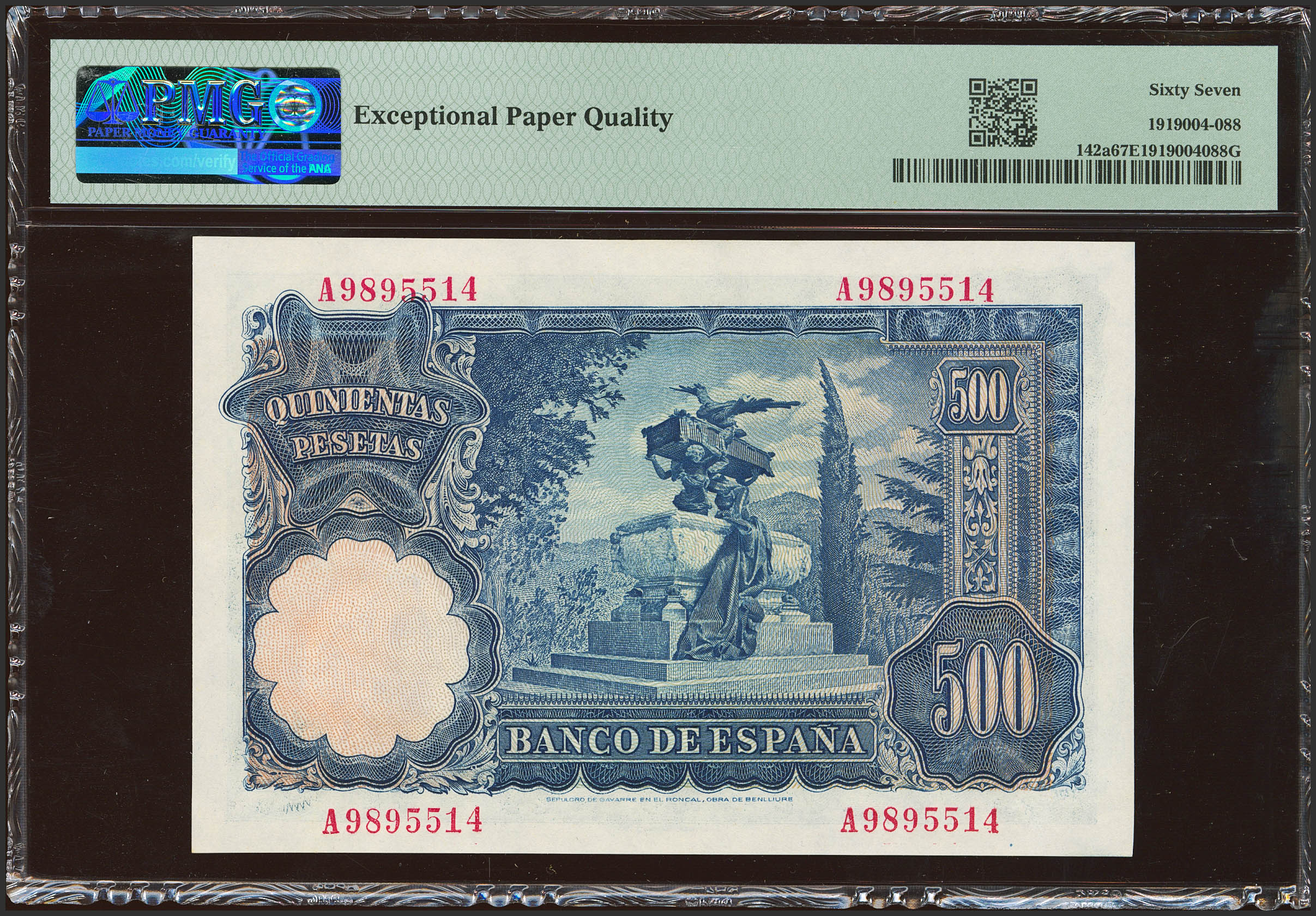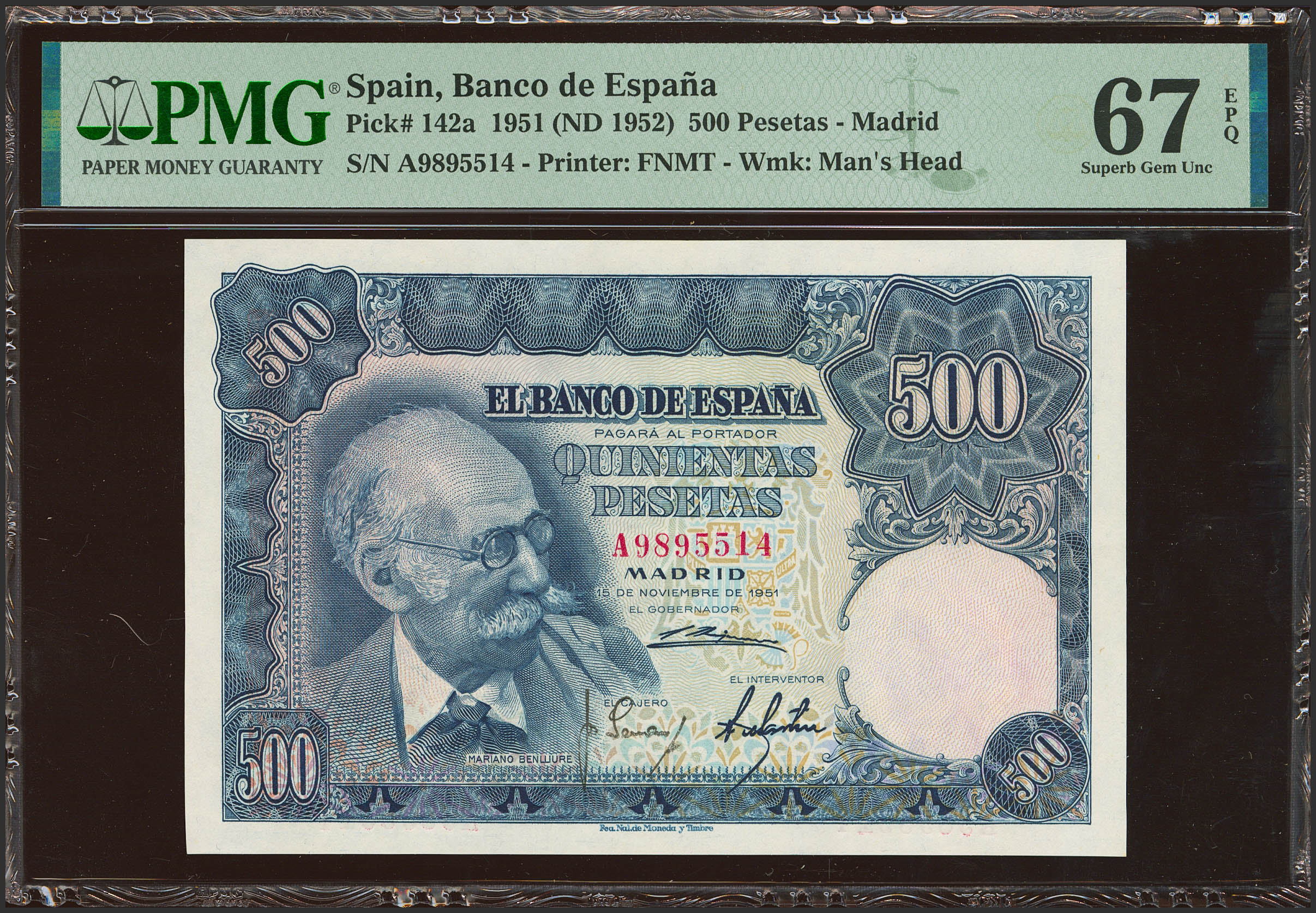 500 Pesetas. 15 de Noviembre de 1951. Serie A. (Edifil 2021: 460a, Pick: 142a). Extraordinariamente raro en esta excepcional calidad, conserva todo su apresto original. SC. Encapsulado PMG67EPQ.