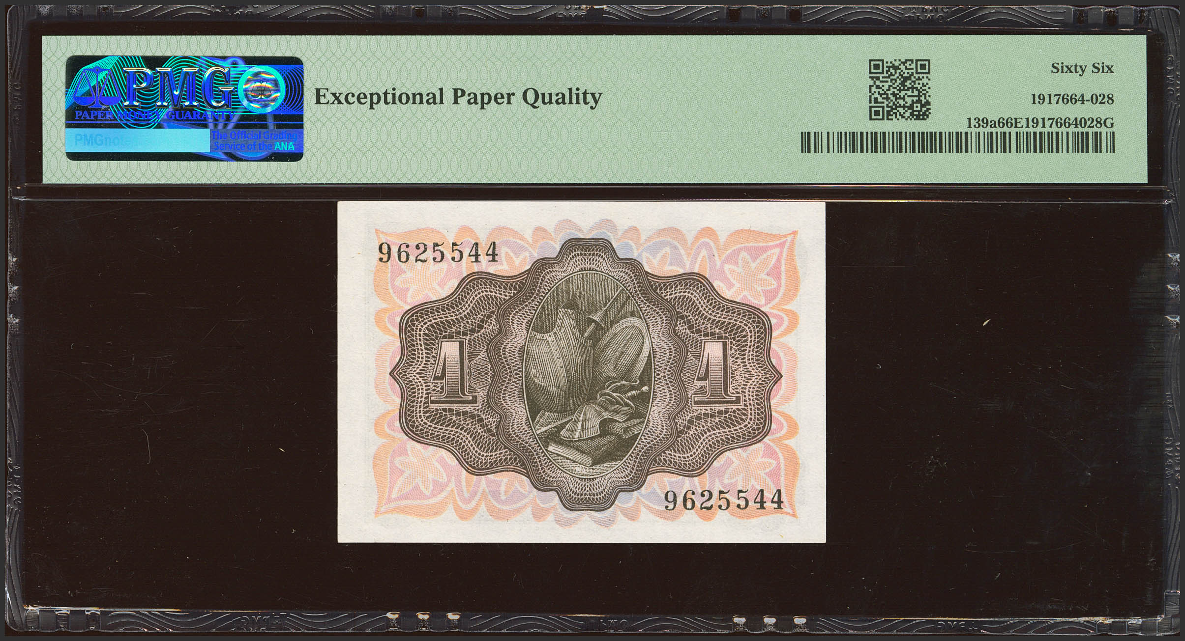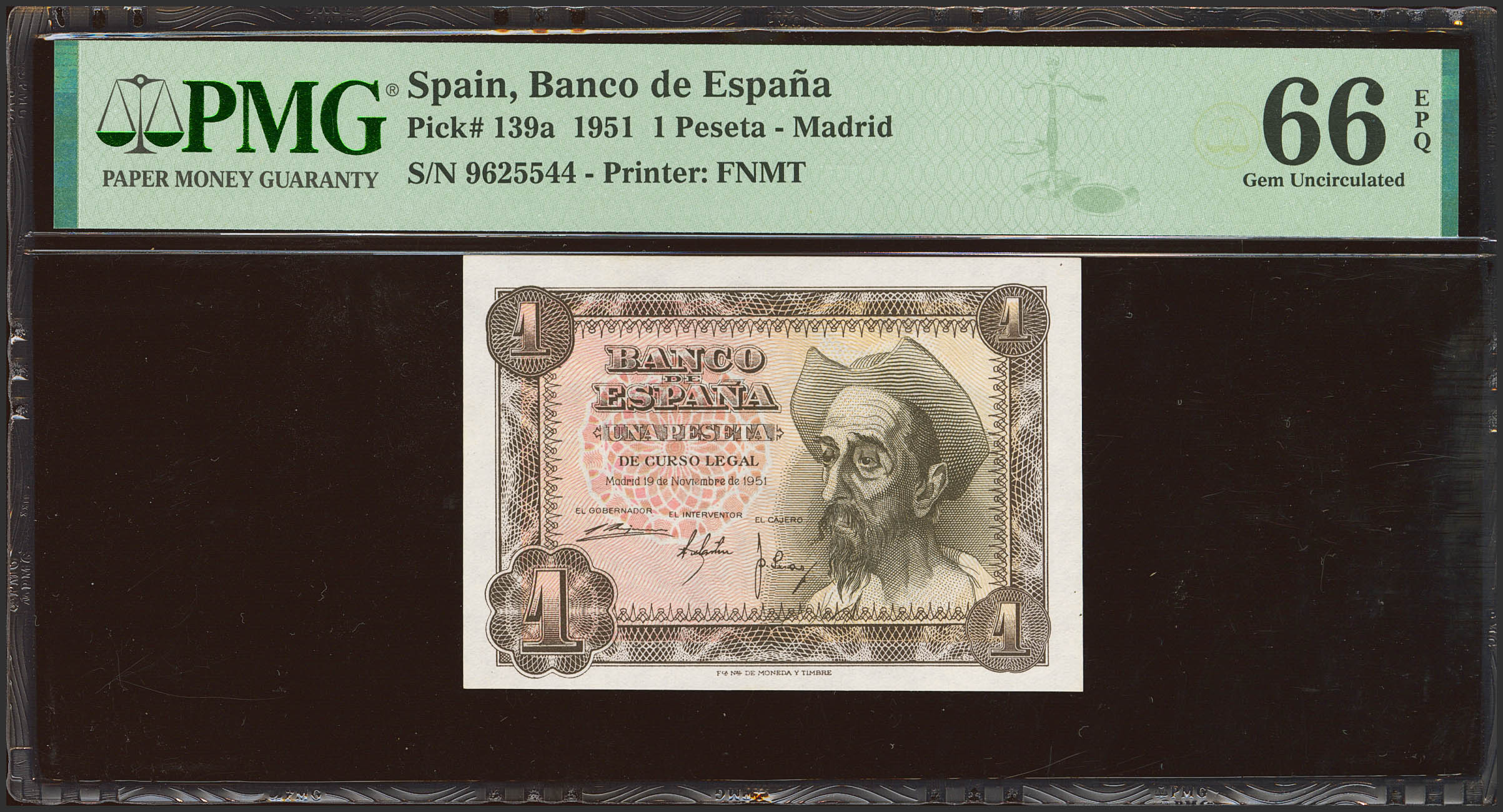 1 Peseta. 19 de Noviembre de 1951. Sin serie. (Edifil 2021: 461, Pick: 139a). Inusual en esta calidad, apresto original. SC. Encapsulado PMG66EPQ.