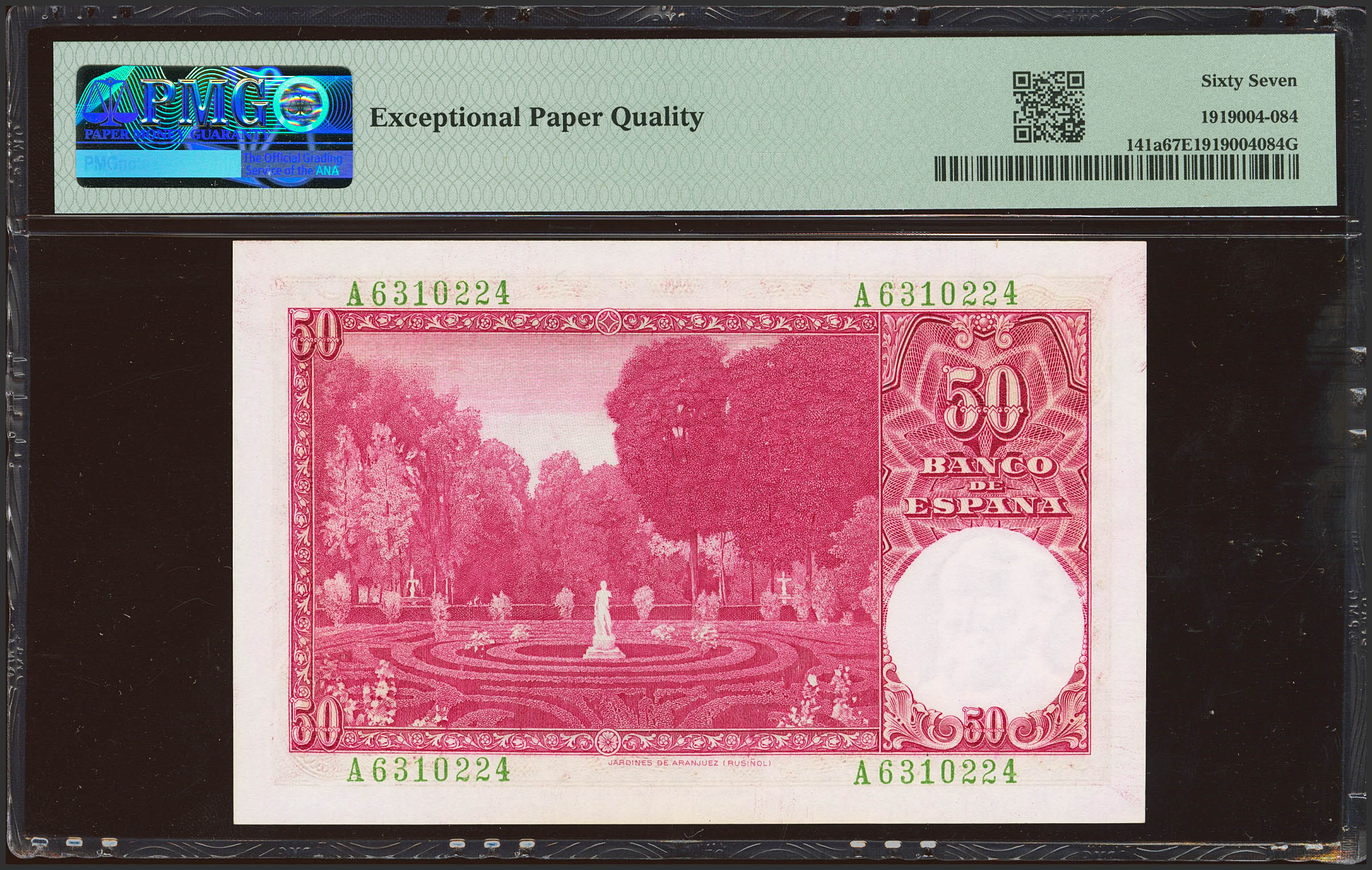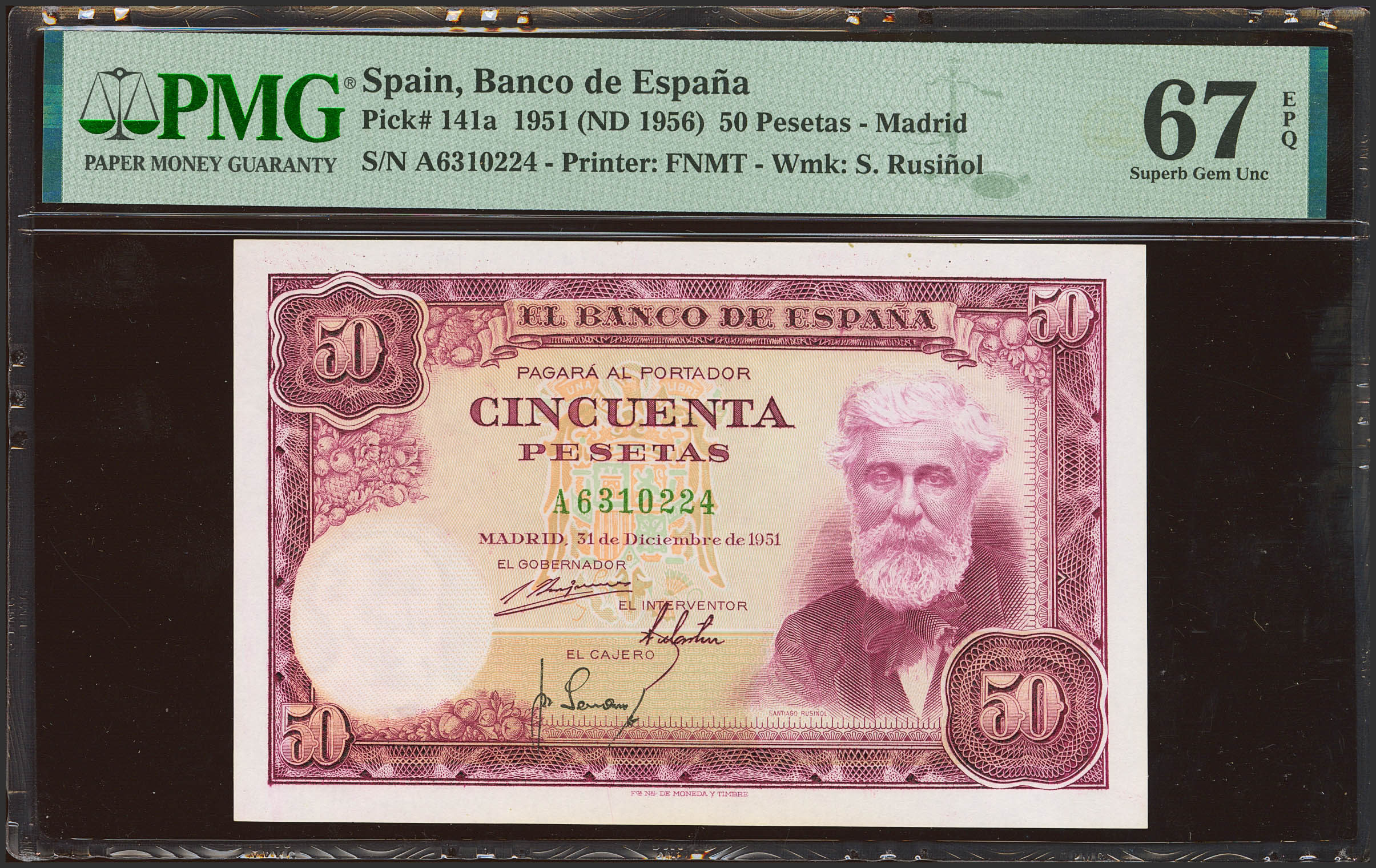 50 Pesetas. 31 de Diciembre de 1951. Serie A. (Edifil 2023: 462a, Pick: 141a). Raro en esta excepcional calidad, apresto original. SC. Encapsulado PMG67EPQ.