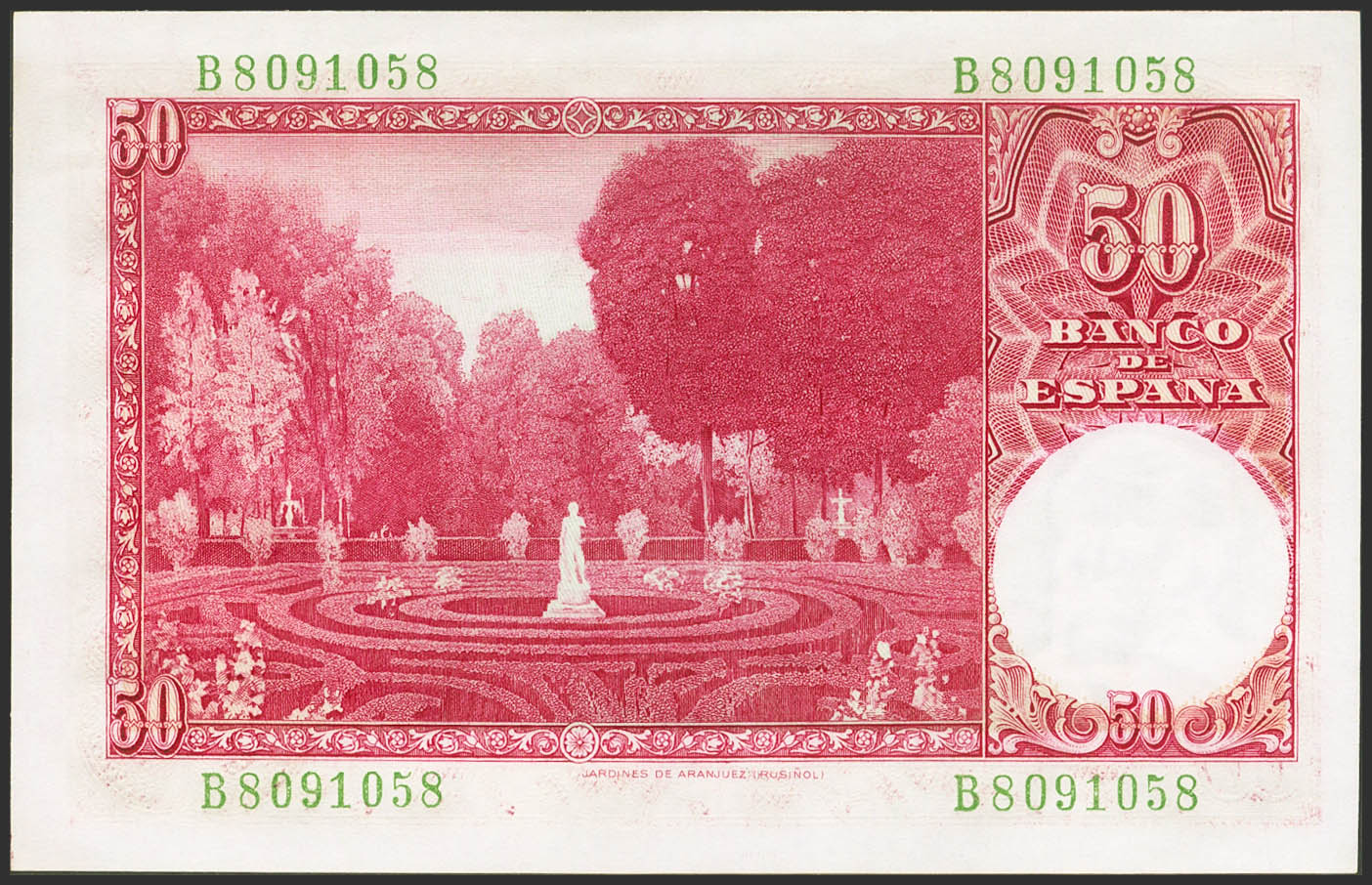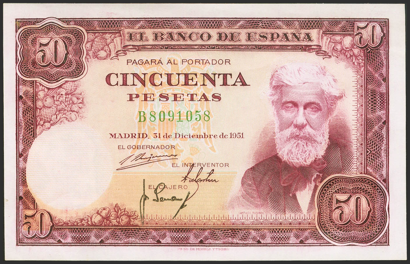 50 Pesetas. 31 de Diciembre de 1951. Serie B. (Edifil 2021: 462a). Conserva todo el apresto original. SC--.