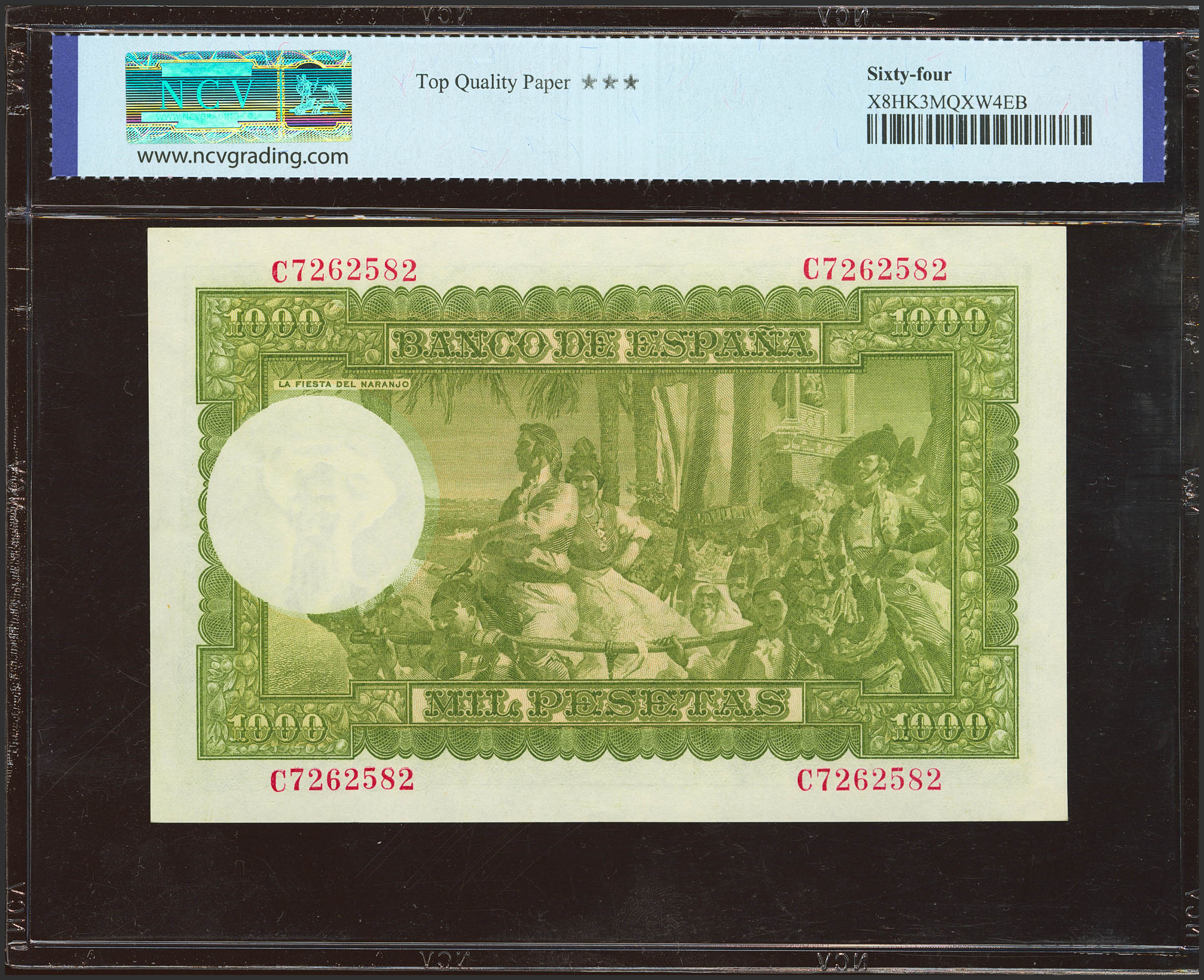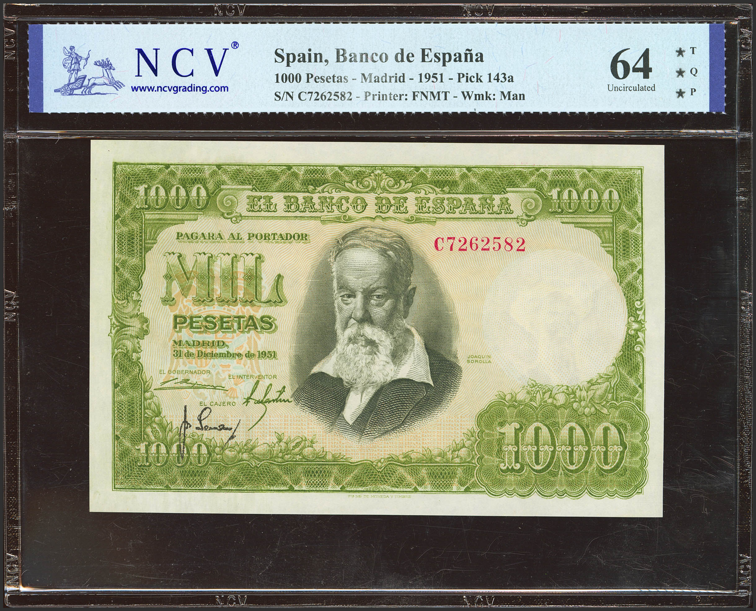 1000 Pesetas. 31 de Diciembre de 1951. Serie C, última serie emitida. (Edifil 2023: 463b, Pick: 143a). SC. Encapsulado NCV64TQP.