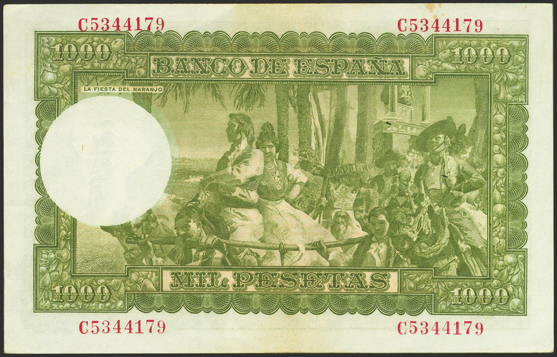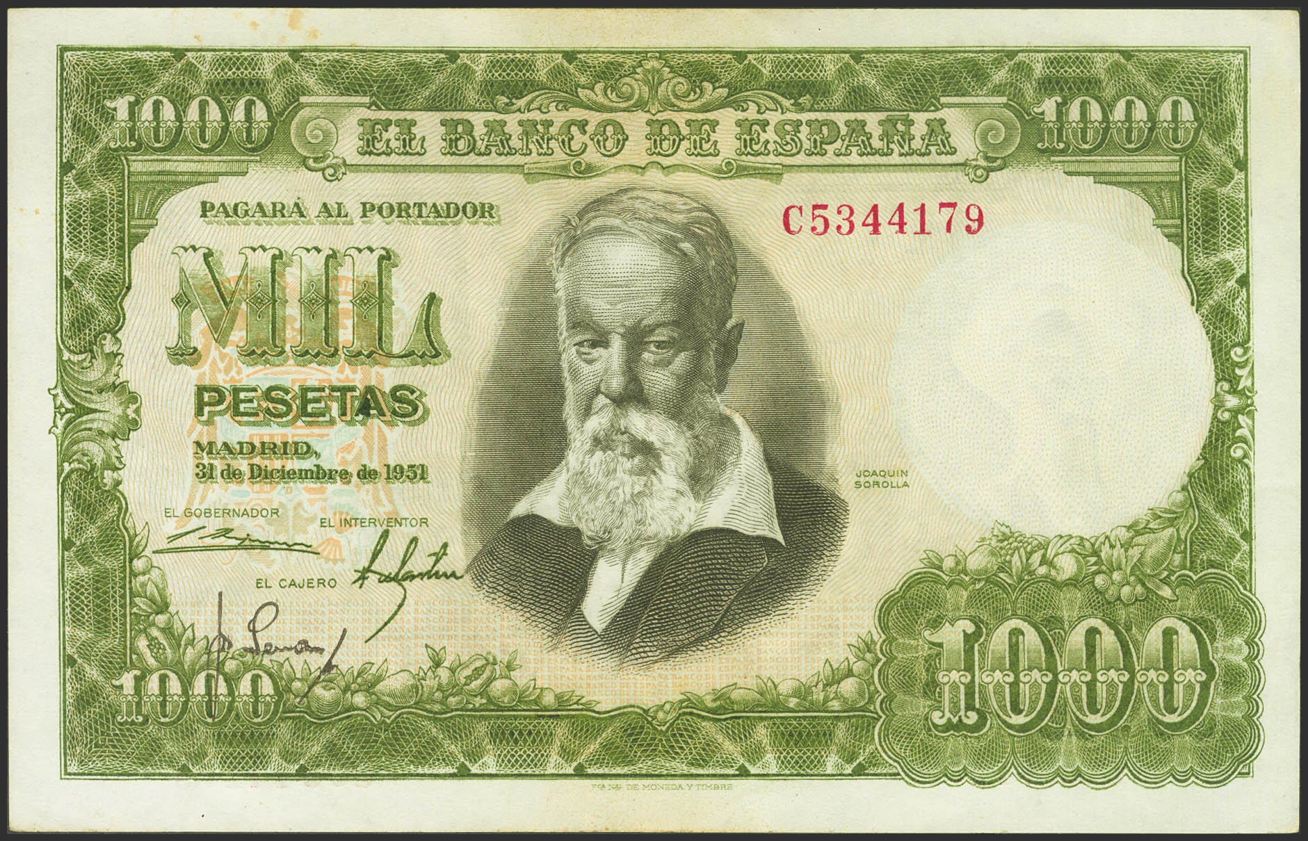 1000 Pesetas. 31 de Diciembre de 1951. Serie C, última serie emitida. (Edifil 2023: 463b). Manchitas del tiempo. EBC.