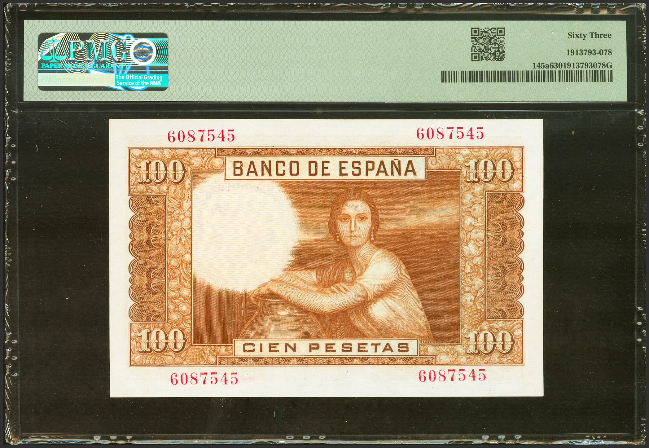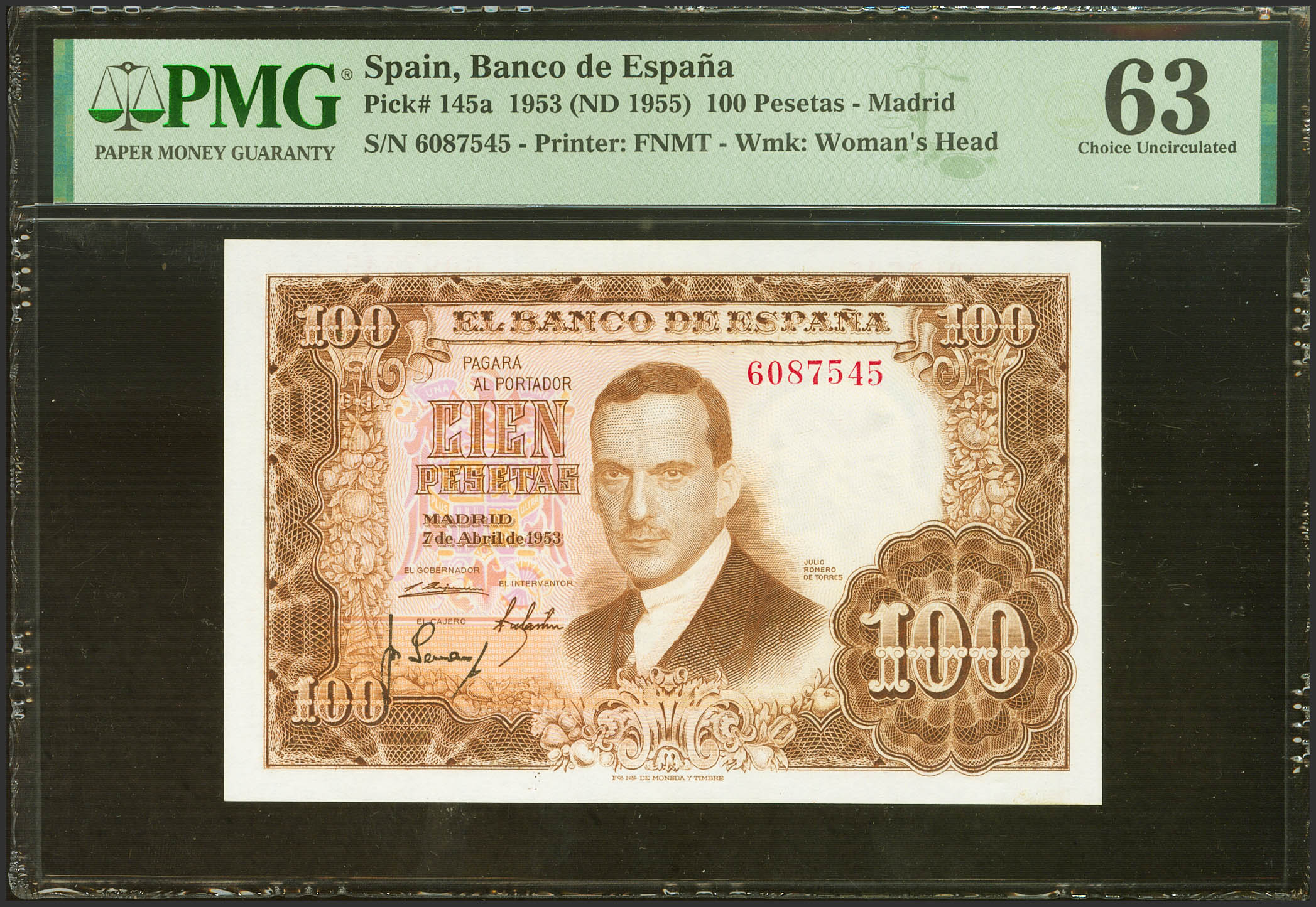 100 Pesetas. 7 de Abril de 1953. Sin serie. (Edifil 2021: 464, Pick: 145a). Inusual. SC. Encapsulado PMG63.