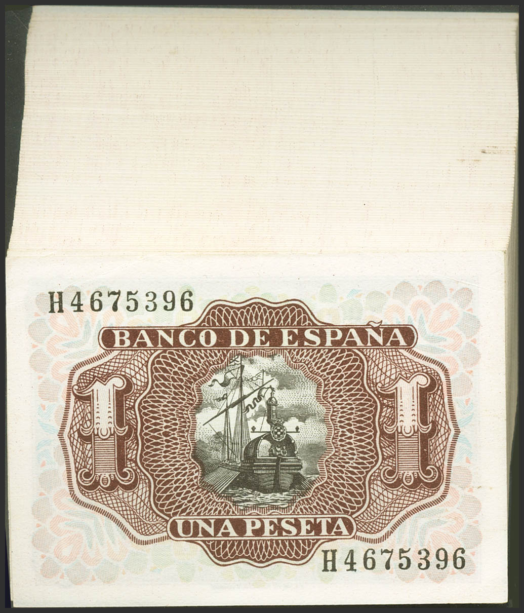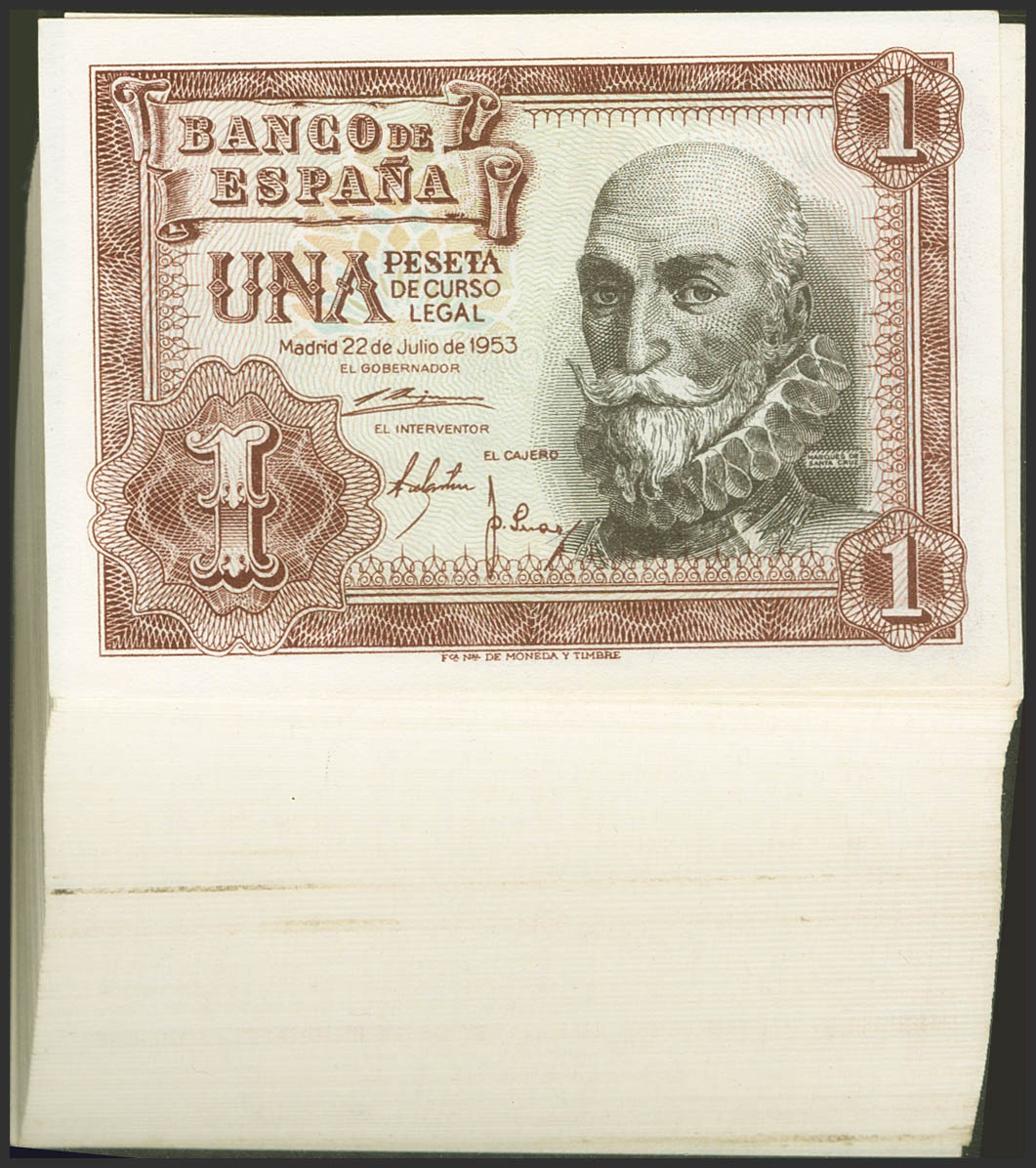 Conjunto de 93 billetes correlativos y una pareja del 1 Peseta emitidos el 22 de Julio de 1953, todos con la serie H (Edifil 2023: 465a), conservando el apresto original. SC/SC--.