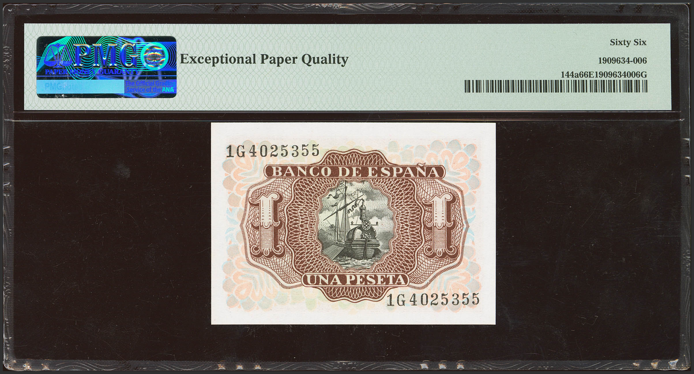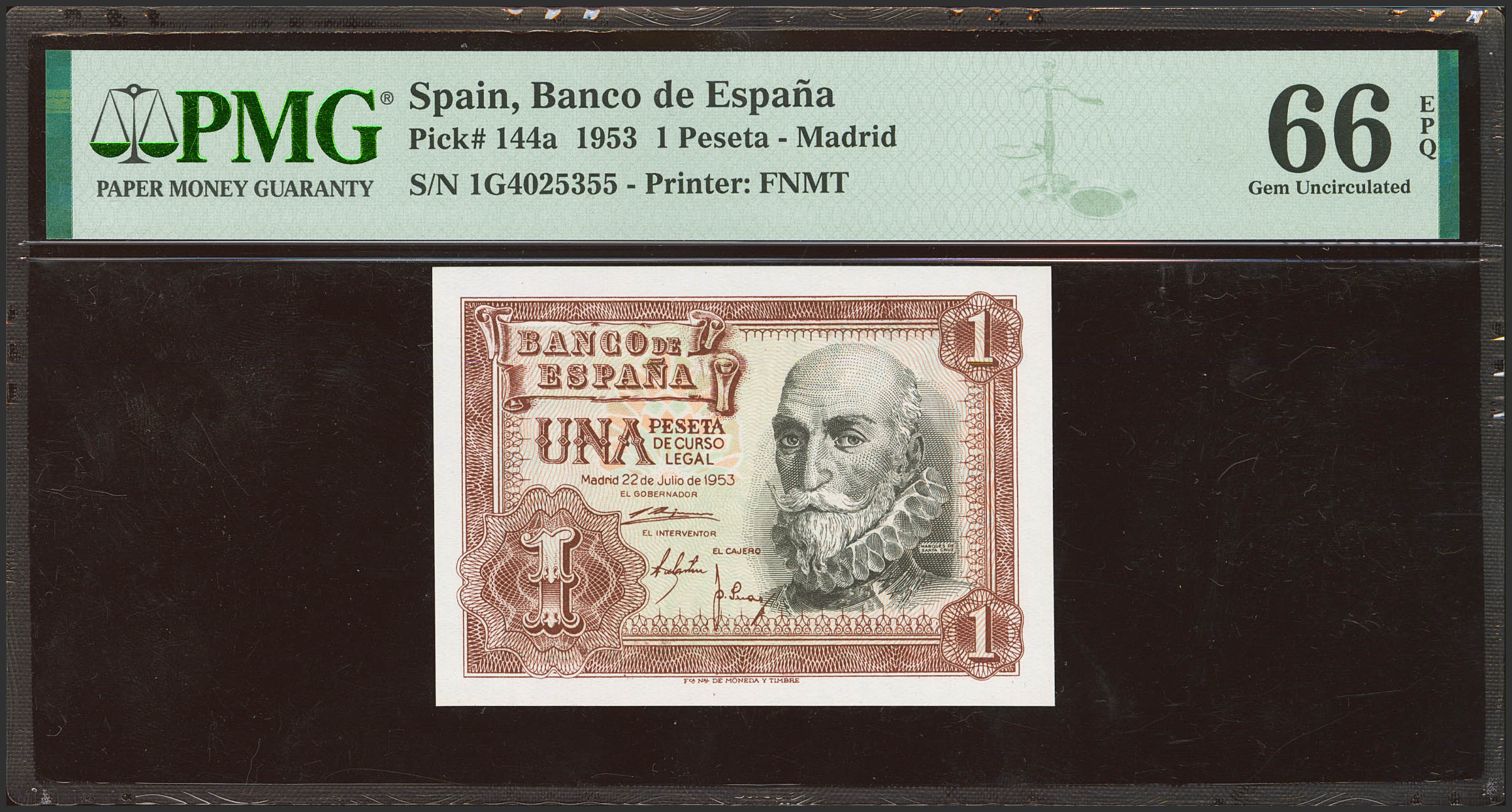 1 Peseta. 22 de Julio de 1953. Serie 1G. (Edifil 2023: 465b, Pick: 144a). Apresto original. SC. Encapsulado PMG66EPQ.