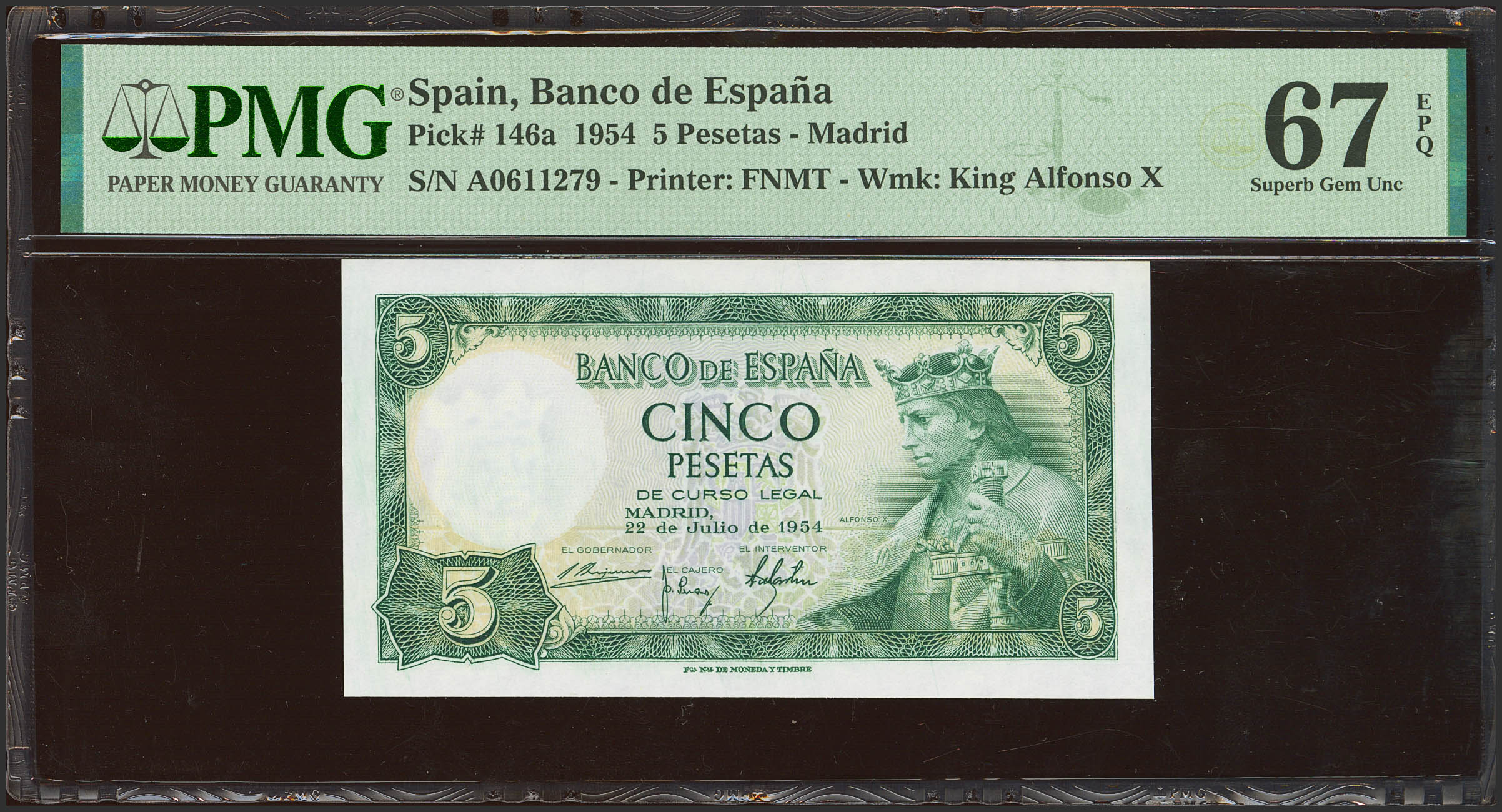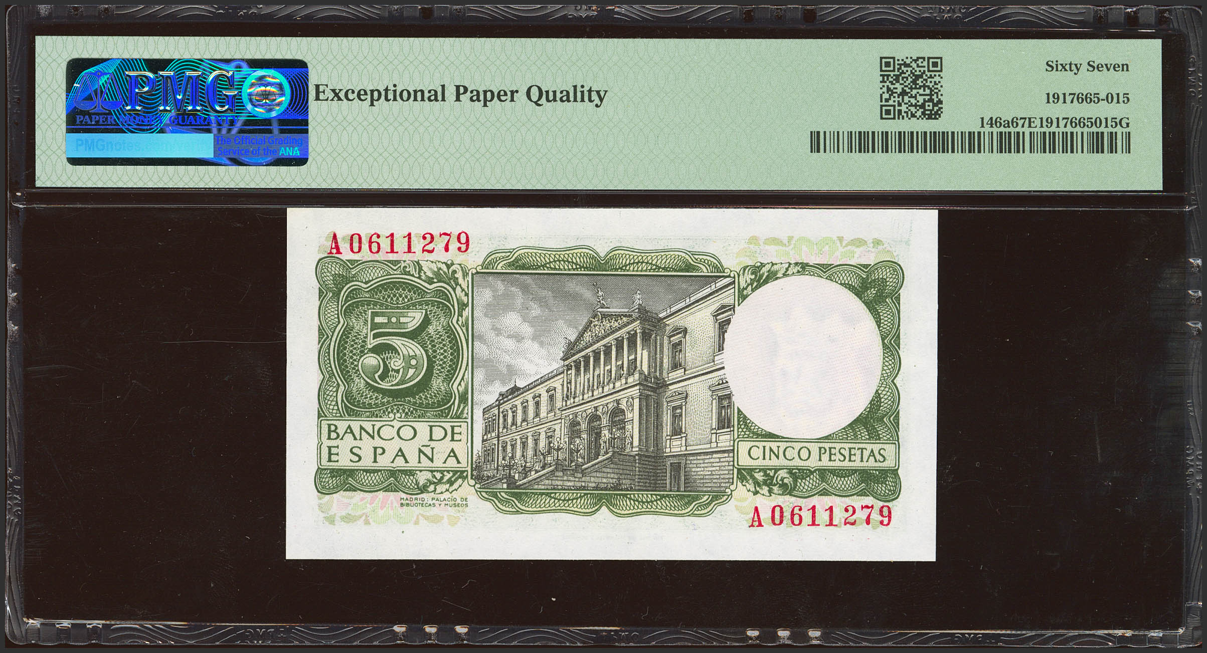 5 Pesetas. 22 de Julio de 1954. Serie A. (Edifil 2023: 466a, Pick: 146a). Apresto original. SC. Encapsulado PMG67EPQ.
