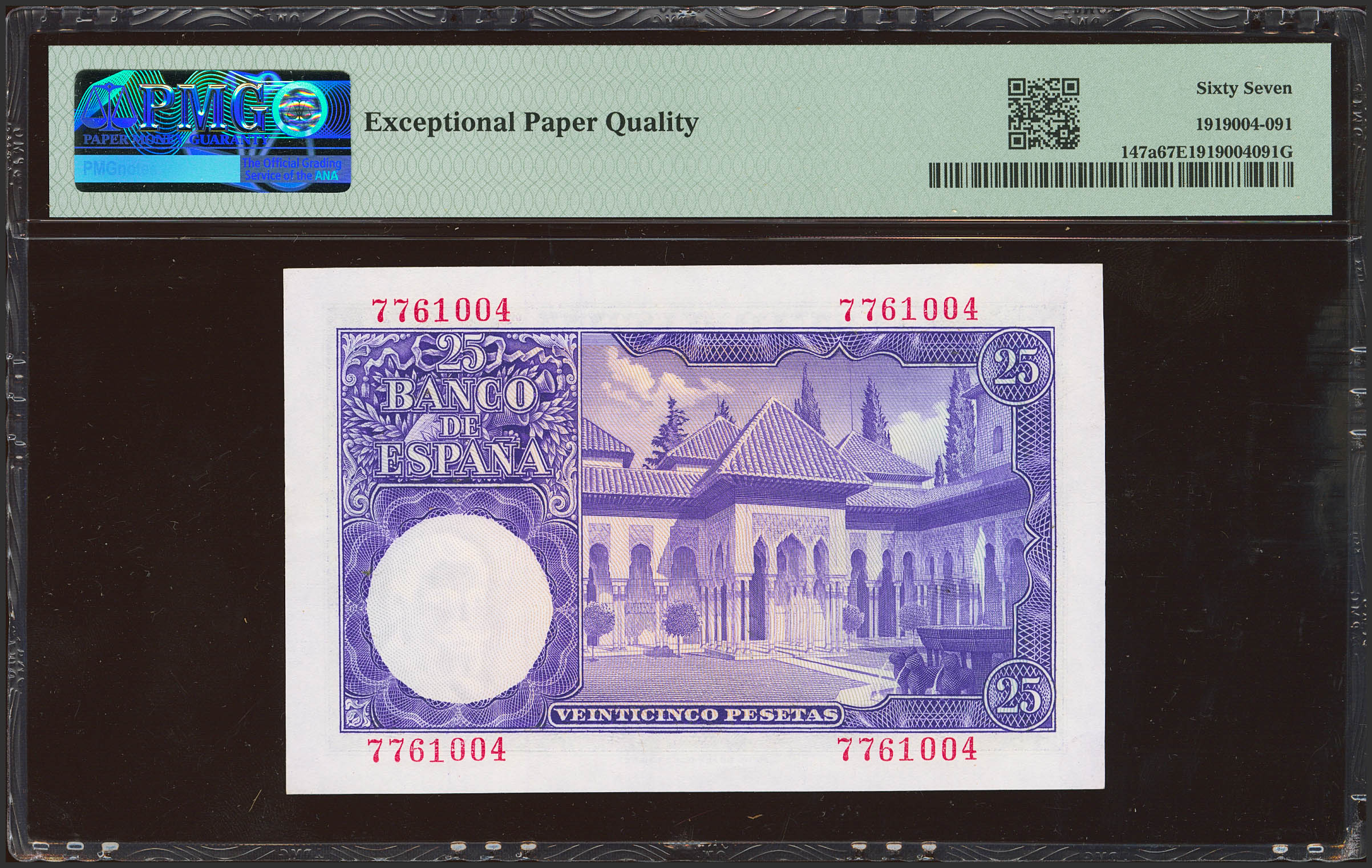 25 Pesetas. 22 de Julio de 1954. Sin serie. (Edifil 2023: 467, Pick: 147a). Rarísimo en esta excepcional calidad, conserva todo su apresto original. SC. Encapsulado PMG67EPQ.