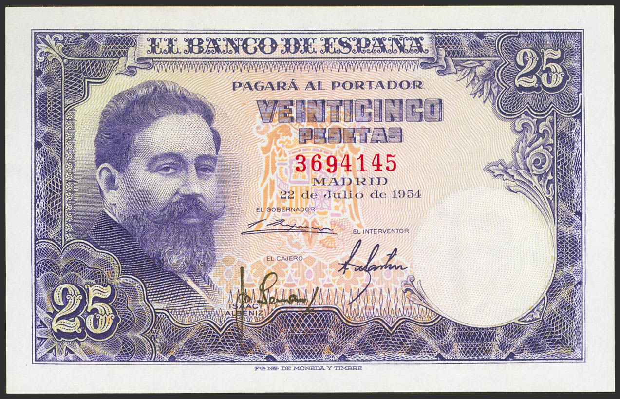 25 Pesetas. 22 de Julio de 1954. Sin serie. (Edifil 2023: 467). Conserva gran parte de su apresto original. EBC+.