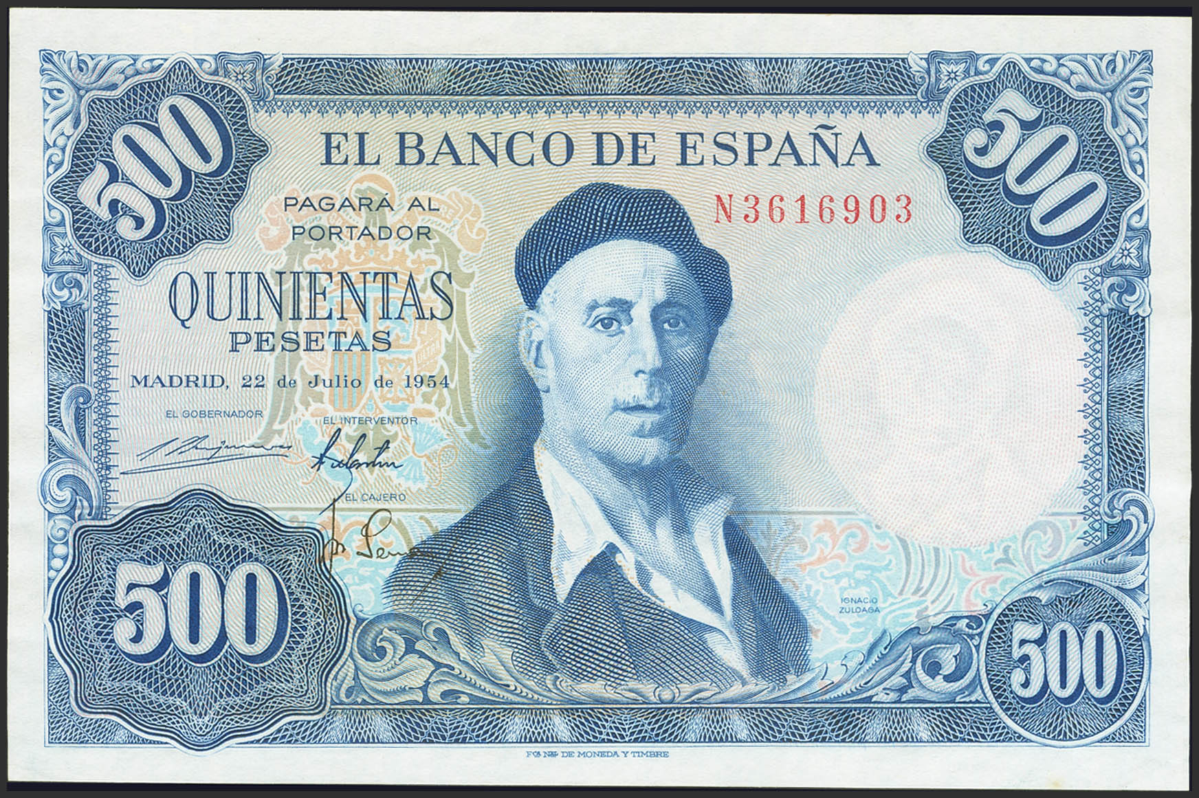 500 Pesetas. 22 de Julio de 1954. Serie N. (Edifil 2023: 468b). Conserva todo su apresto original. SC-.