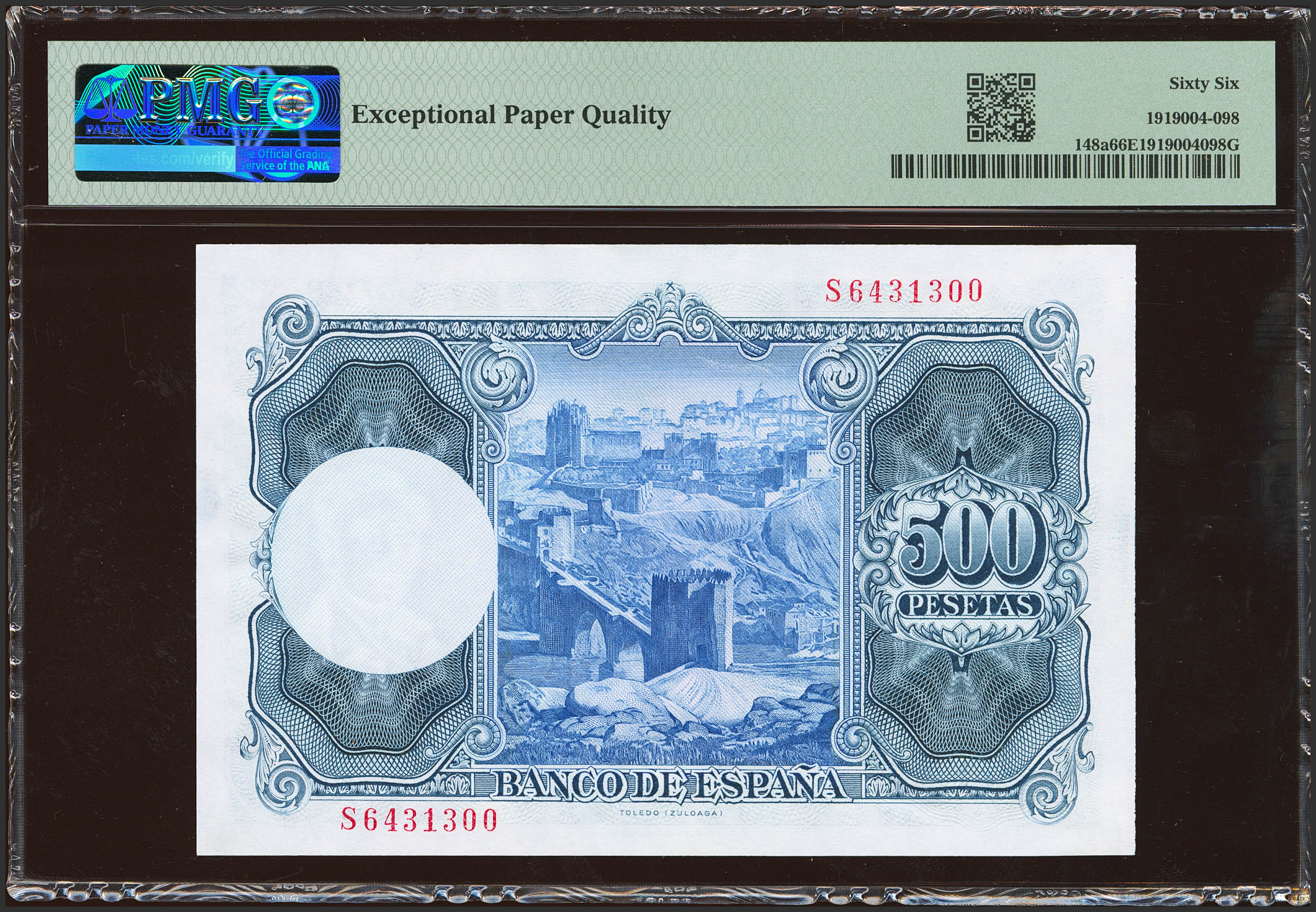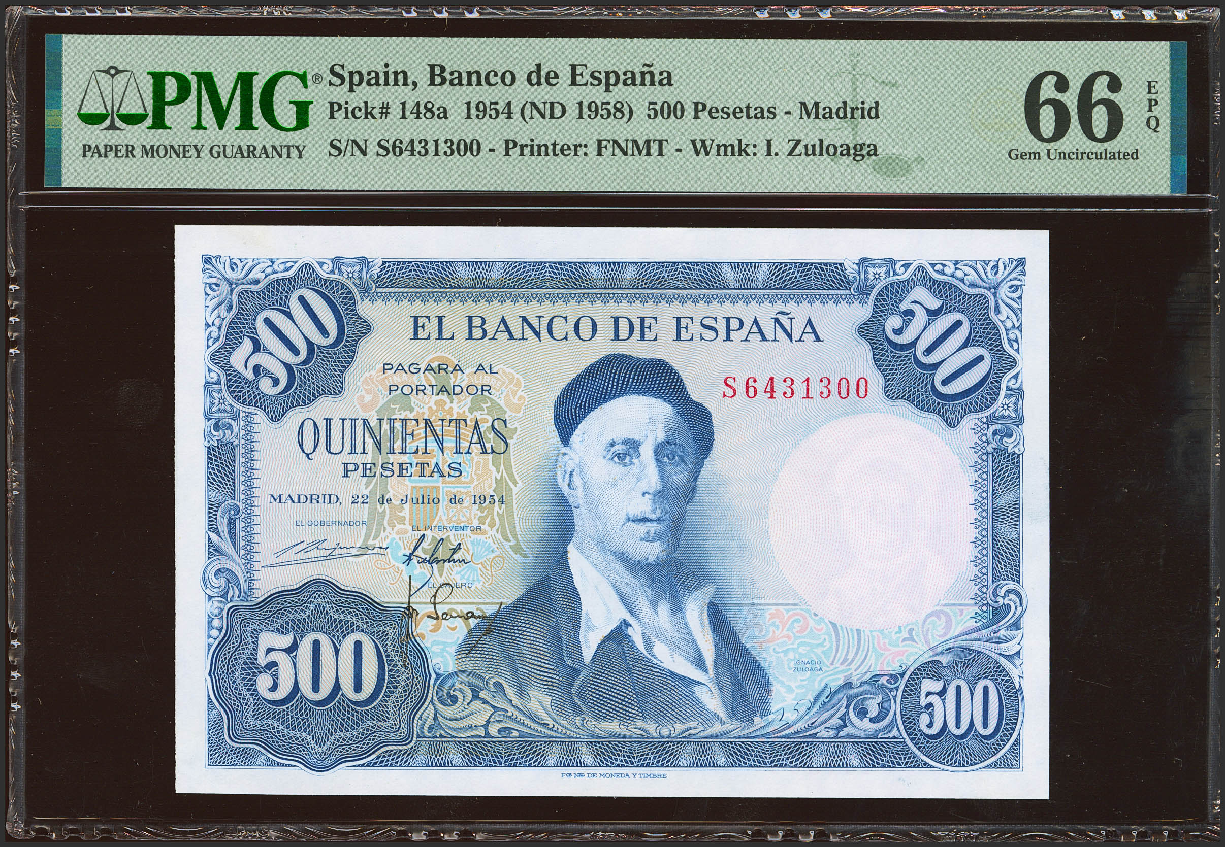 500 Pesetas. 22 de Julio de 1954. Serie S. (Edifil 2021: 468b, Pick: 148a). Raro en esta excepcional calidad, apresto original. SC. Encapsulado PMG66EPQ.