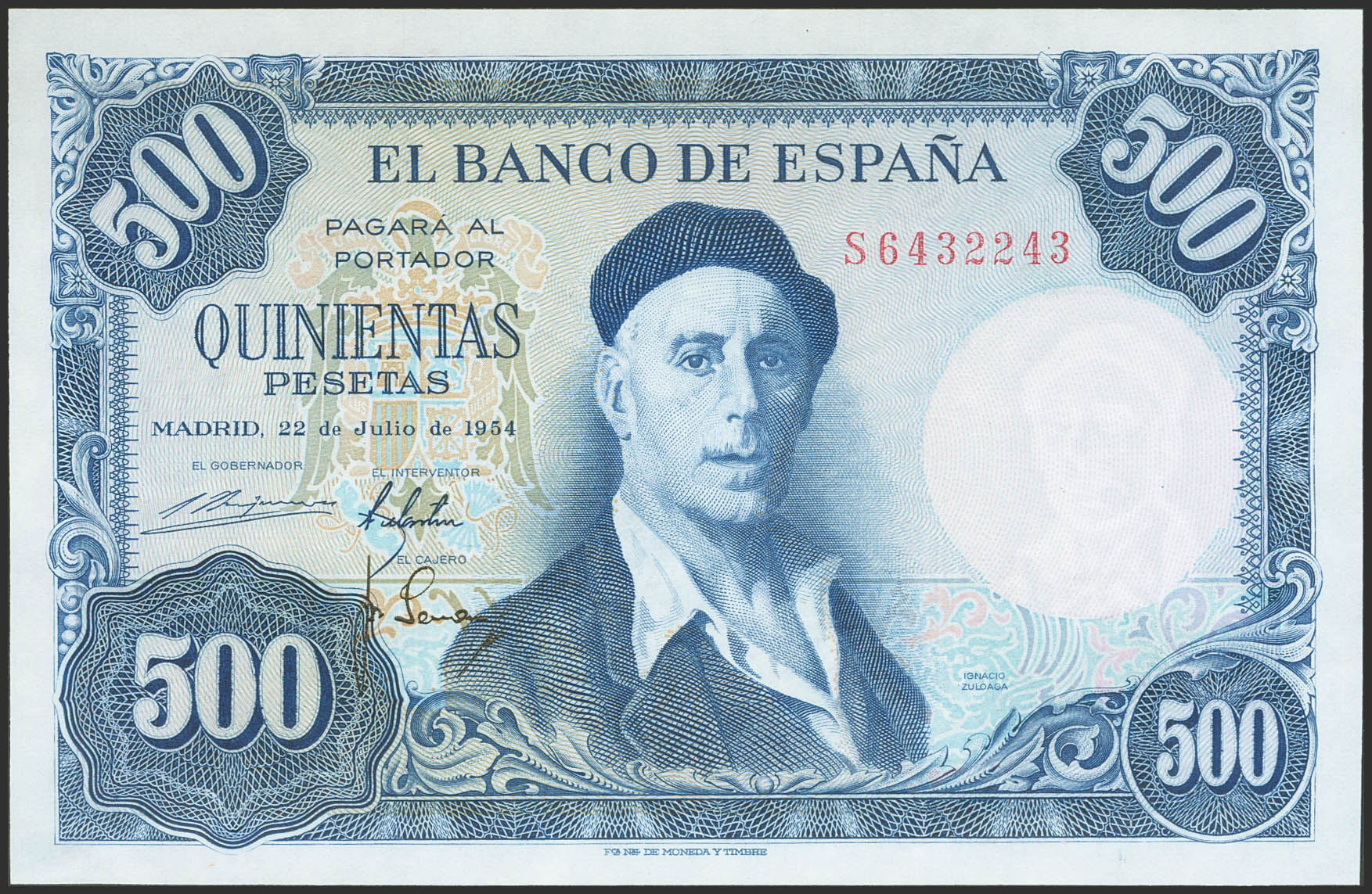 500 Pesetas. 22 de Julio de 1954. Serie S. (Edifil 2023: 468b). Conserva todo su apresto original. SC.