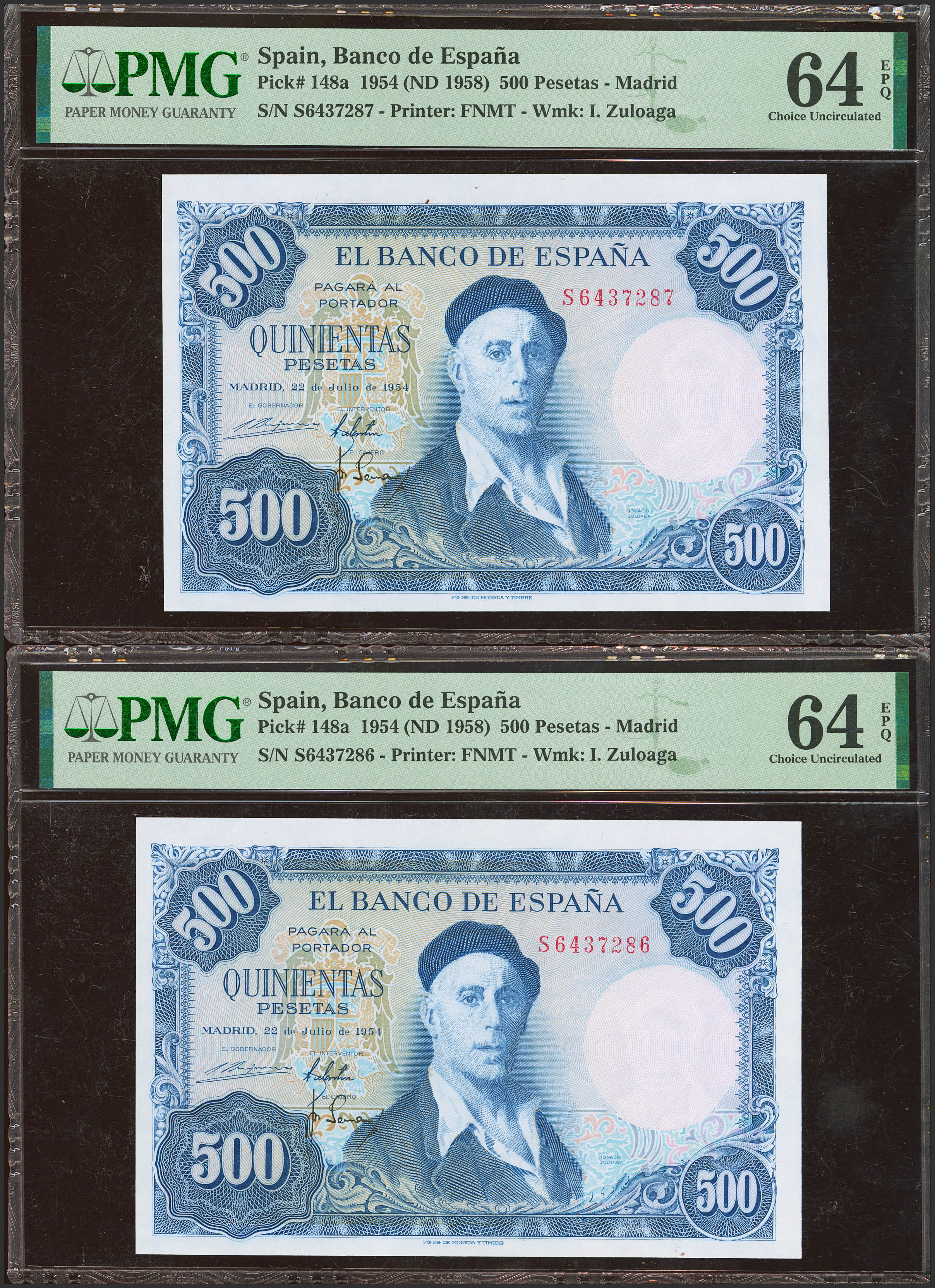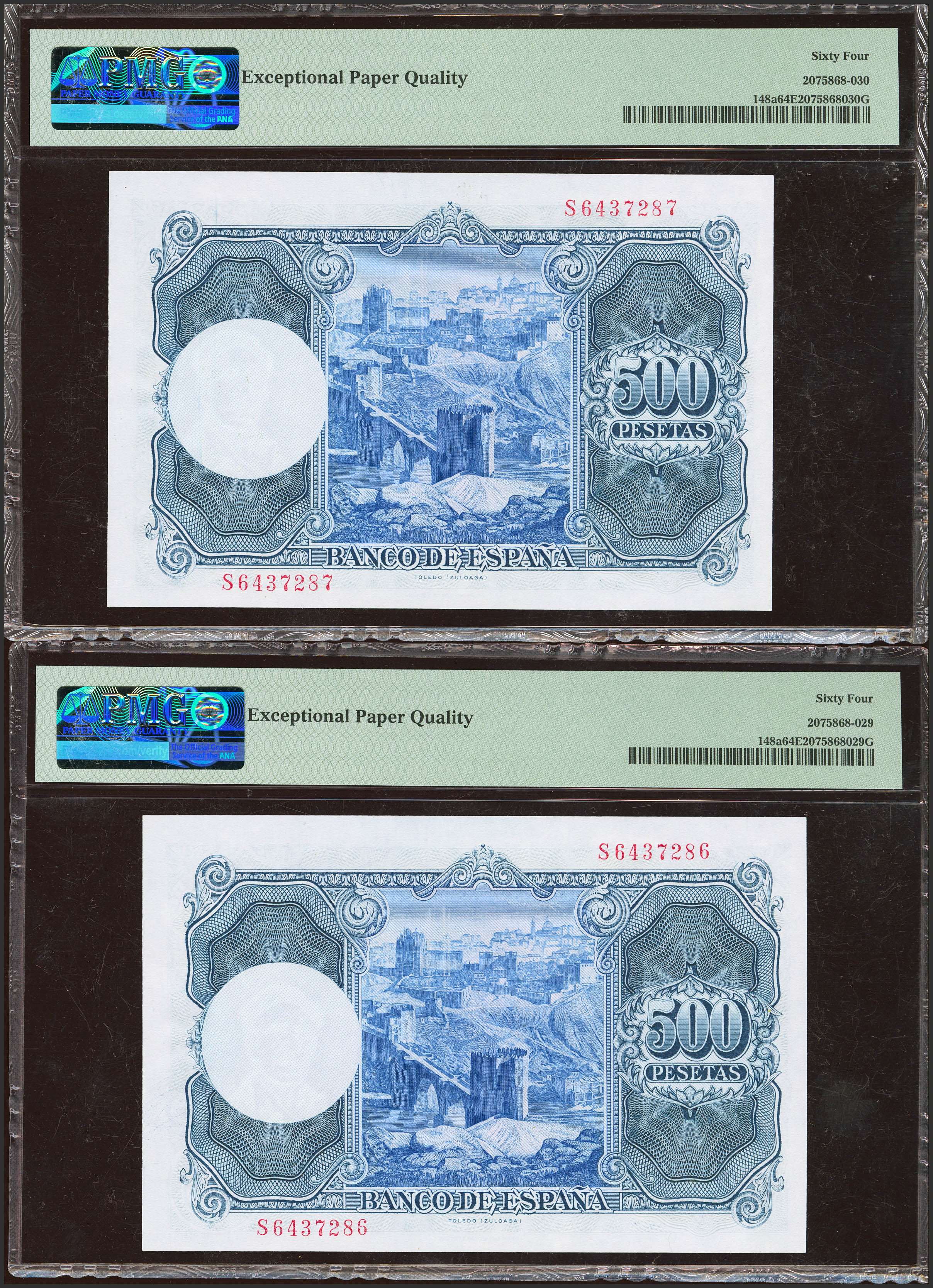 500 Pesetas. 22 de Julio de 1954. Pareja correlativa. Serie S. (Edifil 2021: 468b, Pick: 148a). Apresto original. SC. Encapsulados PMG64EPQ, ambos.