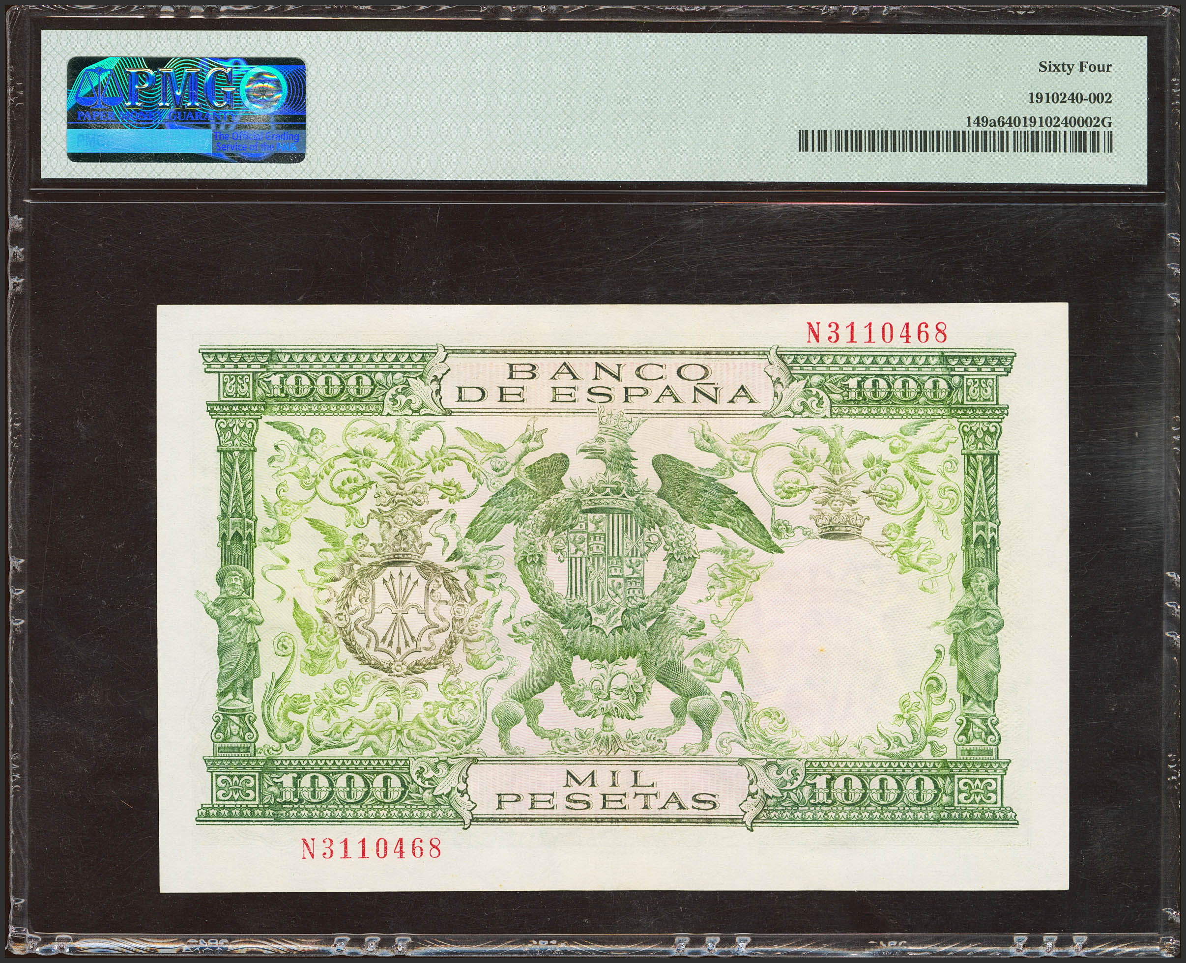 1000 Pesetas. 29 de Noviembre de 1957. Serie N. (Edifil 2023: 469b, Pick: 149a). SC. Encapsulado PMG64.