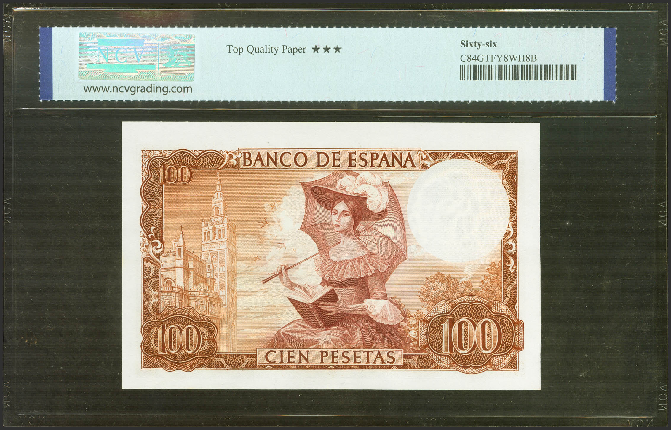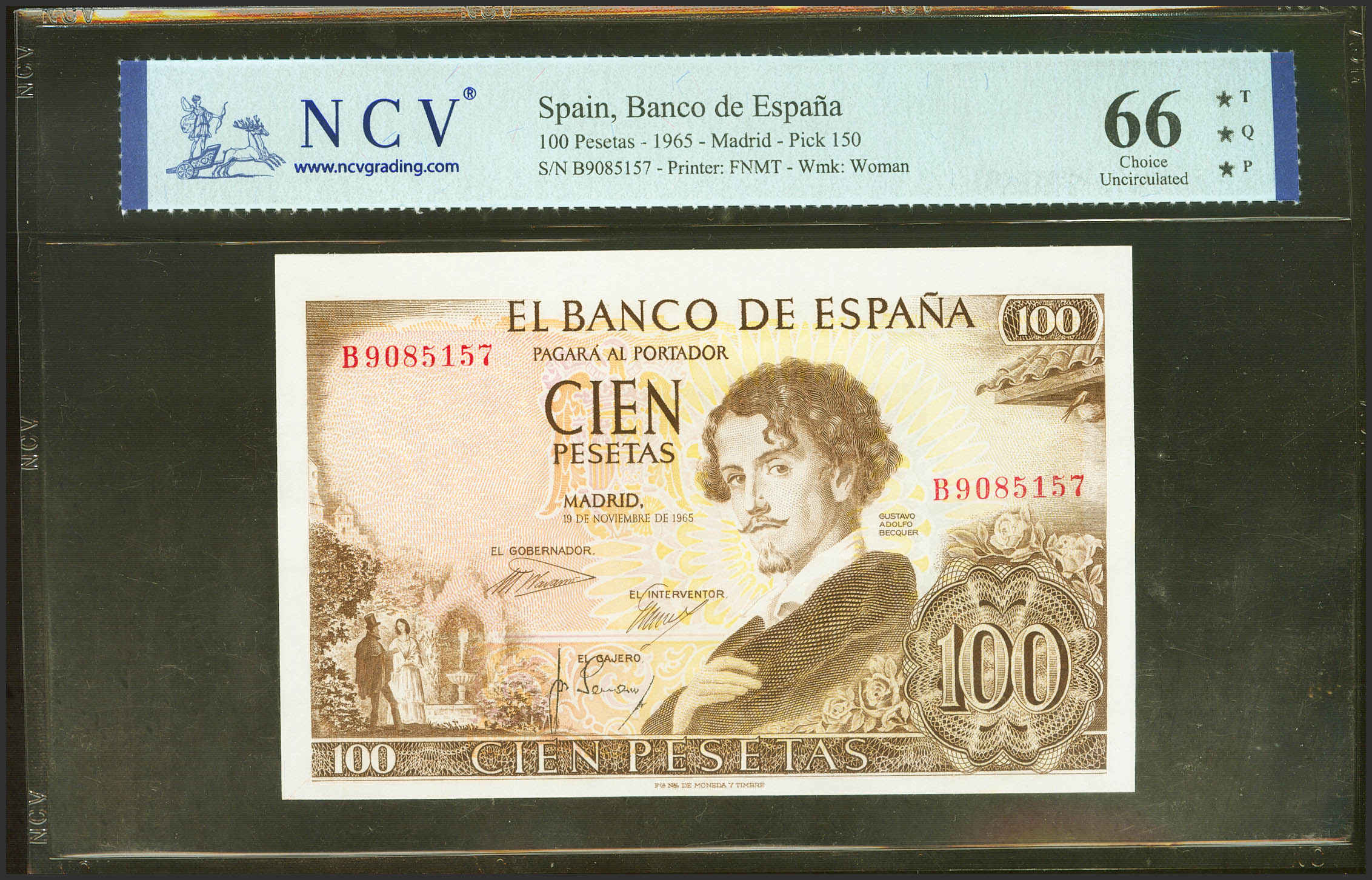 100 Pesetas. 19 de Noviembre de 1965. Serie B. (Edifil 2021: 470a, Pick: 150). Raro en esta excepcional calidad, apresto original. Encapsulado NCV66TQP.