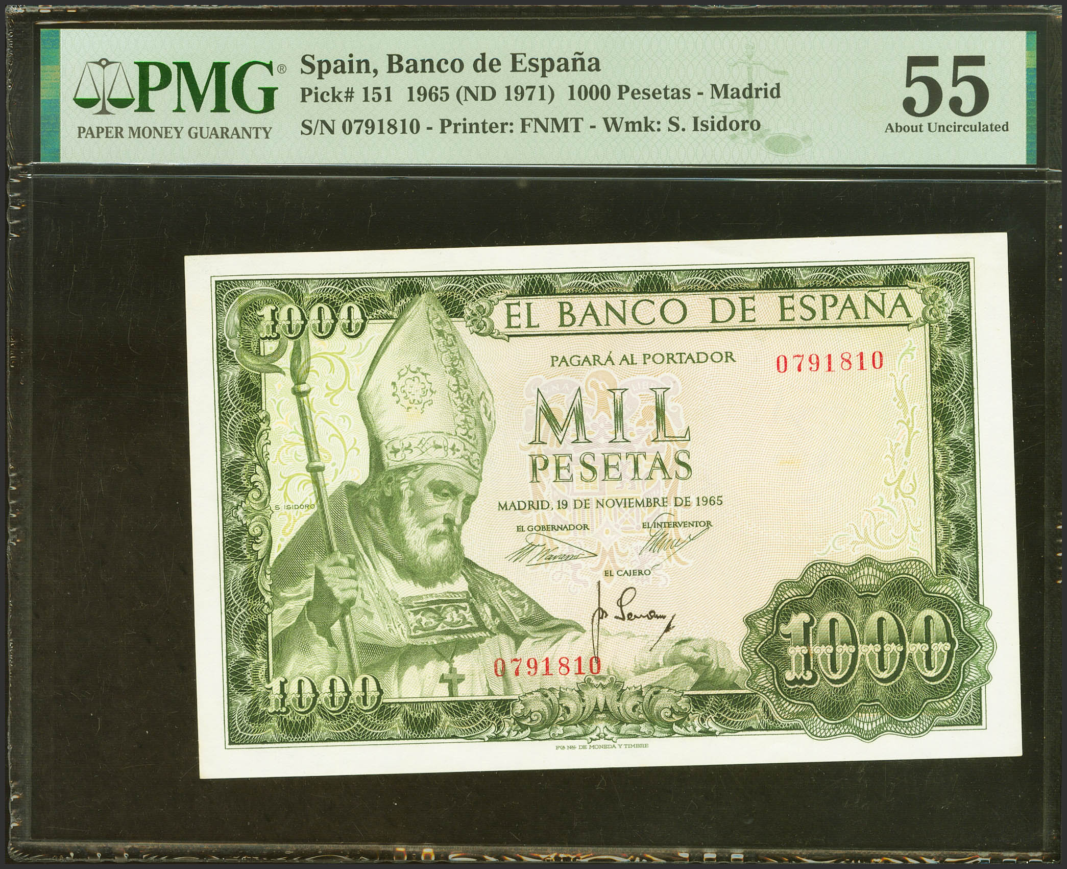 1000 Pesetas. 19 de Noviembre de 1965. Sin serie. (Edifil 2023: 471, Pick: 151). EBC+. Encapsulado PMG55.