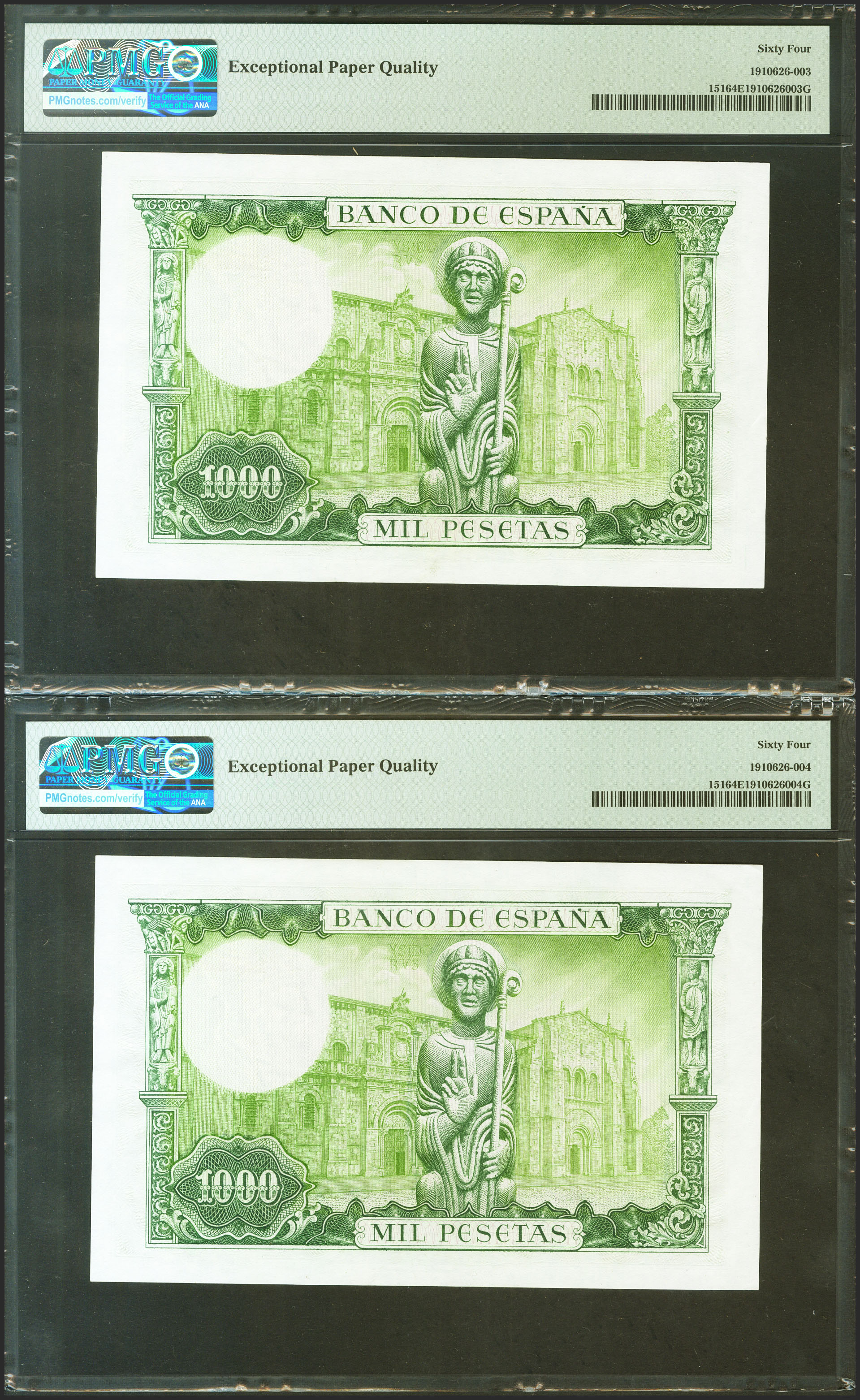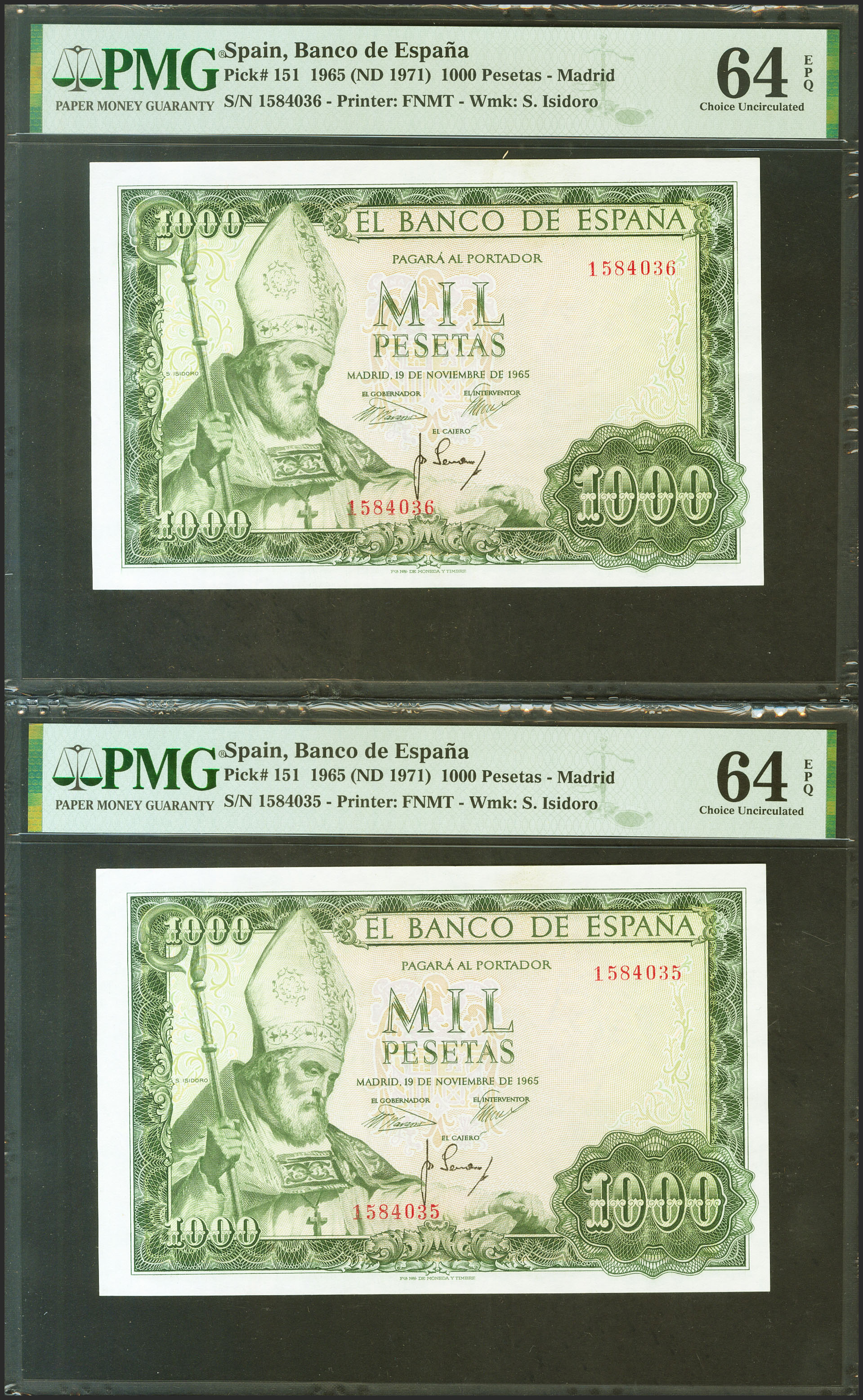 1000 Pesetas. 19 de Noviembre de 1965. Pareja correlativa. Sin serie. (Edifil 2017: 471, Pick: 151). Inusual en esta excepcional calidad, apresto original. SC. Encapsulados PMG64EPQ, ambos.