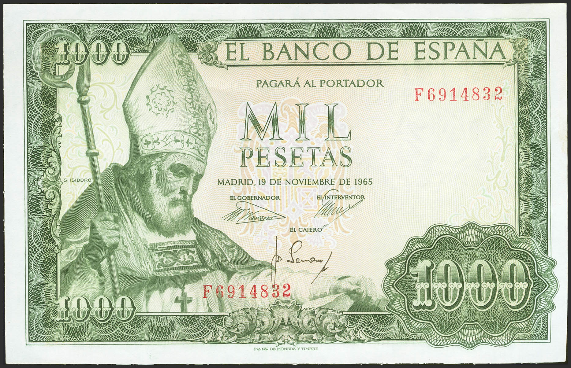 1000 Pesetas. 19 de Noviembre de 1965. Serie F. (Edifil 2023: 471b). Conserva parte de su apresto original. EBC+.