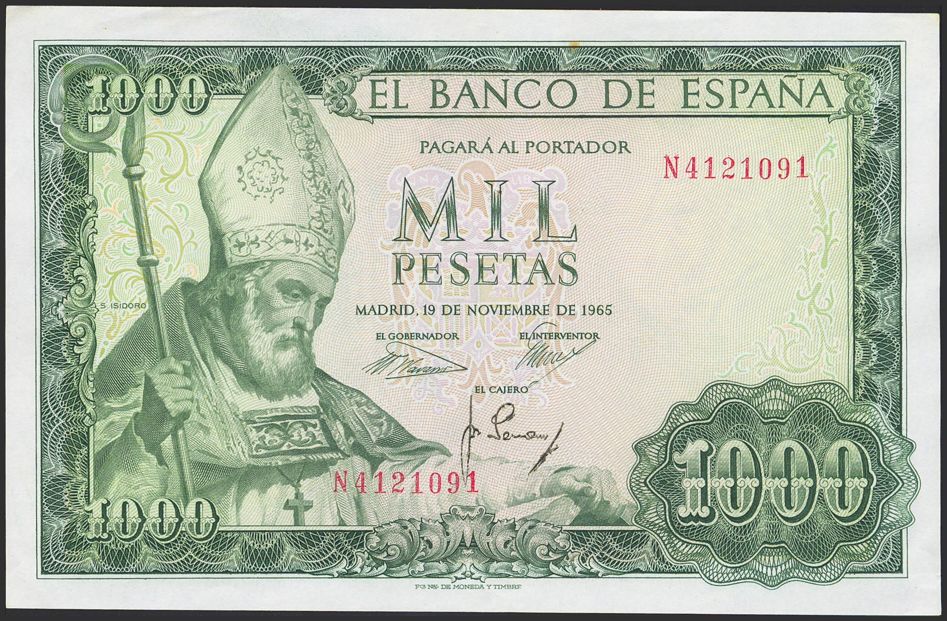 1000 Pesetas. 19 de Noviembre de 1965. Serie N. (Edifil 2023: 471b). Conserva parte de su apresto original. SC--.