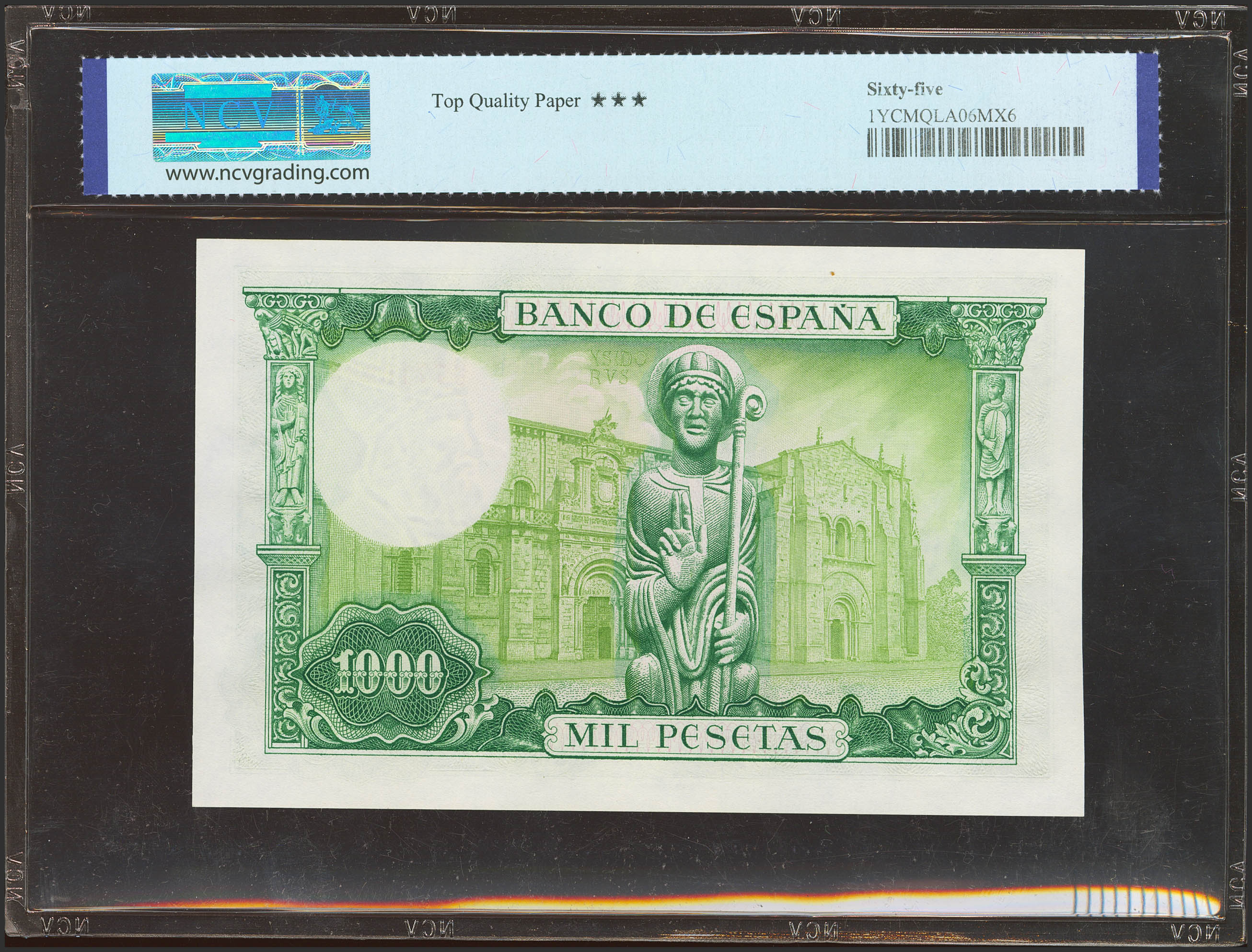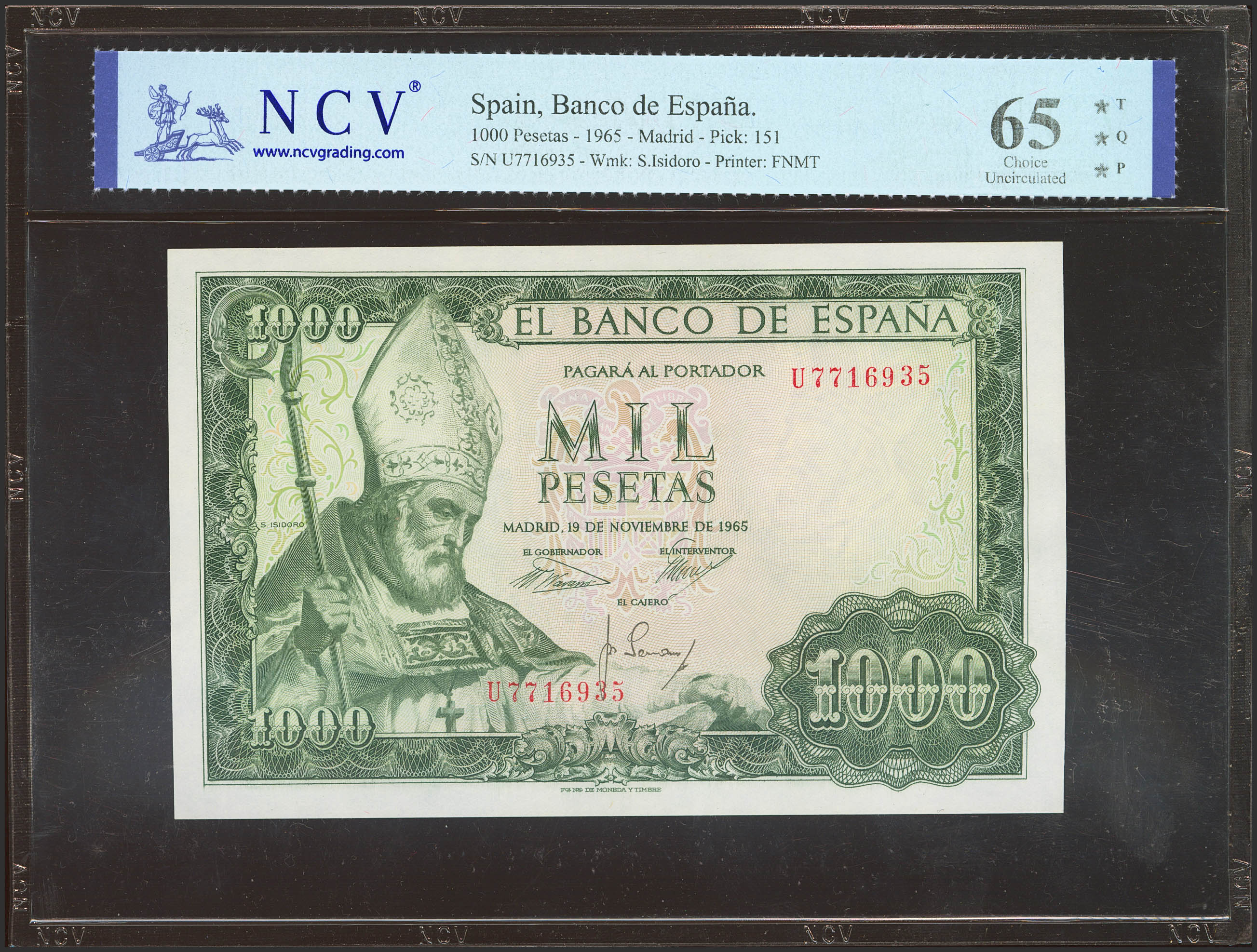 1000 Pesetas. 19 de Noviembre de 1965. Serie U. (Edifil 2023: 471b, Pick: 151). Apresto original. SC. Encapsulado NCV65TQP.