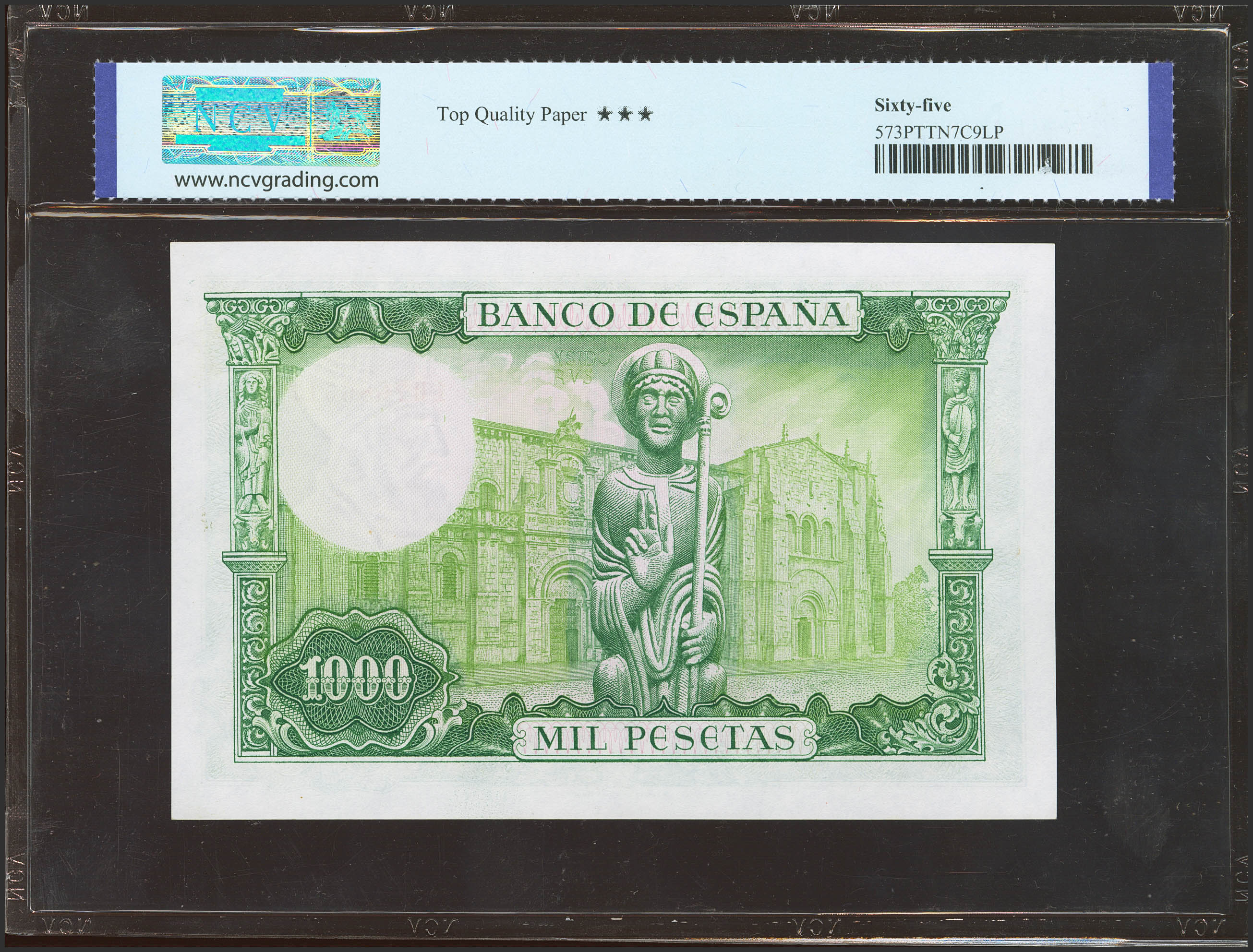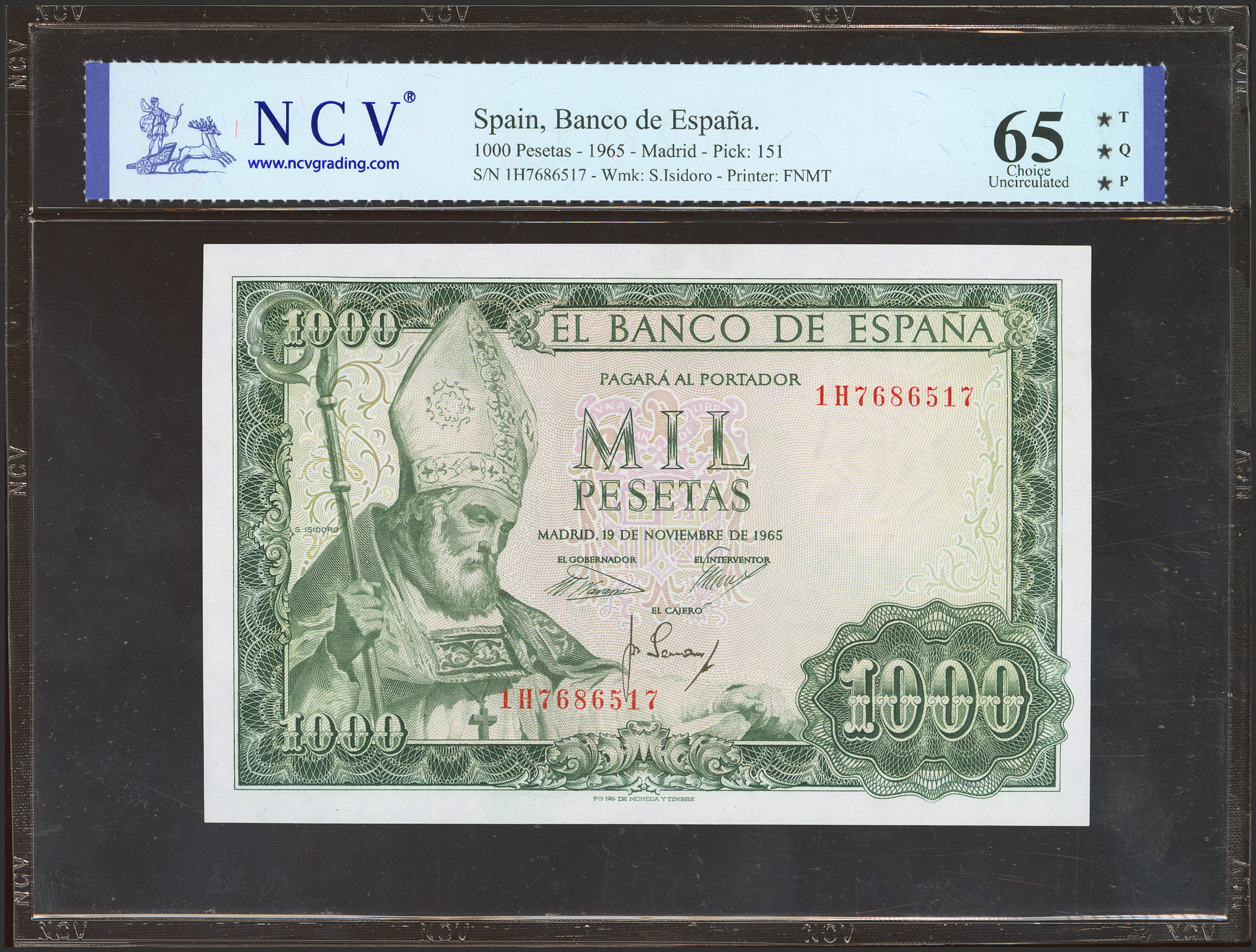 1000 Pesetas. 19 de Noviembre de 1965. Serie 1H. (Edifil 2023: 471b, Pick: 151). Apresto original. SC. Encapsulado NCV65TQP.