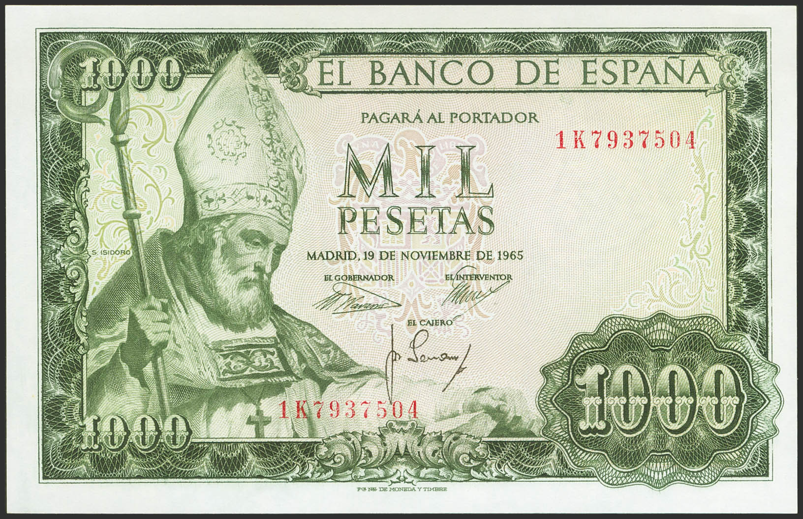 1000 Pesetas. 19 de Noviembre de 1965. Serie 1K. (Edifil 2023: 471b). Conserva todo su apresto original. SC.
