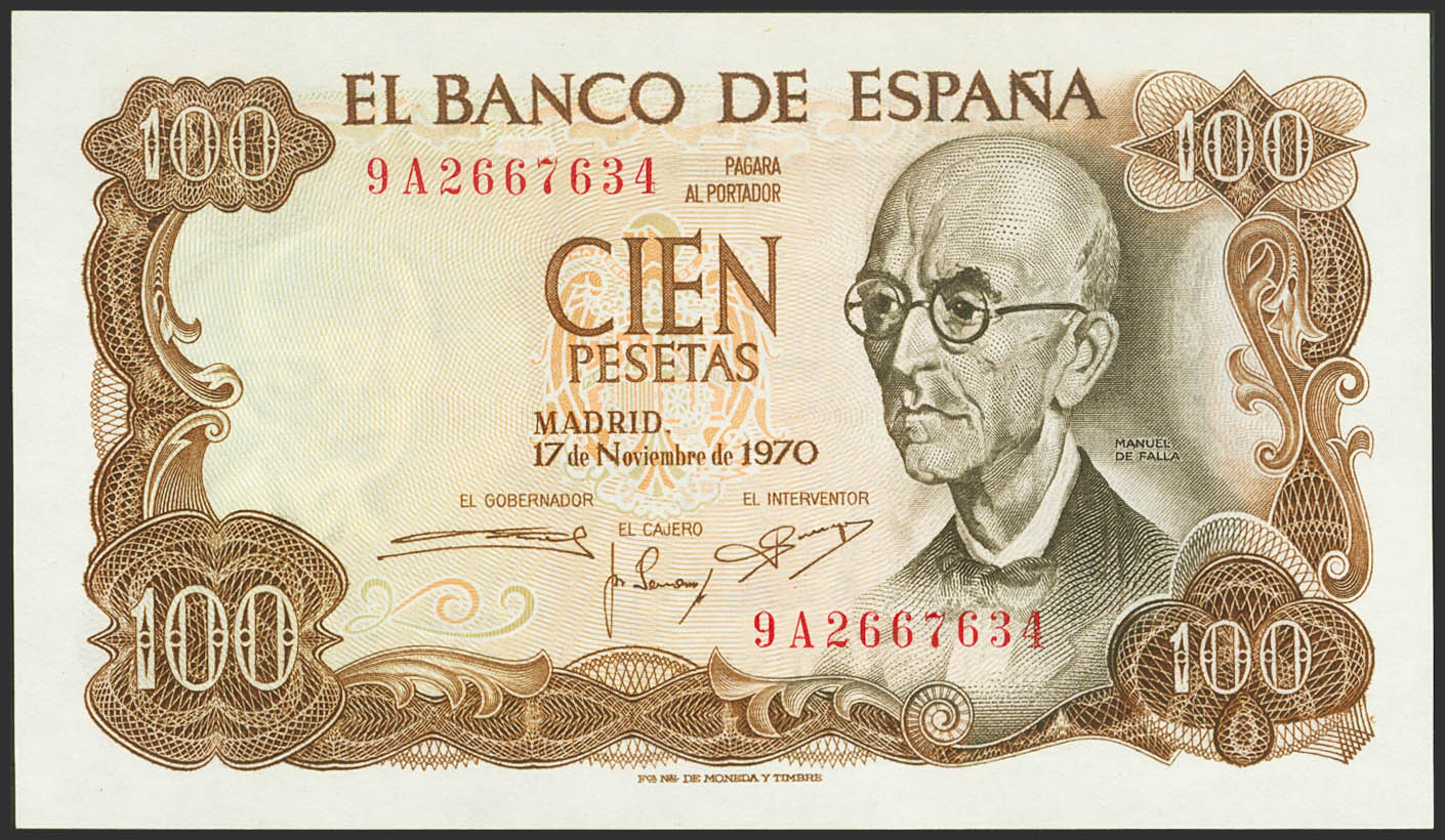 100 Pesetas. 17 de Noviembre de 1970. Serie especial 9A. (Edifil 2023: 472d). Apresto original. SC.