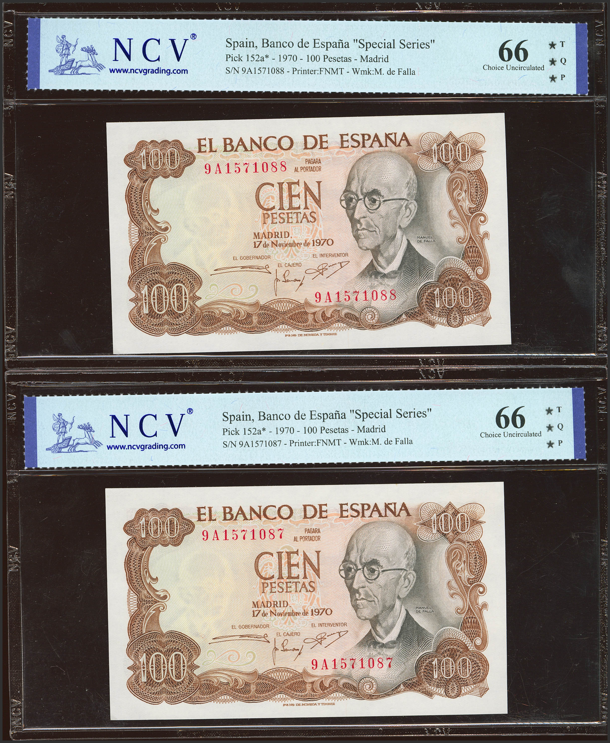 100 Pesetas. 17 de Noviembre de 1970. Pareja correlativa. Serie especial 9A. (Edifil 2023: 472d, Pick: 152a*). Apresto original. SC. Encapsulados NCV66TQP, ambos.