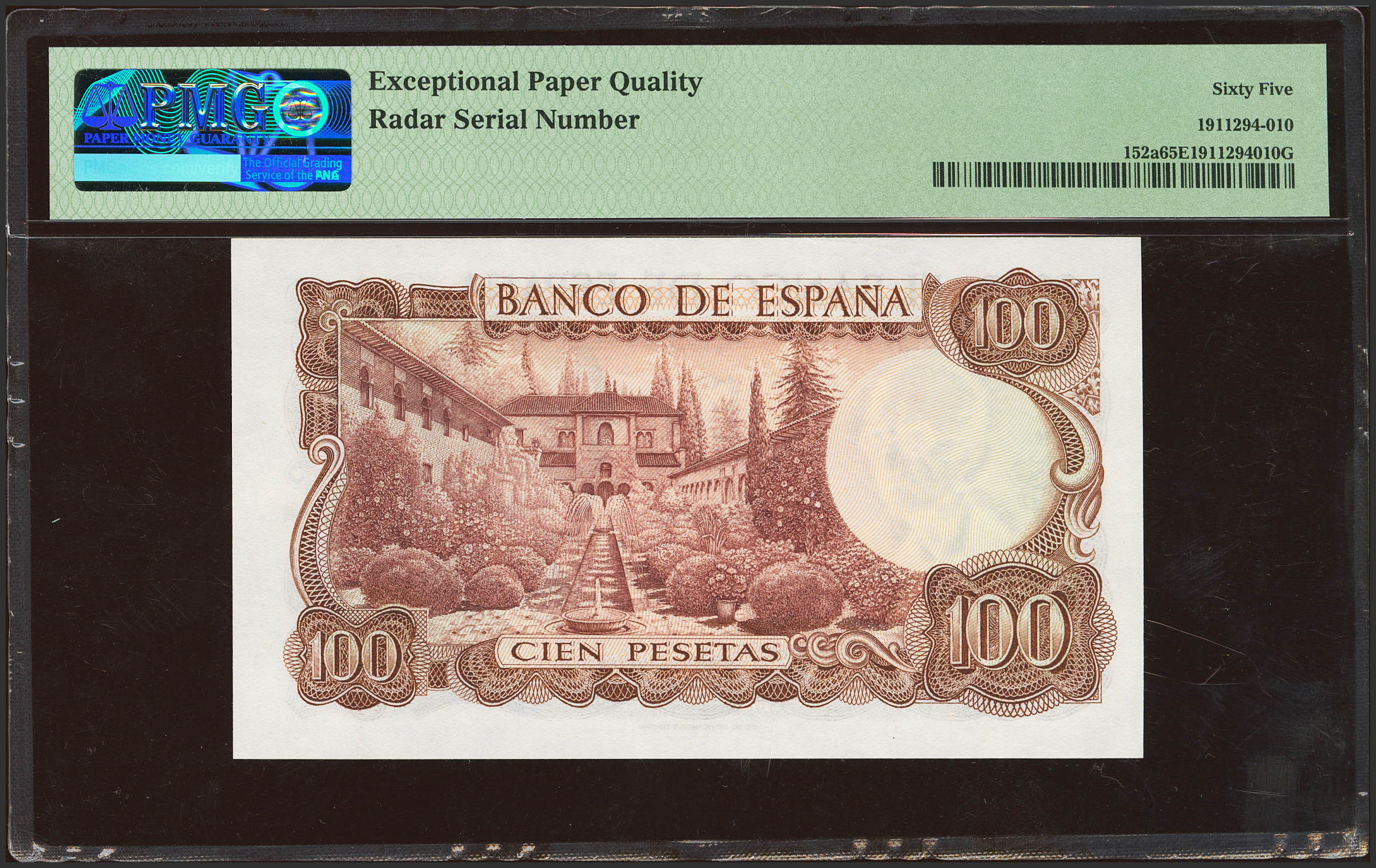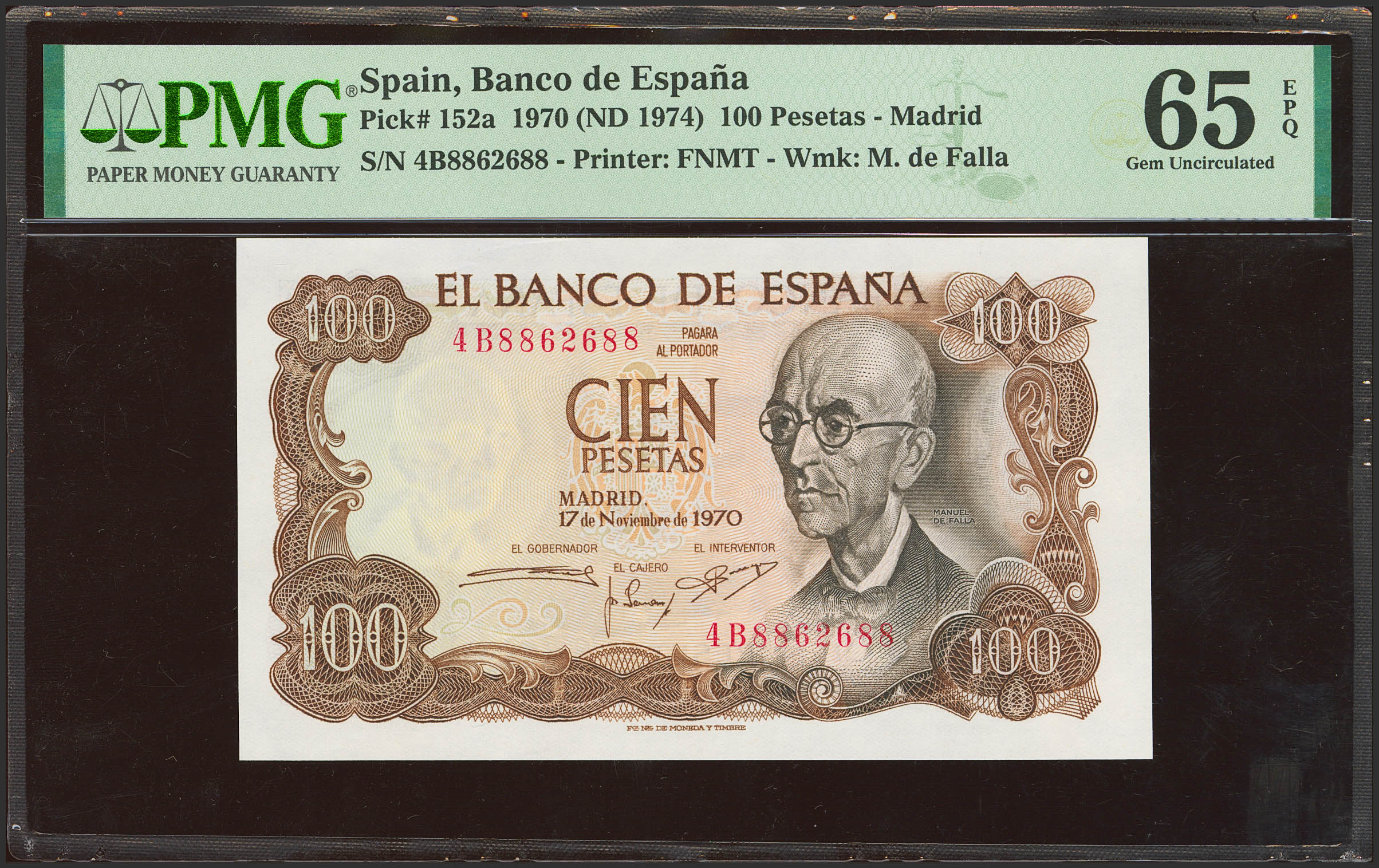 100 Pesetas. 17 de Noviembre de 1970. Serie 4B y numeración capicúa. (Edifil 2023: 472b, Pick: 152a). Inusual, apresto original. SC. Encapsulado PMG65EPQ.
