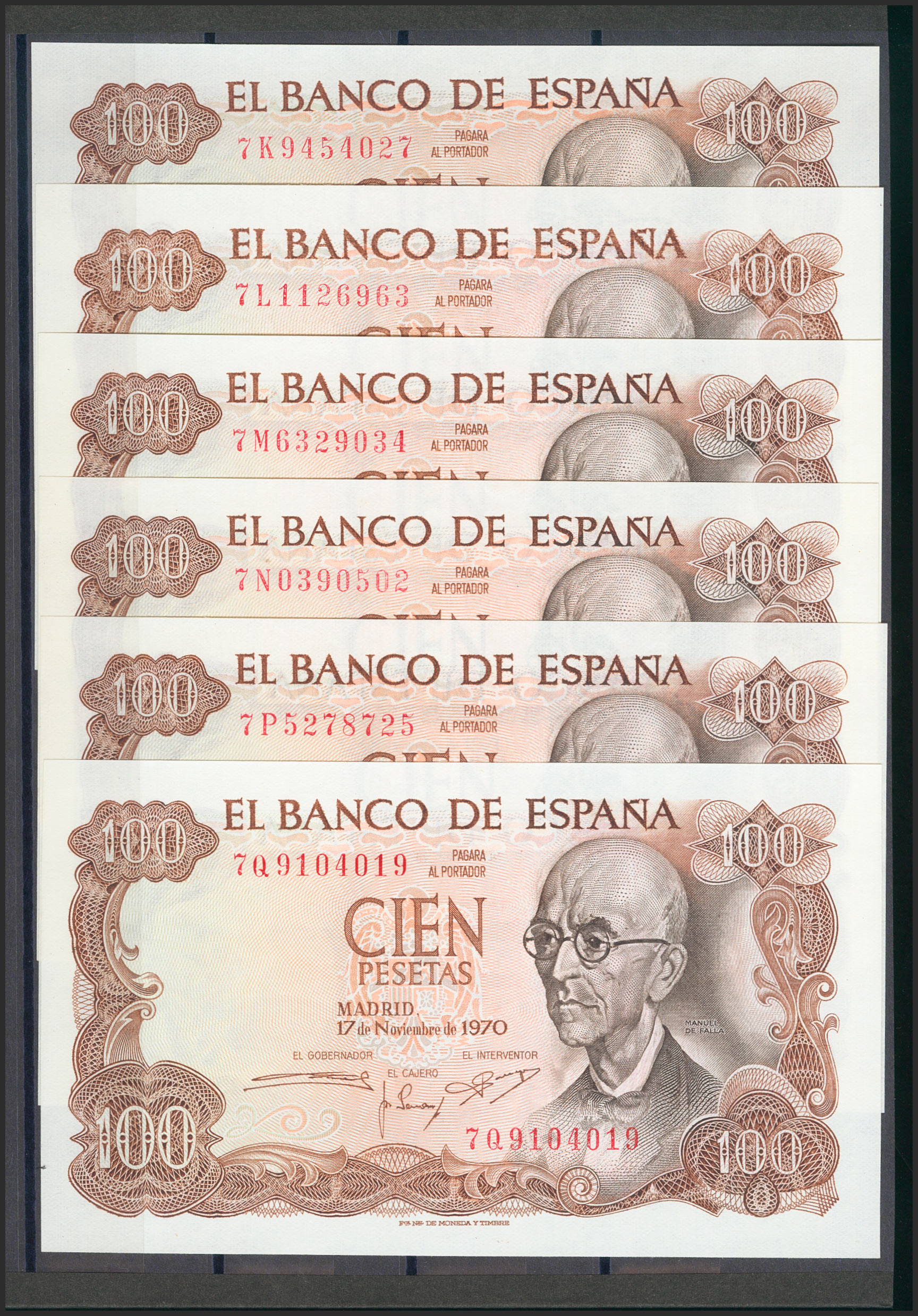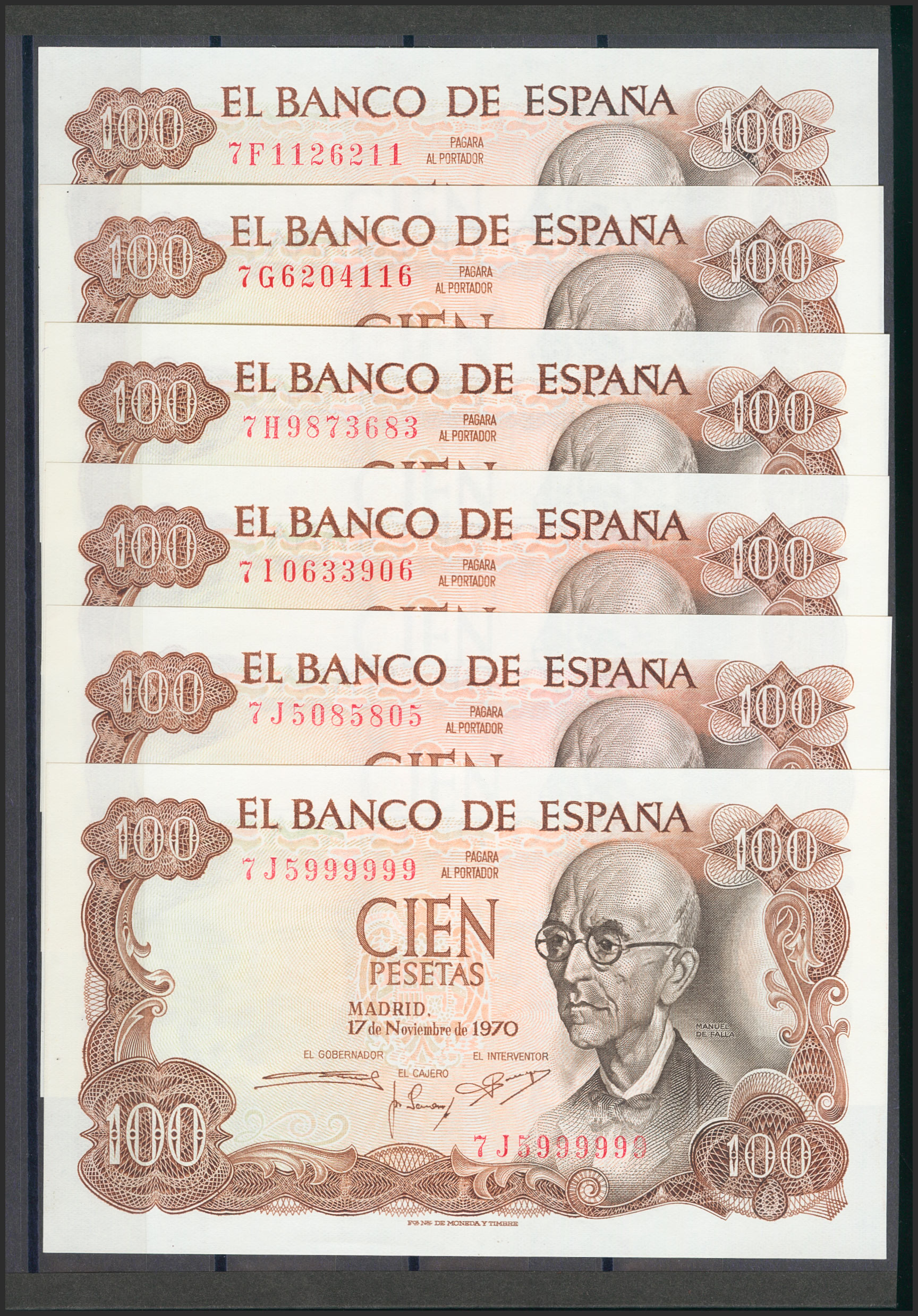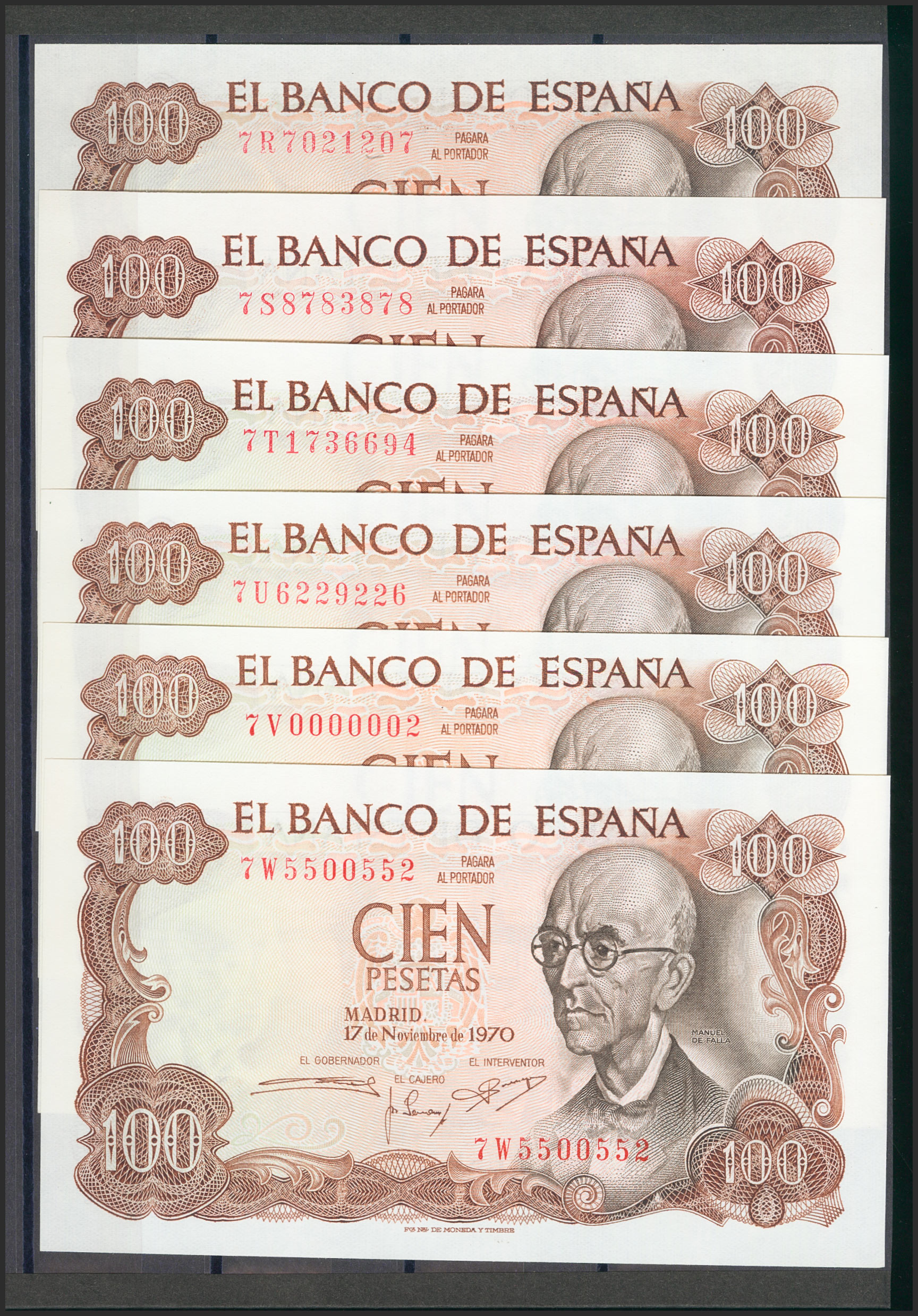 Precioso e interesante conjunto de 24 billetes de 100 Pesetas emitidos el 17 de Noviembre de 1970, incluyendo todas las letras de la octava emisión, última de todas las emitidas (7A, 7B, 7C, 7D, 7E (hay dos de esta serie con las numeraciones 7E6000000 y 7E5999999), 7F capicúa, 7G, 7H, 7I, 7J (hay dos de esta serie con las numeraciones 7J5085805 y 7J5999999, uno de ellos capicúa), 7K, 7L, 7M, 7N, 7P capicúa, 7Q capicúa, 7R capicúa, 7S capicúa, 7T, 7U capicúa, 7V (numeración V0000002) y 7W. (Edifil 2017: 472c). Raro conjunto y de muy buena calidad, todos los billetes presentan apresto original (el conjunto debe ser considerado a todos los efectos de máxima calidad especialmente en un conjunto así, es posible que haya uno a lo sumo dos billetes en calidad SC- y ni tan siquiera eso pero preferimos optar por la prudencia, en nuestra opinión es algo absolutamente despreciable). SC/SC-.