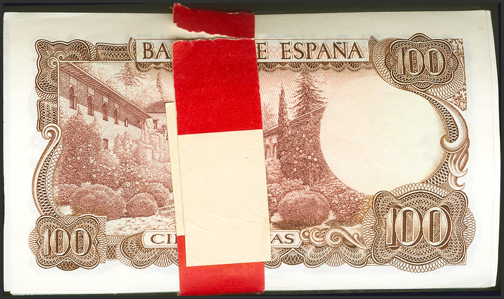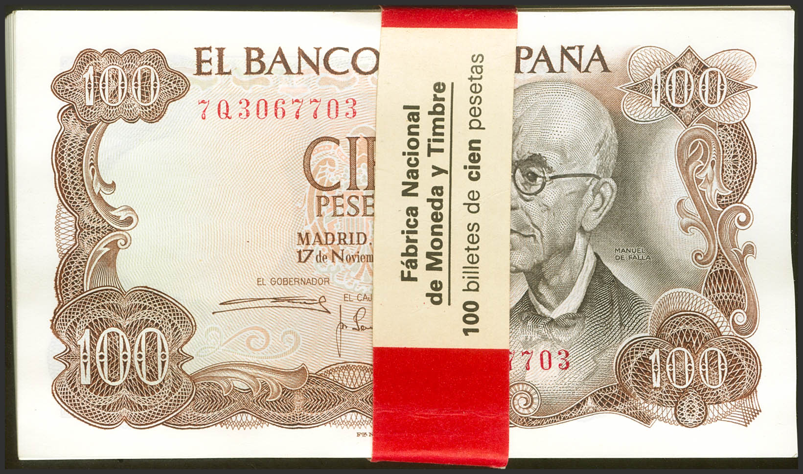 Conjunto de 98 billetes de 100 Pesetas emitidos el 17 de Noviembre de 1970 de la serie 7Q, en "fajo a falta de 2" y con su precinto original. (Edifil 2023: 472c). SC/SC--.