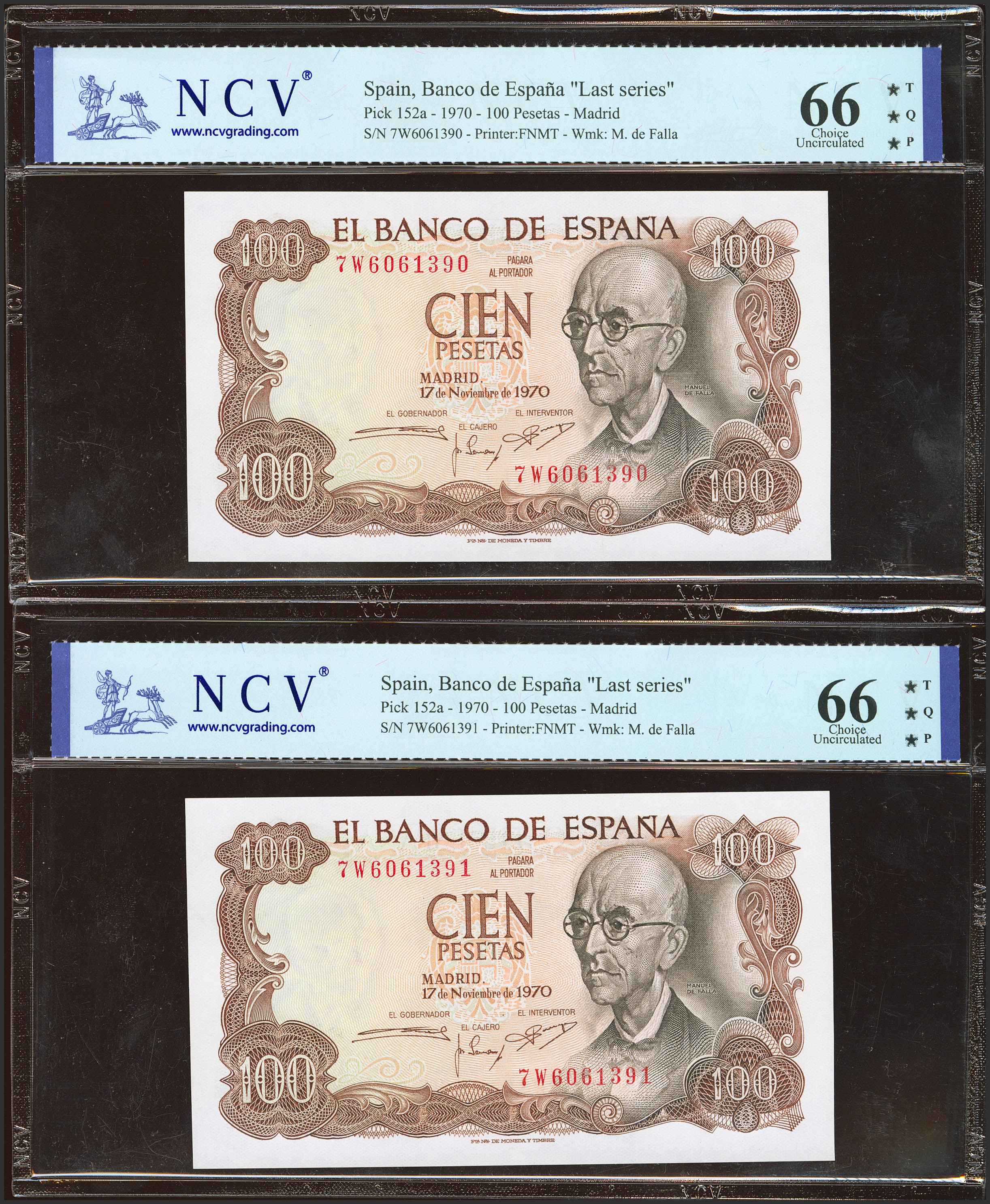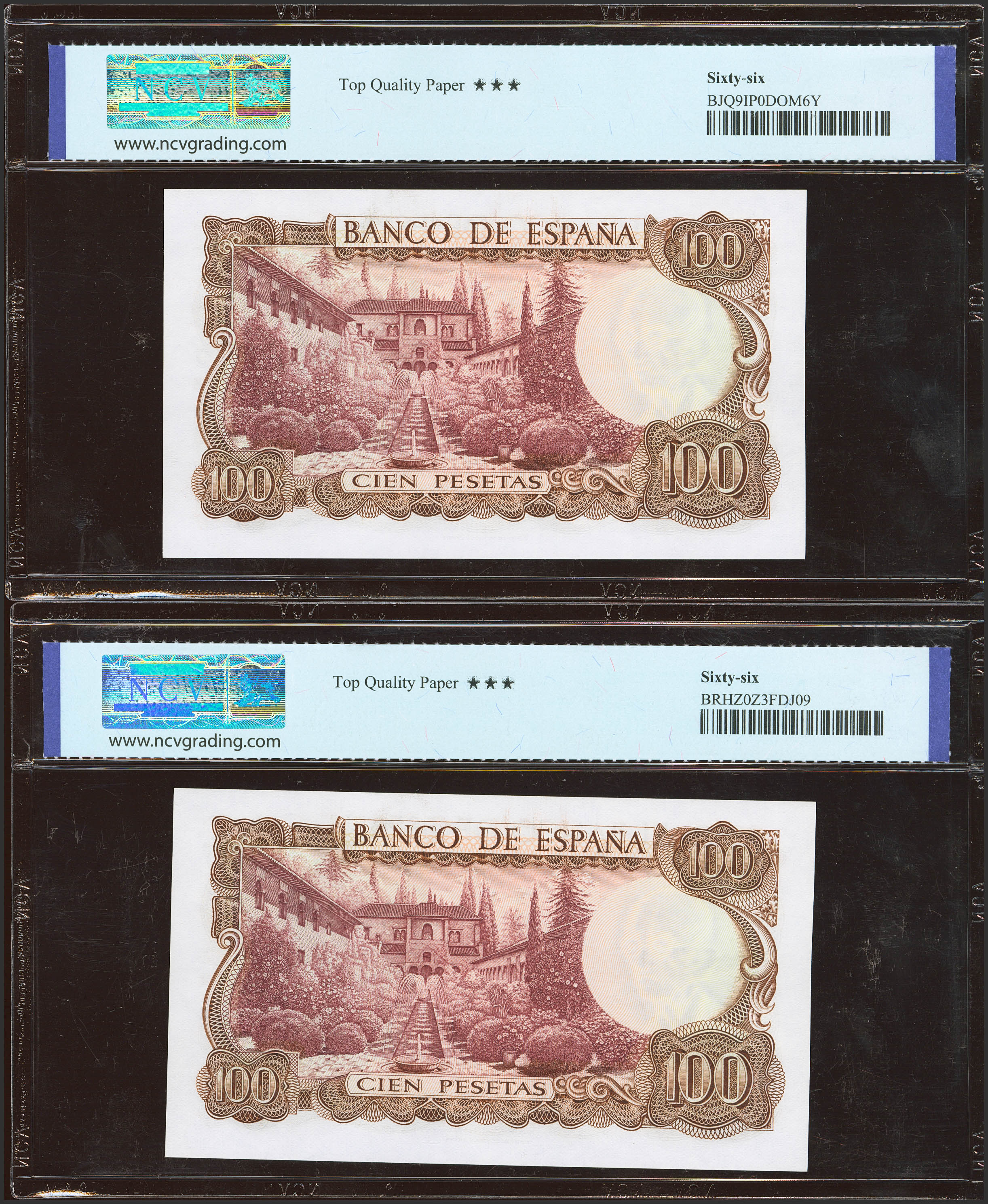 100 Pesetas. 17 de Noviembre de 1970. Pareja correlativa. Serie 7W, última serie emitida. (Edifil 2023: 472c, Pick: 152a). Apresto original. SC. Encapsulados NCV66TQP, ambos.