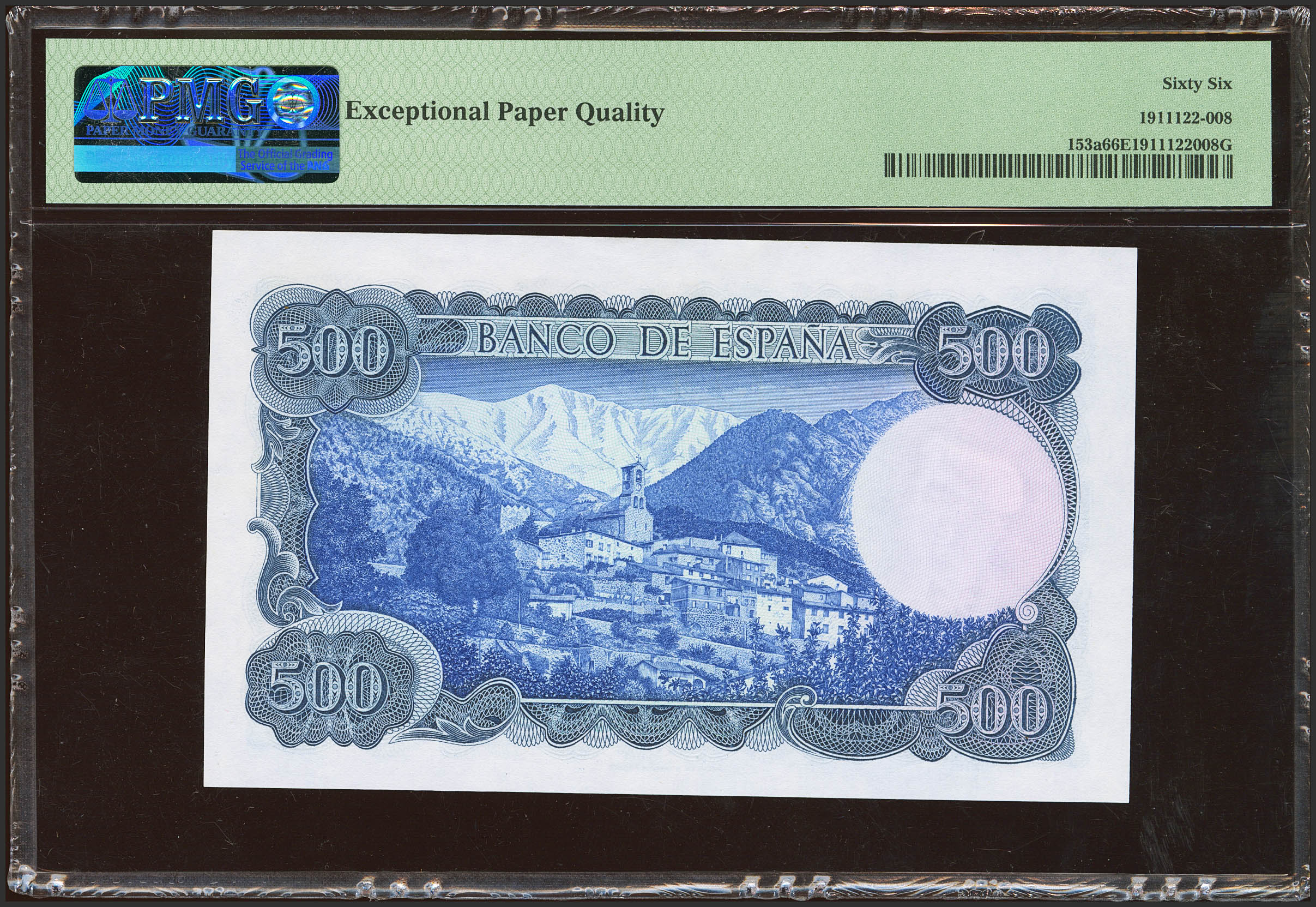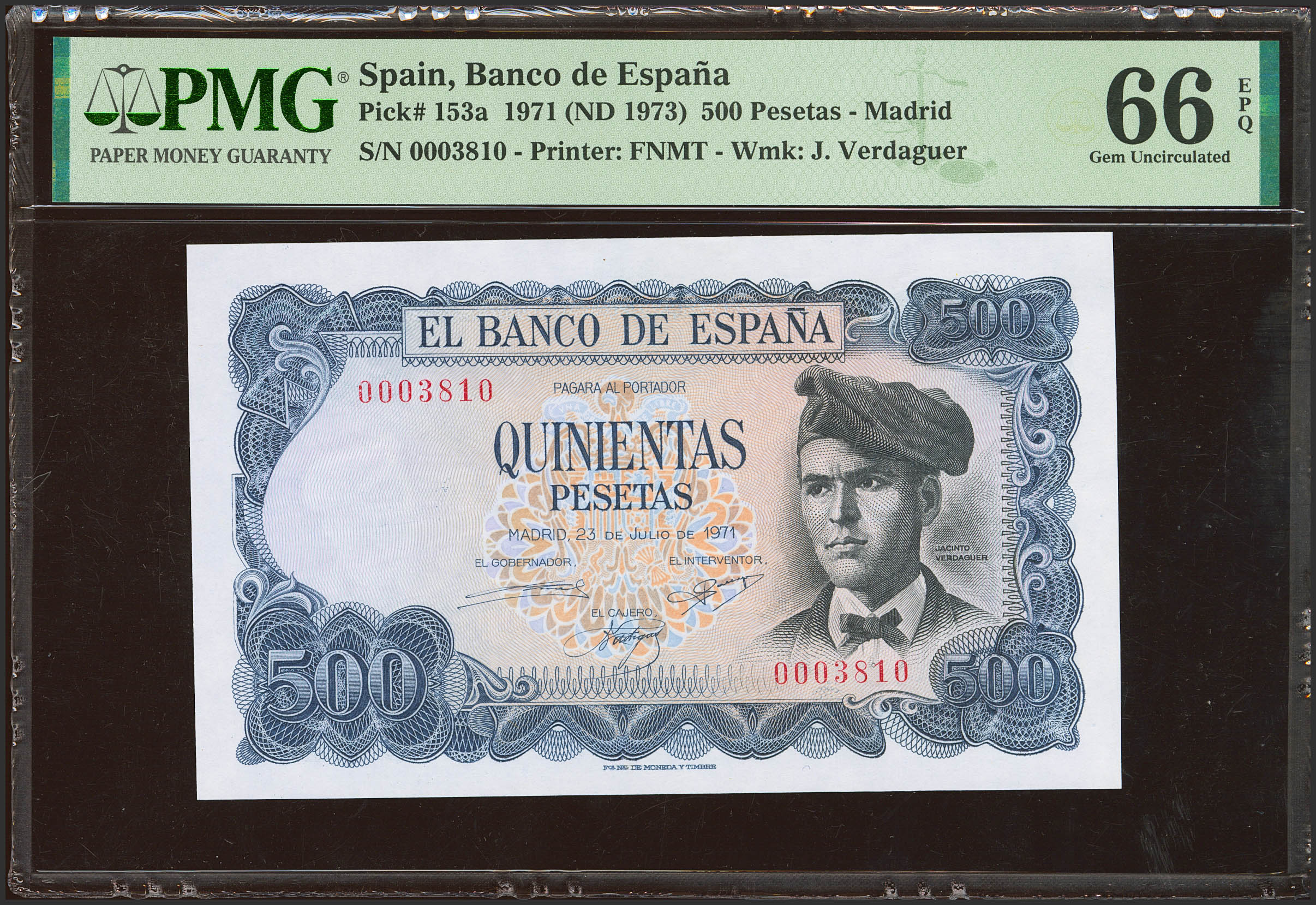 500 Pesetas. 23 de Julio de 1971. Sin serie y numeración bajísima. (Edifil 2021: 473, Pick: 153a). Inusual en esta calidad, apresto original. Encapsulado PMG66EPQ.