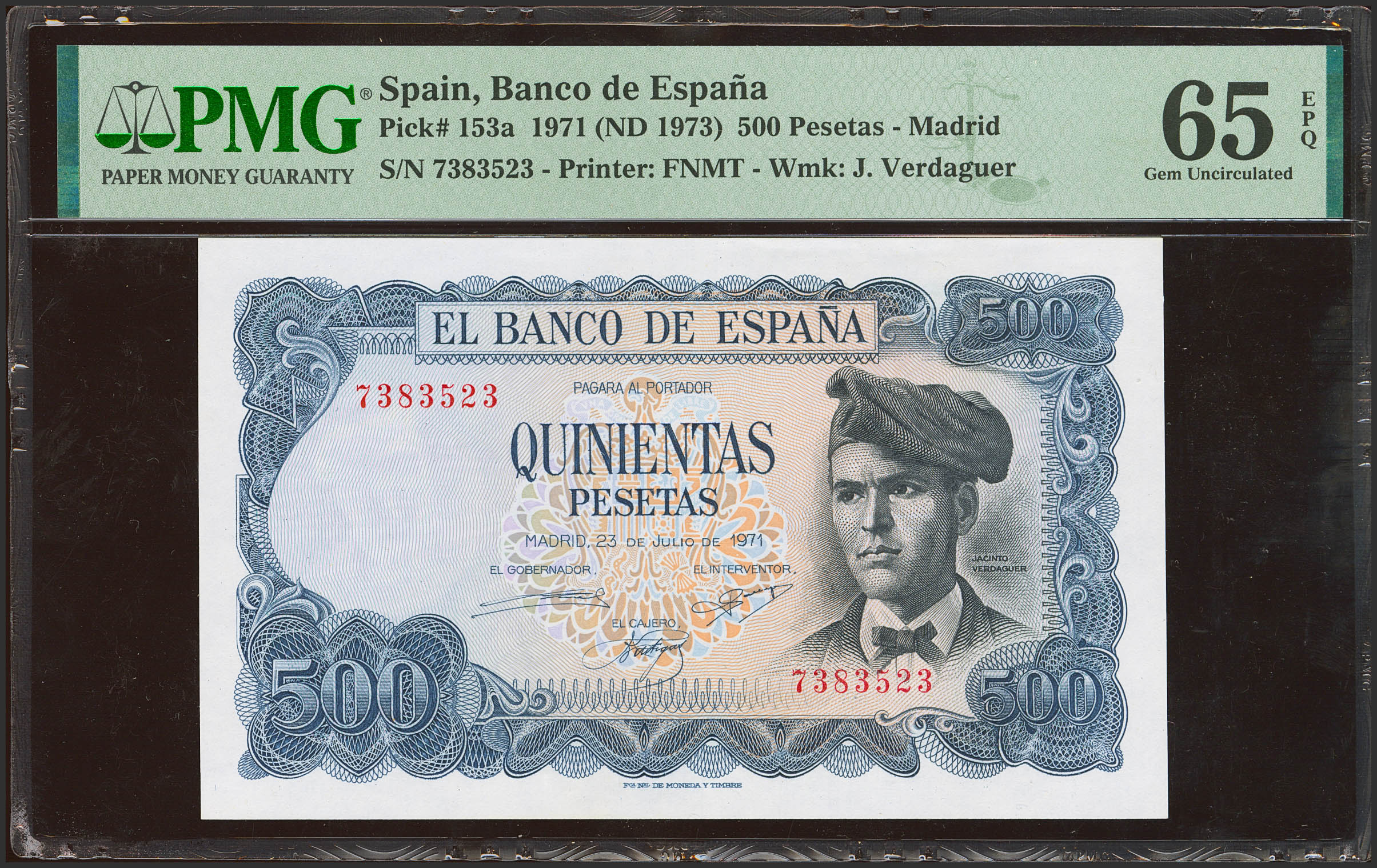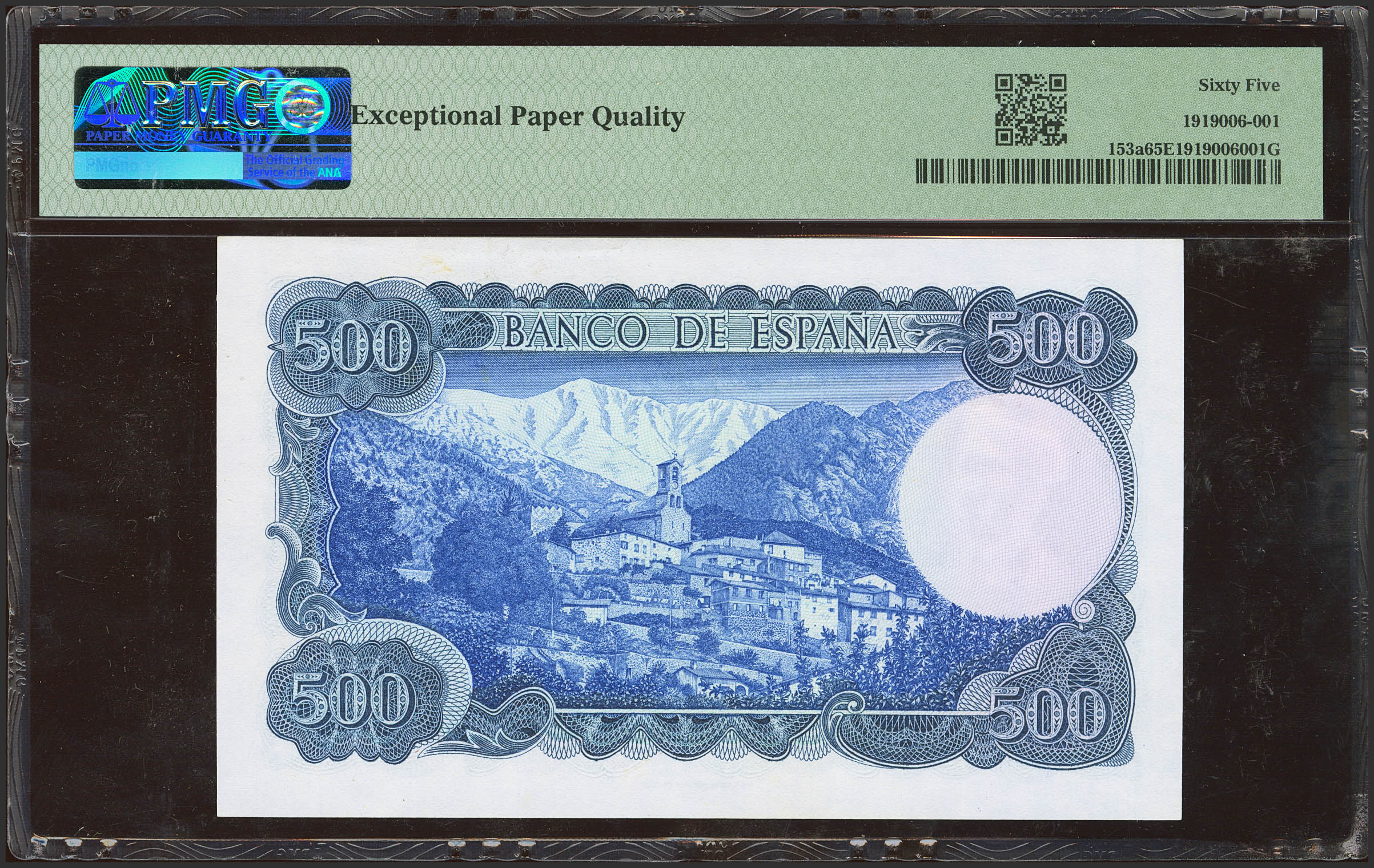 500 Pesetas. 23 de Julio de 1971. Sin serie. (Edifil 2023: 473, Pick: 153a). Inusual en esta excepcional calidad, apresto original. Encapsulado PMG65EPQ.