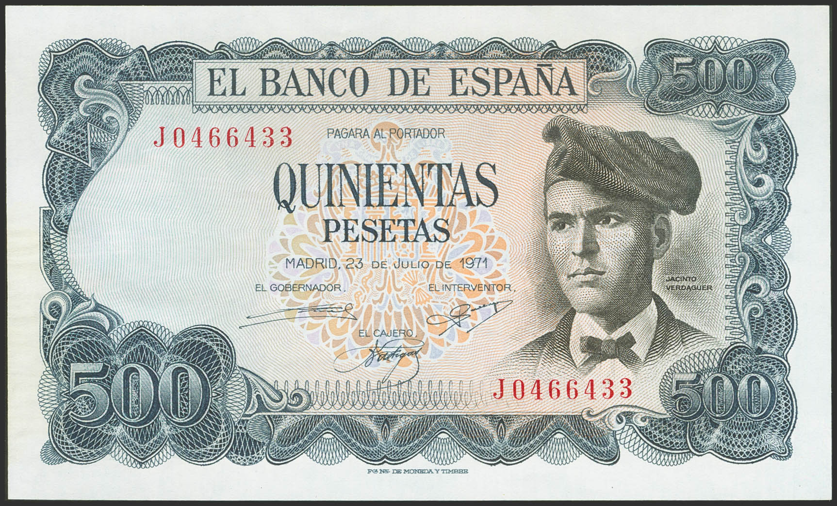 500 Pesetas. 23 de Julio de 1971. Serie J. (Edifil 2023: 473a). Apresto original. SC-.