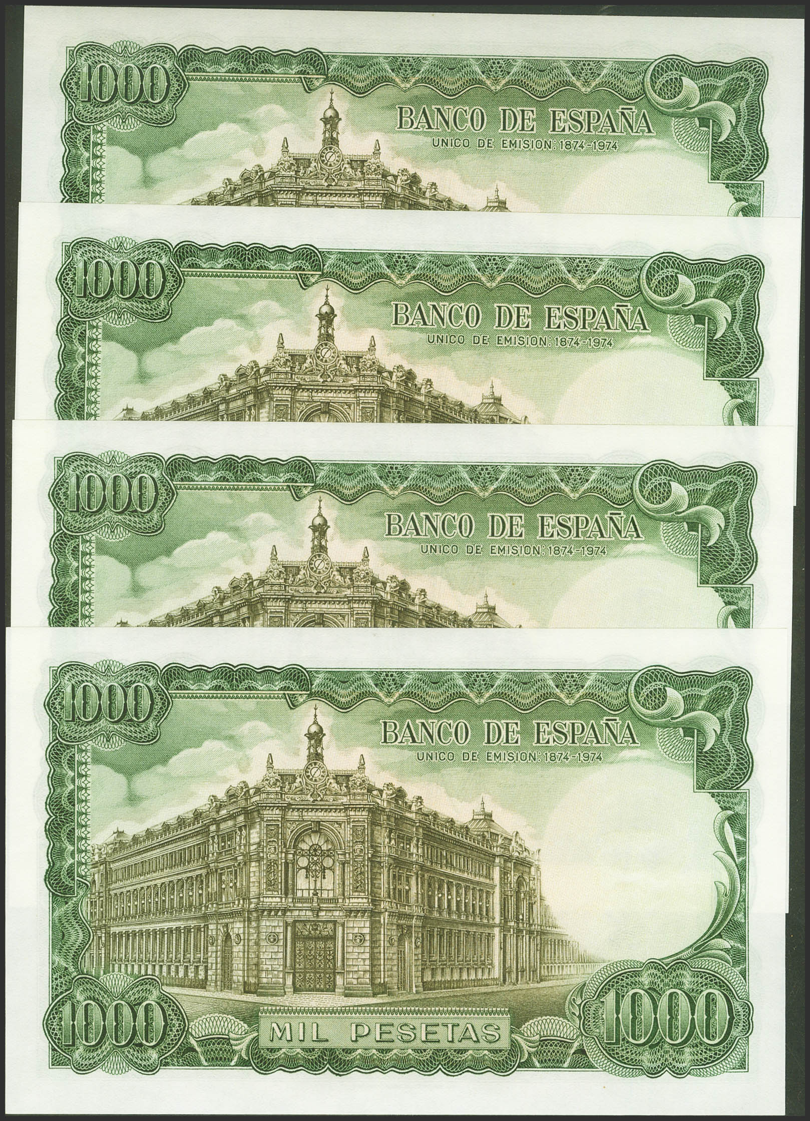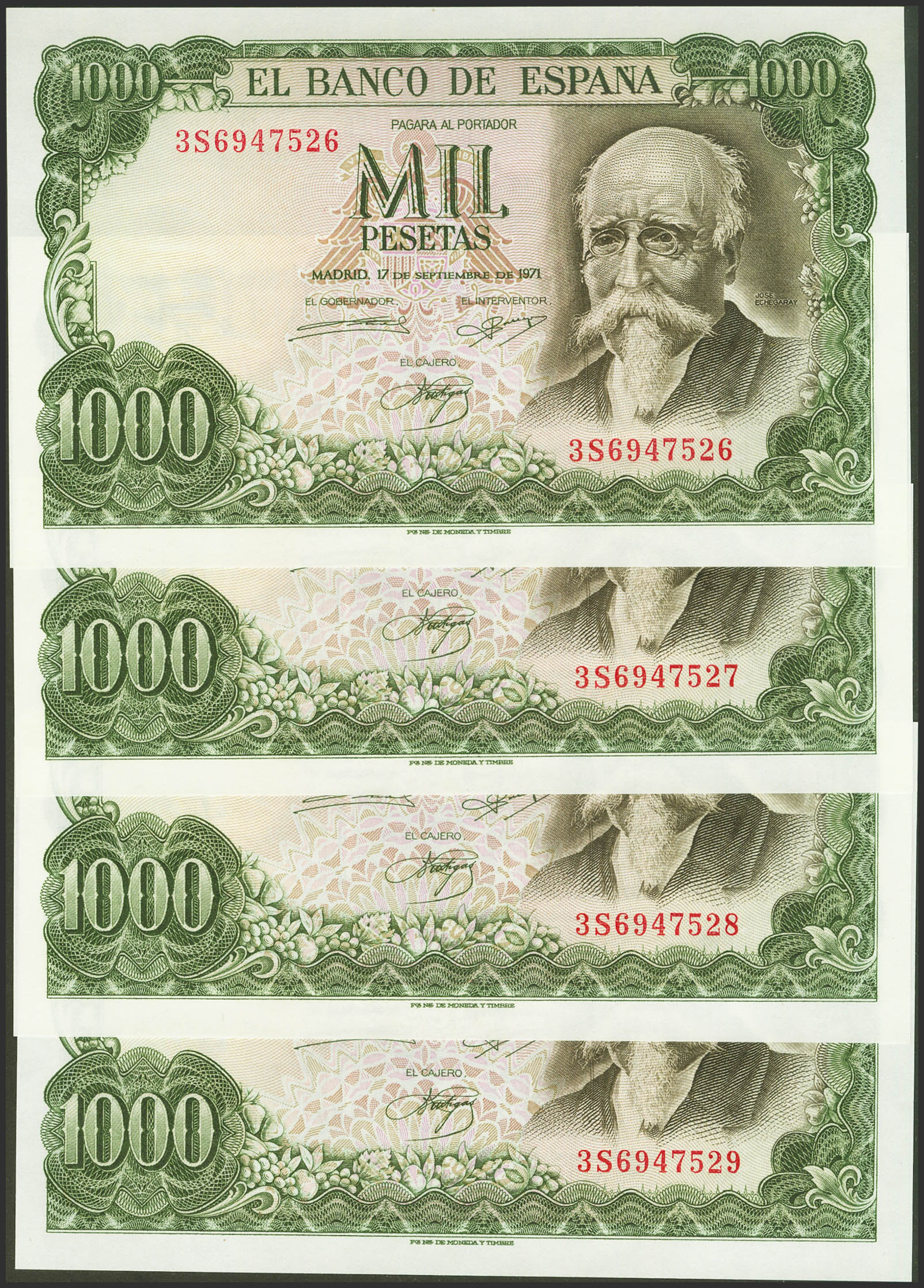 Conjunto de 4 billetes correlativos de 1000 Pesetas emitidos el 17 de Septiembre de 1971, todos ellos con la serie 3S (Edifil 2021: 474c), conservando su apresto original. SC.